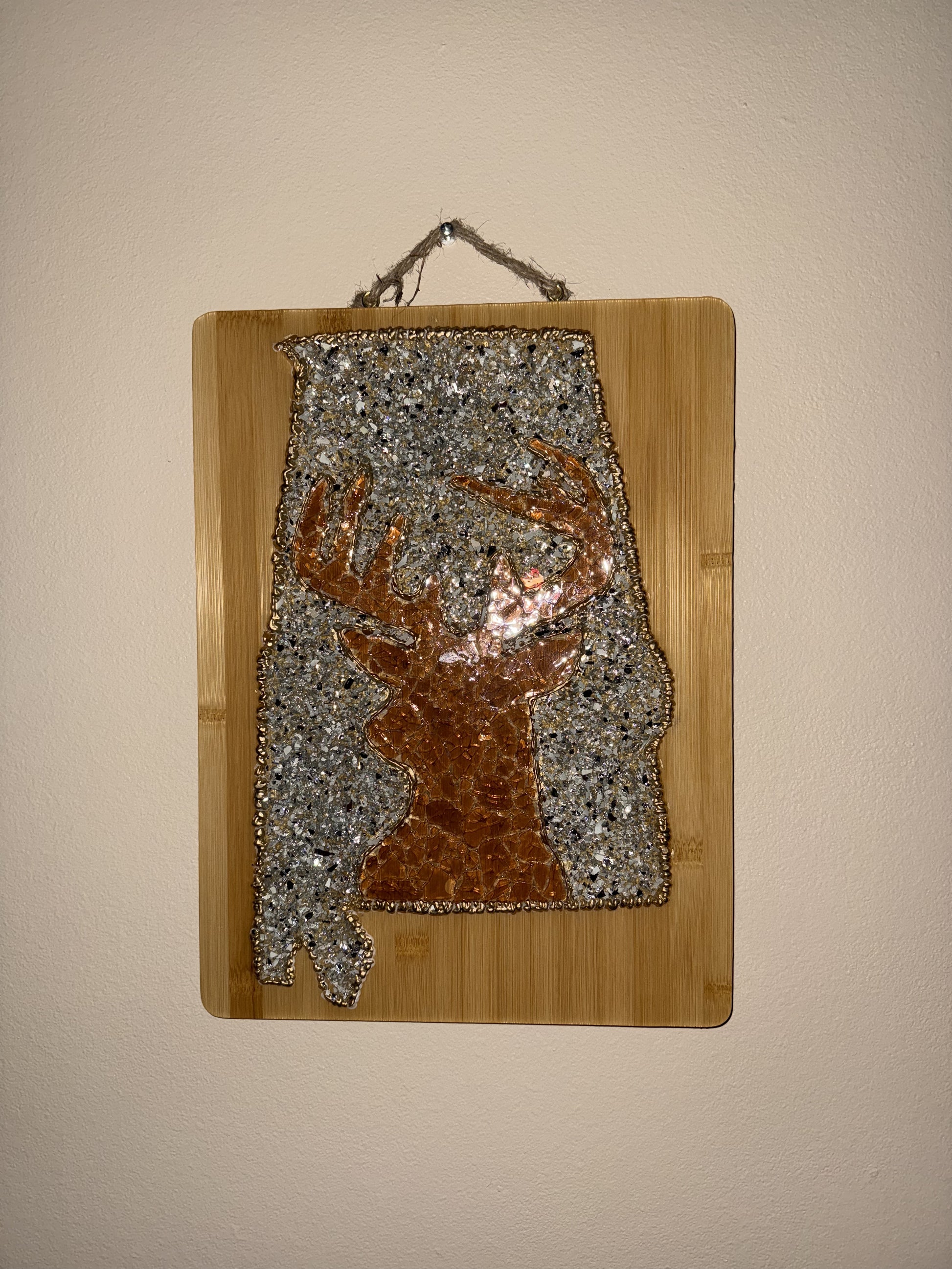 This beautiful ALABAMA BIG BUCK was created with mixed media materials including glass and sealed with epoxy resin.
