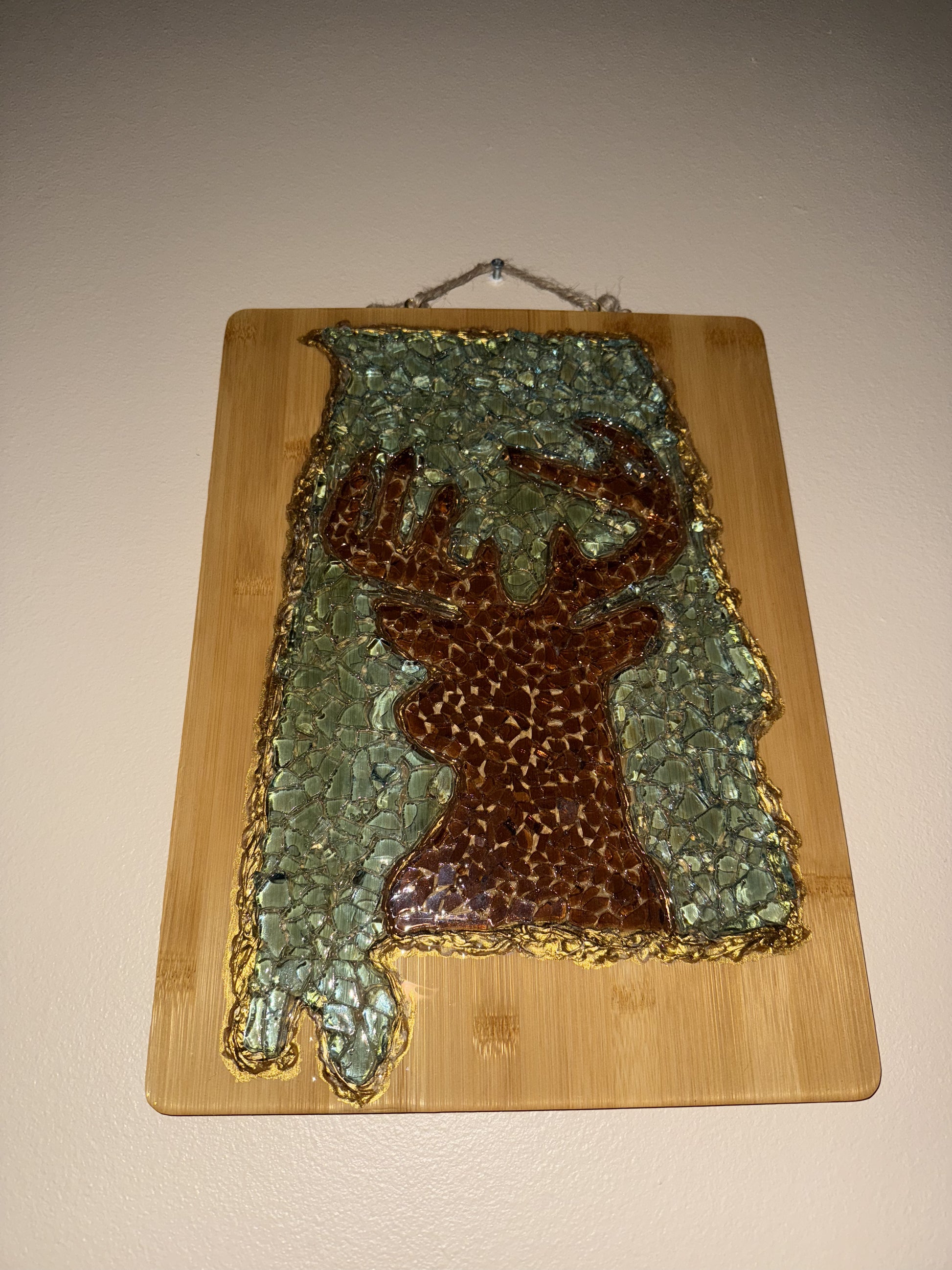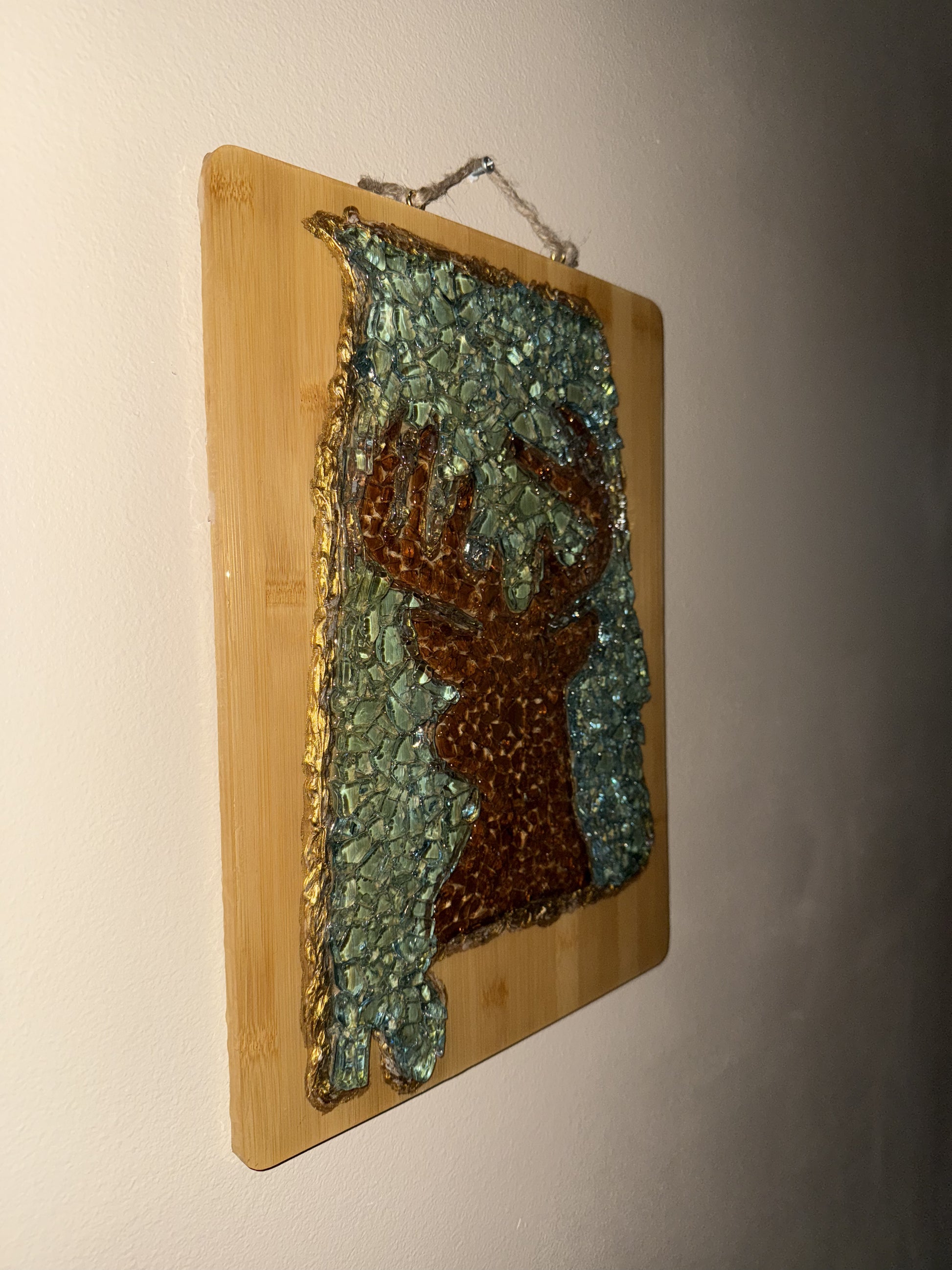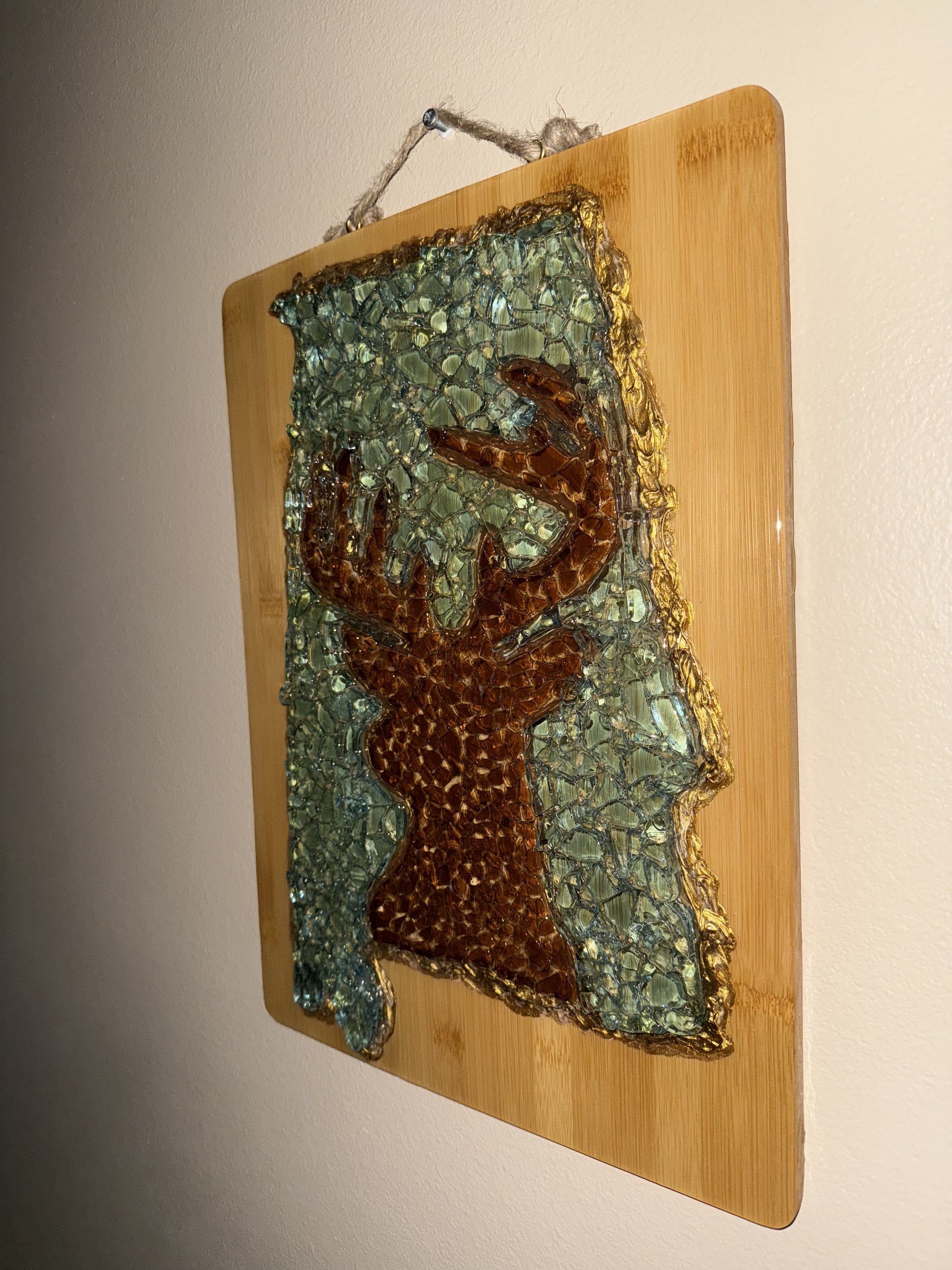 This beautiful butterfly was created with mixed media materials including glass and sealed with epoxy resin.
