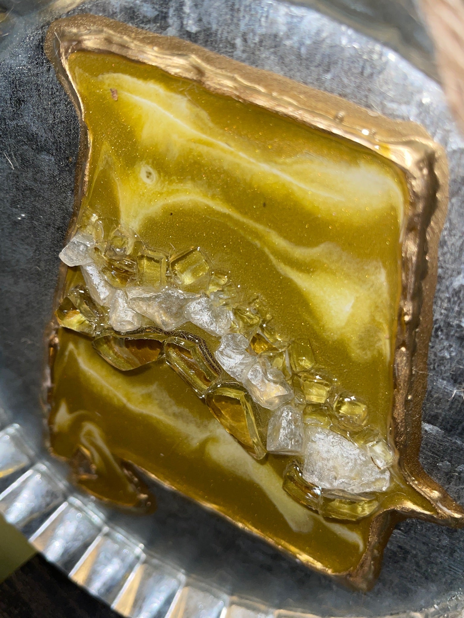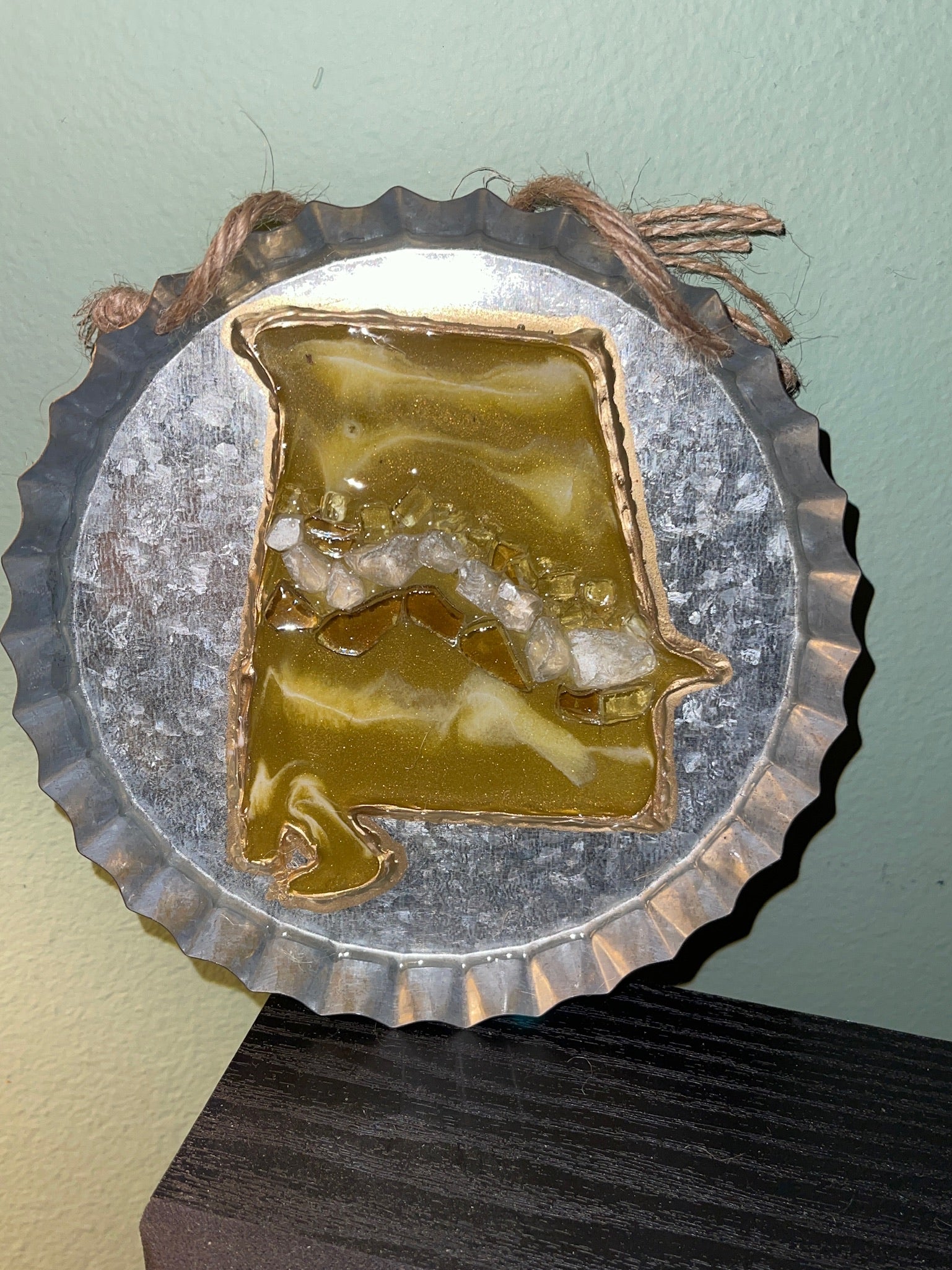 This beautiful State of Alabama is outline with 14K Gold & hand cut glass. It is centered inside a 6 inch round galvanized metal bottle cap and it is ready to hang for all your family and friends to admire. The inside of the state is made up of an epoxy pour and then the entire inside is sealed with epoxy resin.