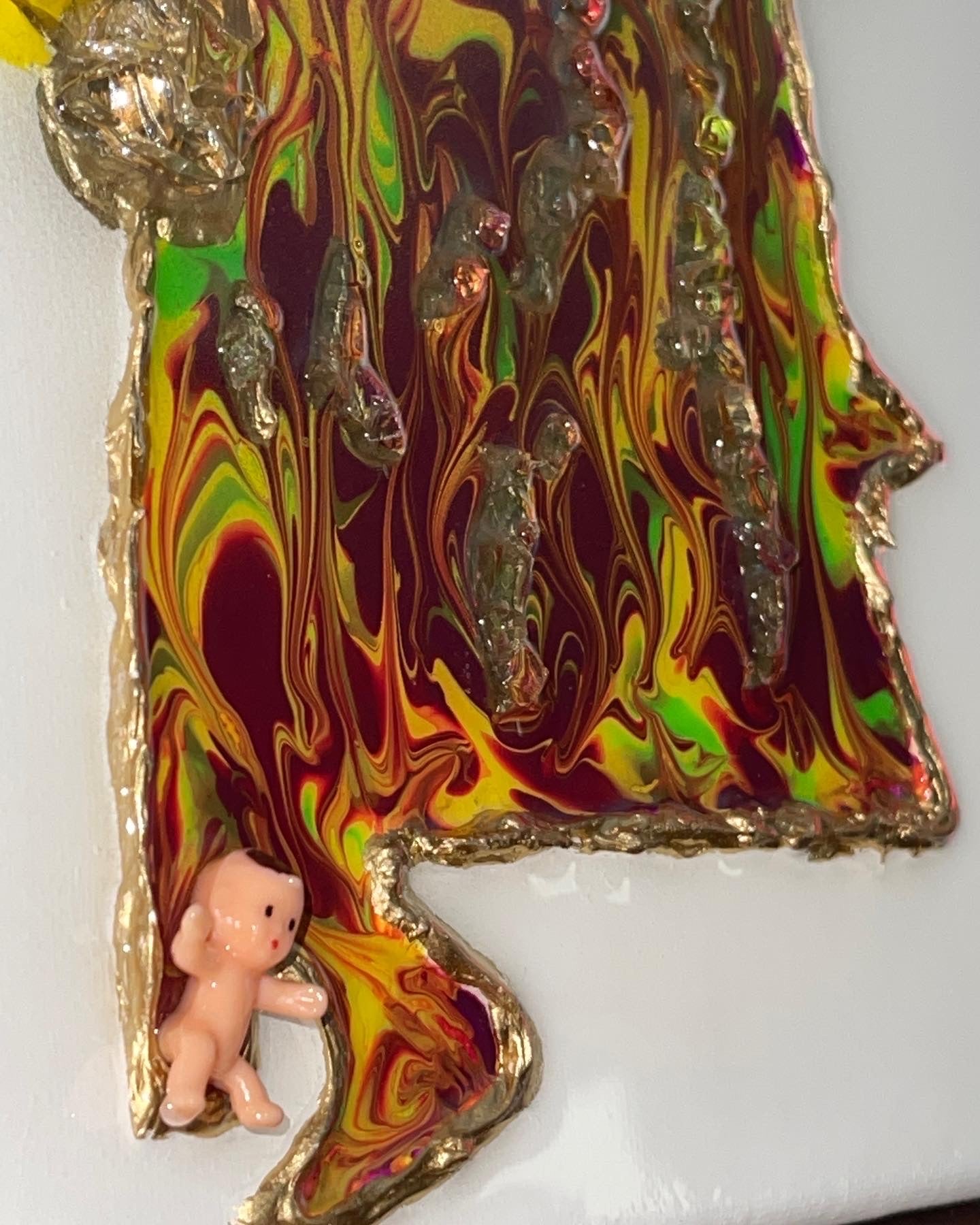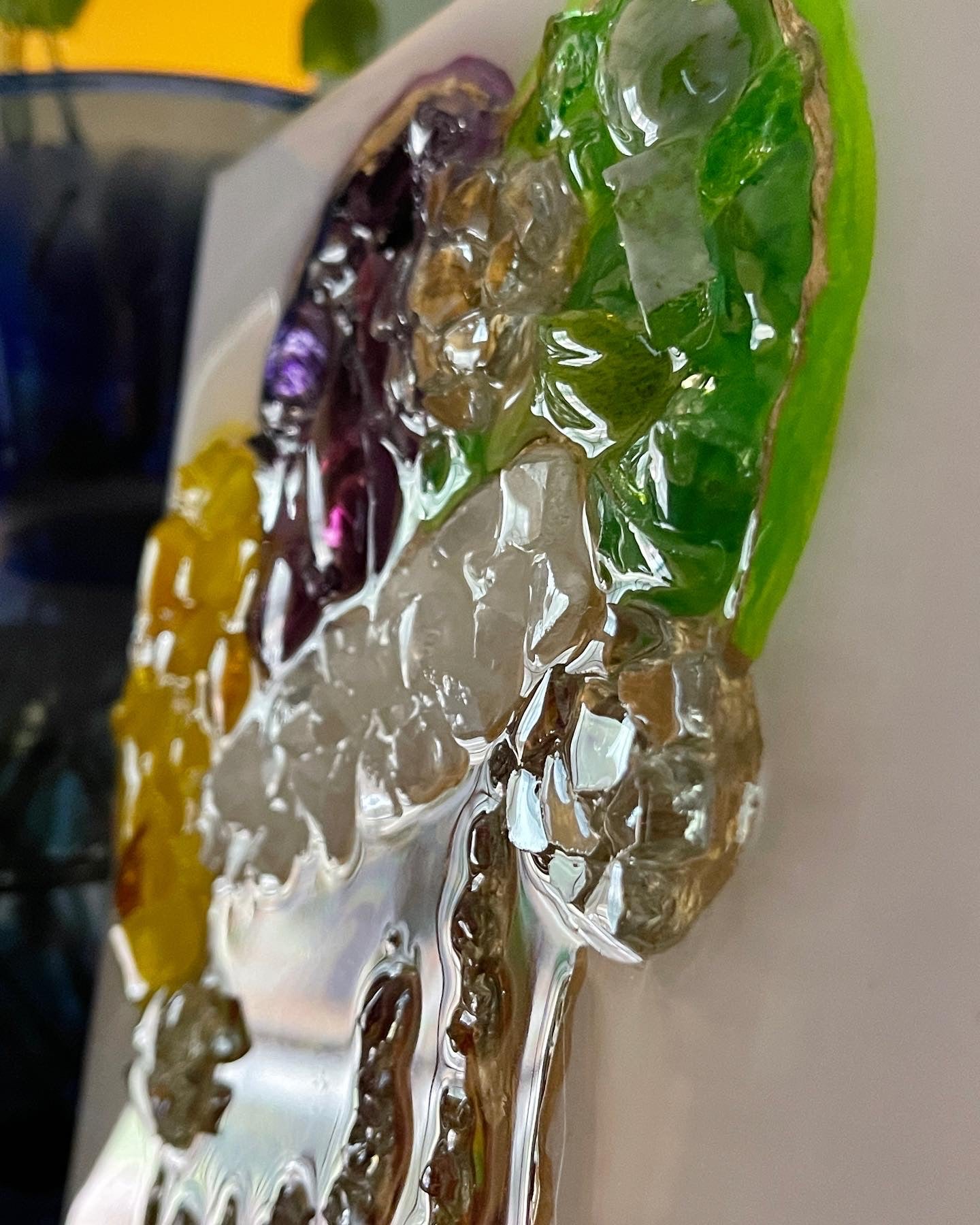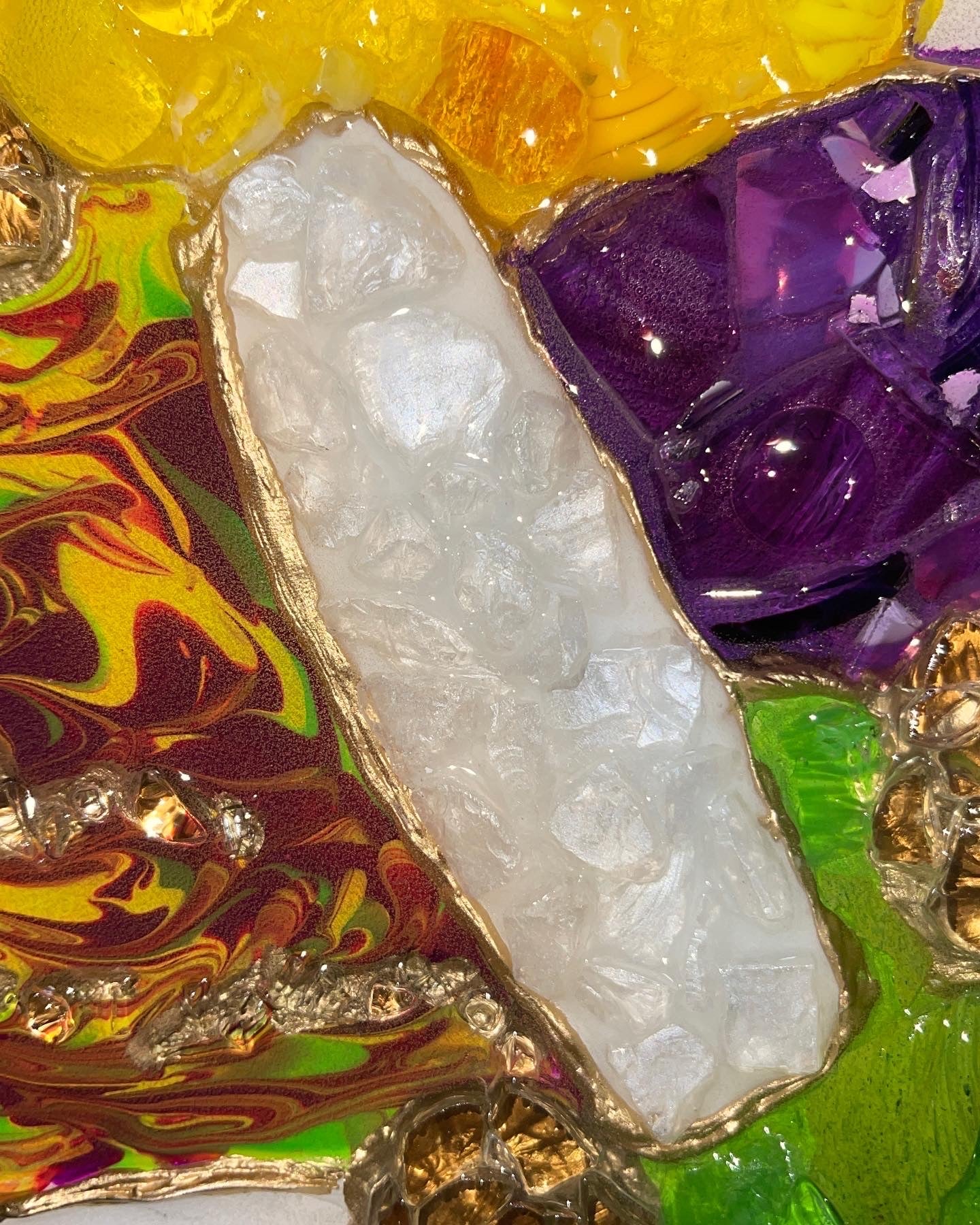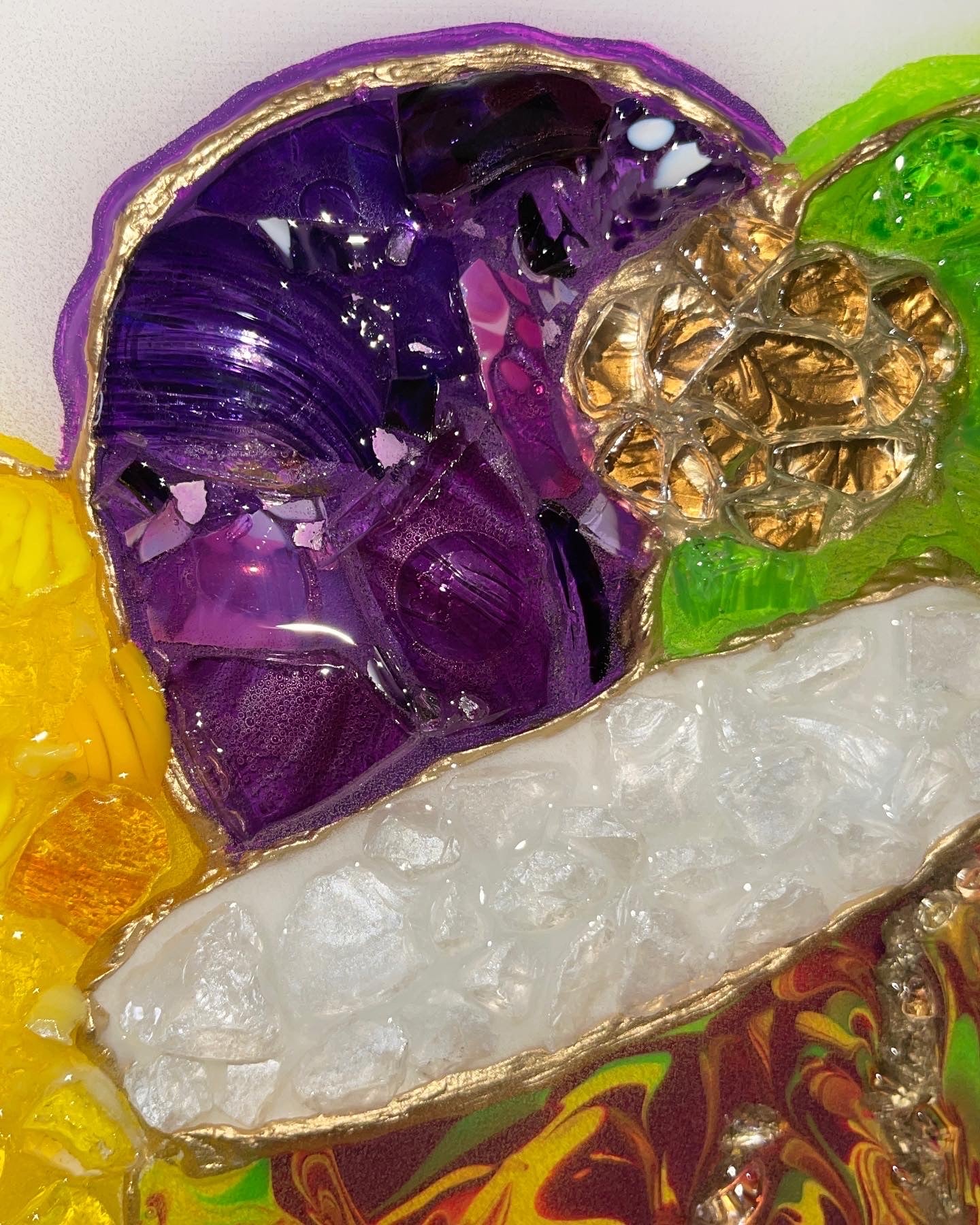 These entire piece is painted with acrylics, topped with hand cut glass, broken reflective glass, a few other embellishments and sealed with epoxy resin.
