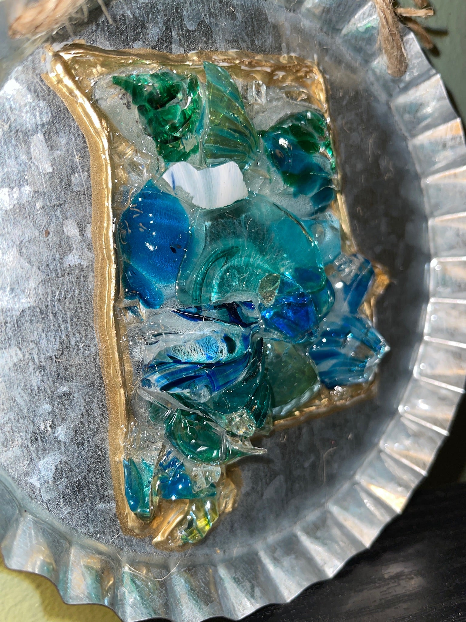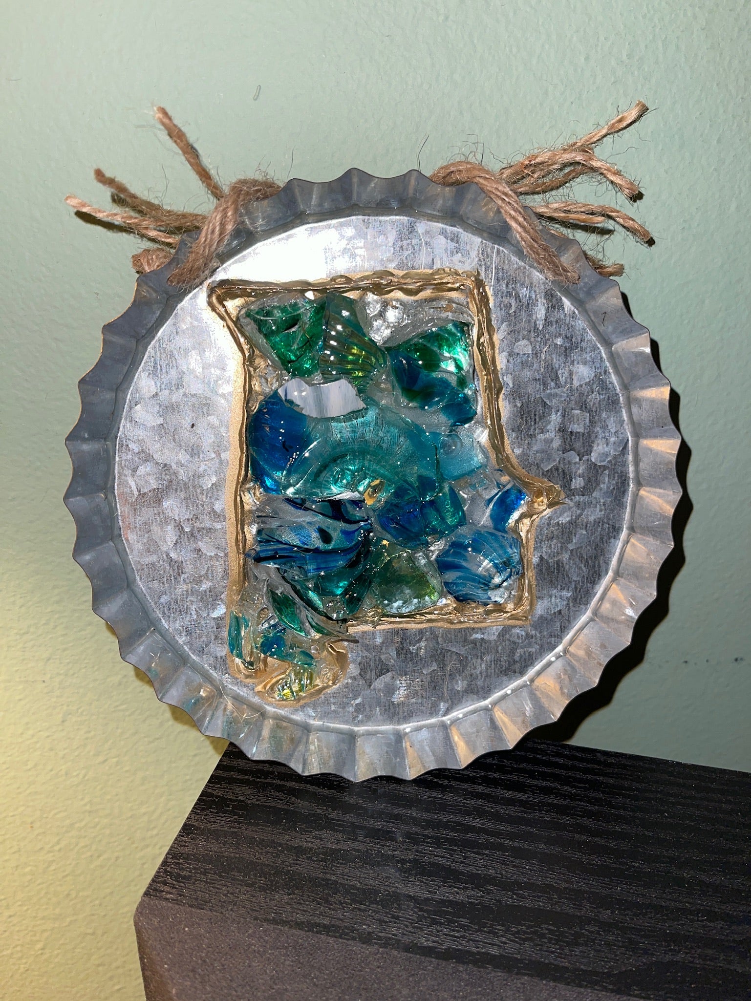 This beautiful State of Alabama is outline with 14K Gold & hand cut glass. It is centered inside a 6 inch round galvanized metal bottle cap and it is ready to hang for all your family and friends to admire. The entire inside is sealed with epoxy resin.