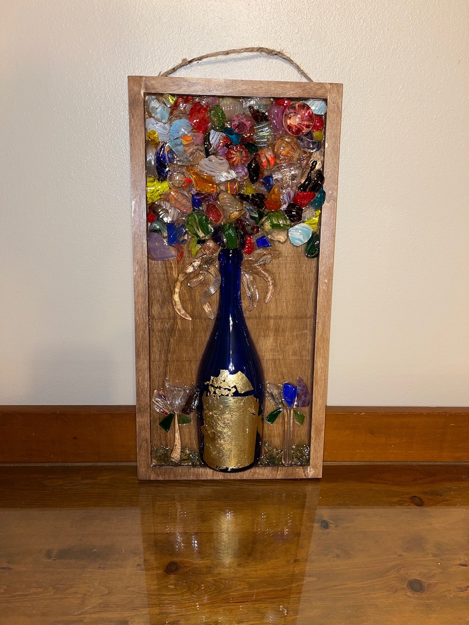 This beautiful flower bottle bouquet is on a birch wood cradled panel. All of the glass is inside the cradle and sealed with epoxy resin.