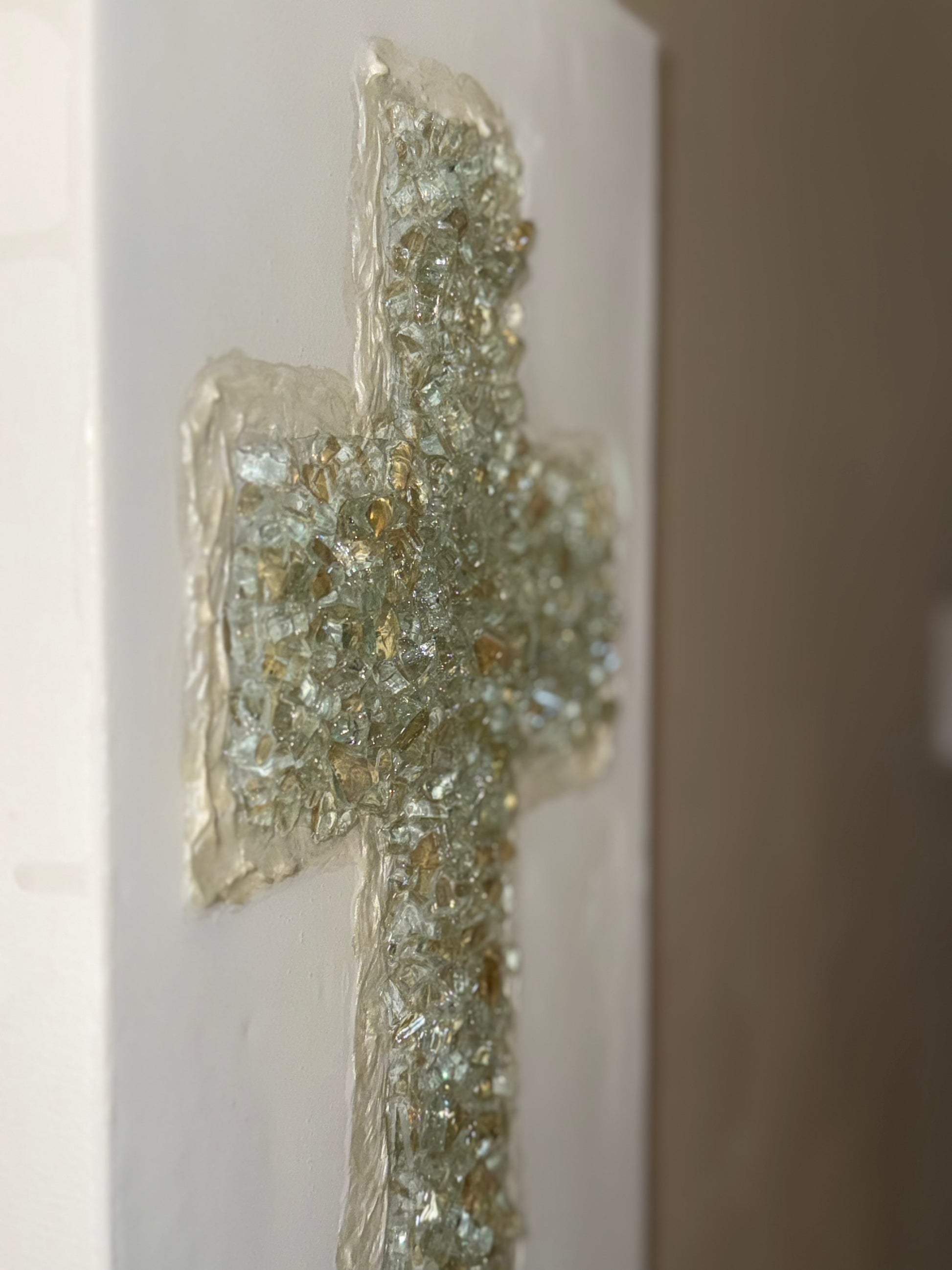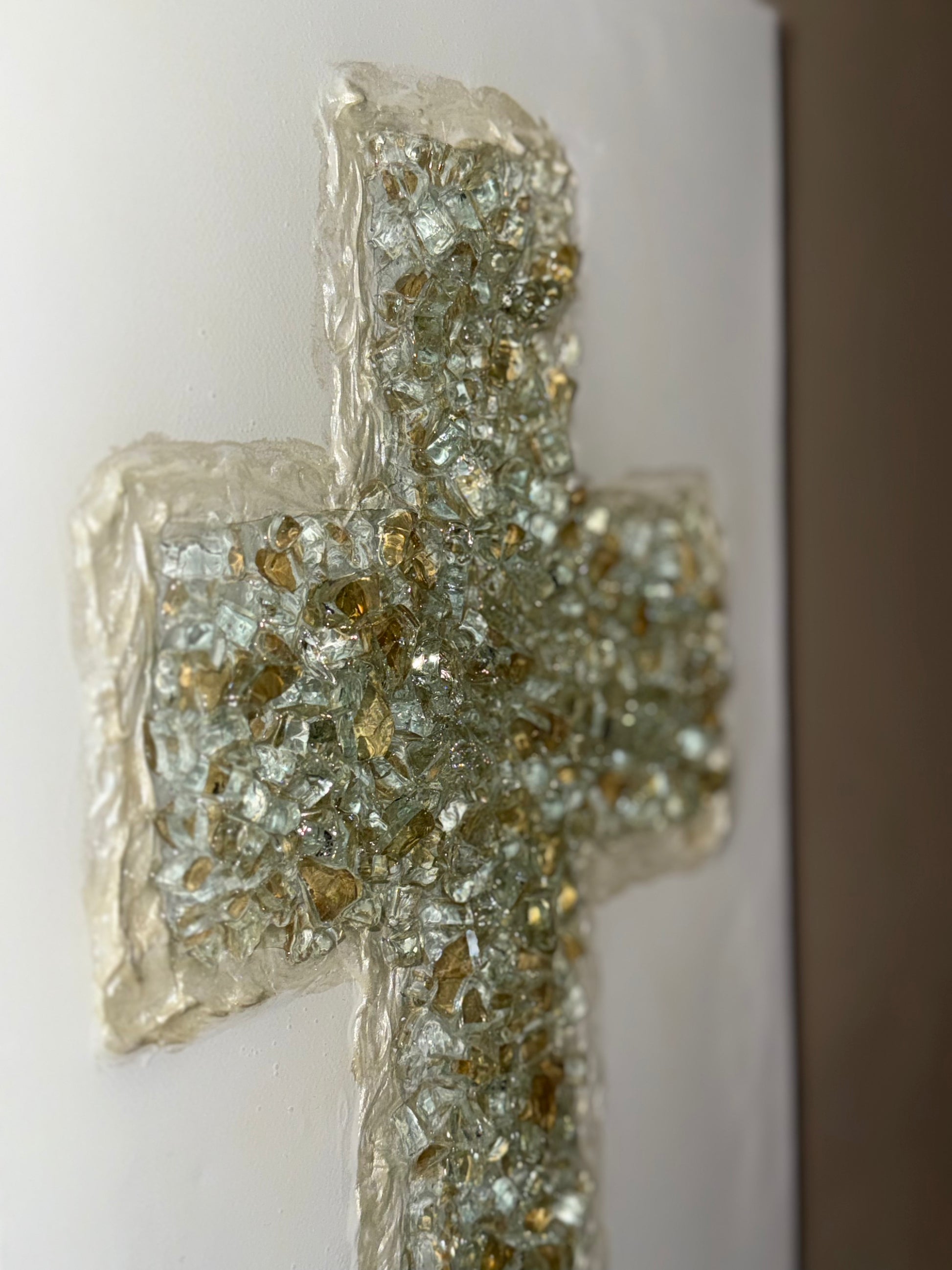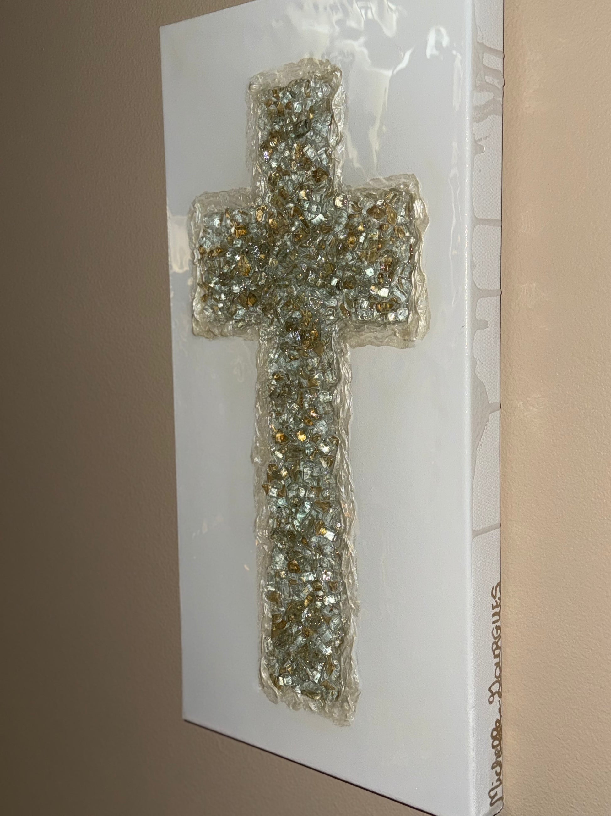 This beautiful Christmas Cross is on a 1.5" stretched canvas with crushed glass and the entire piece has been sealed with epoxy resin.