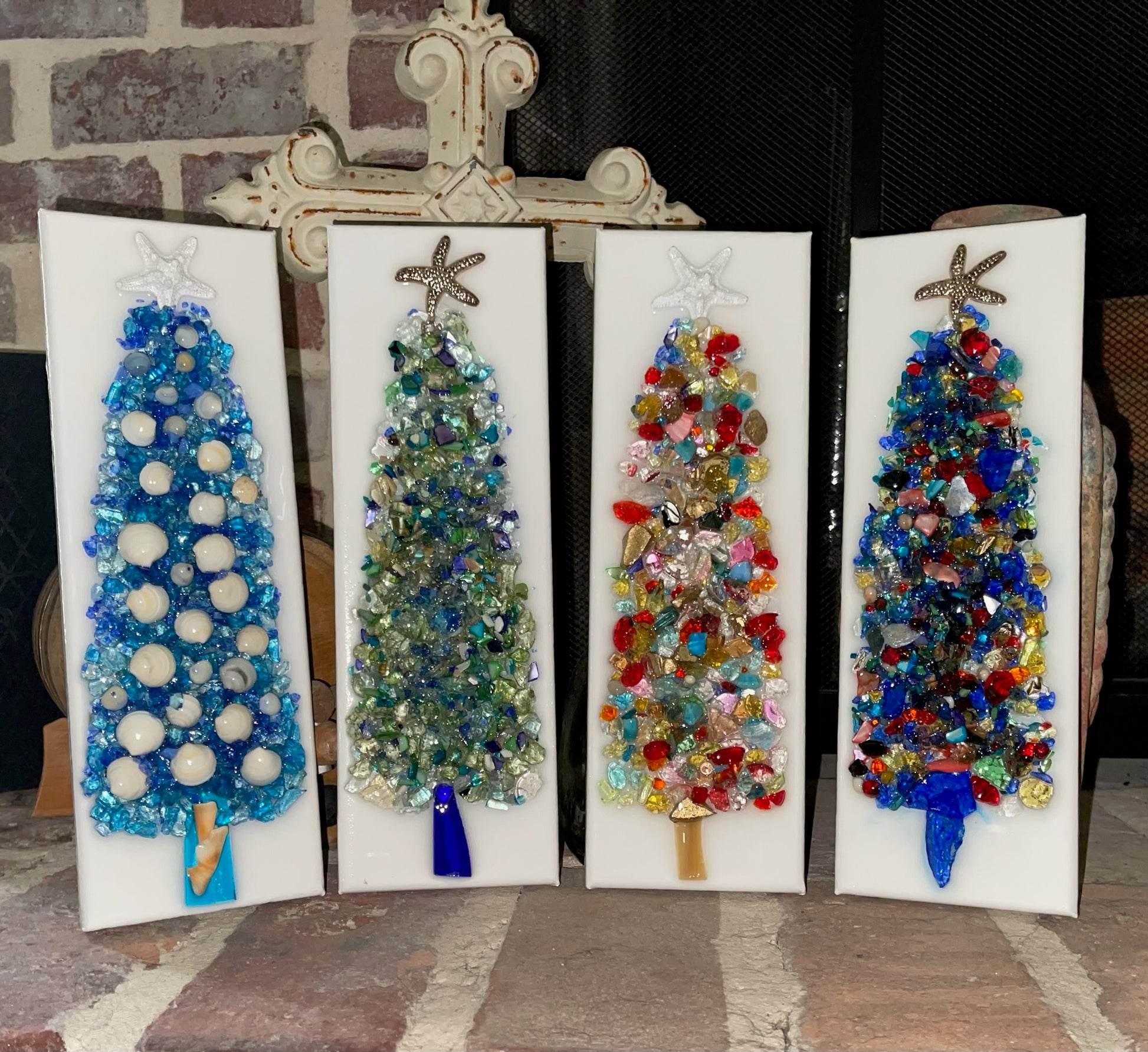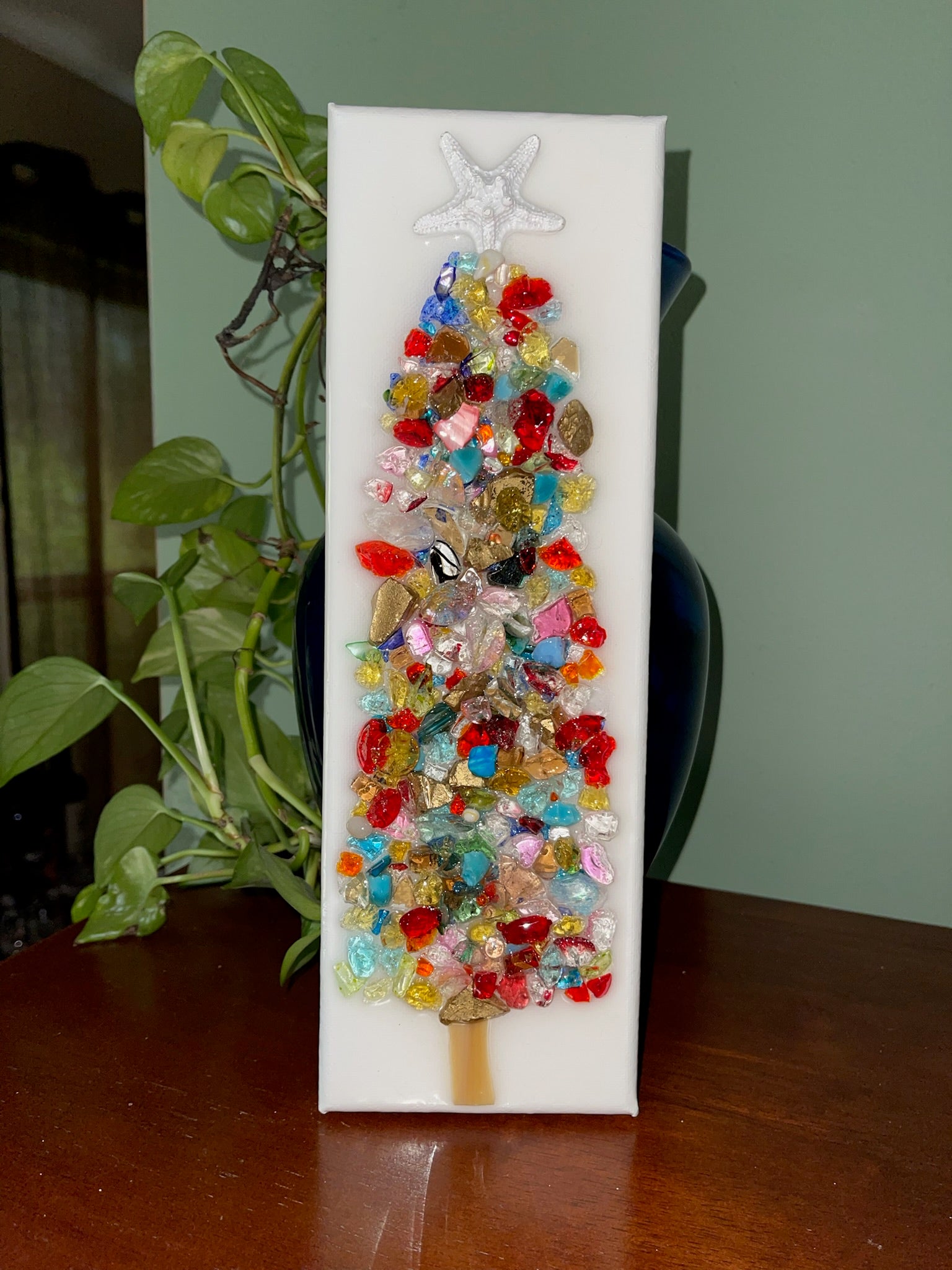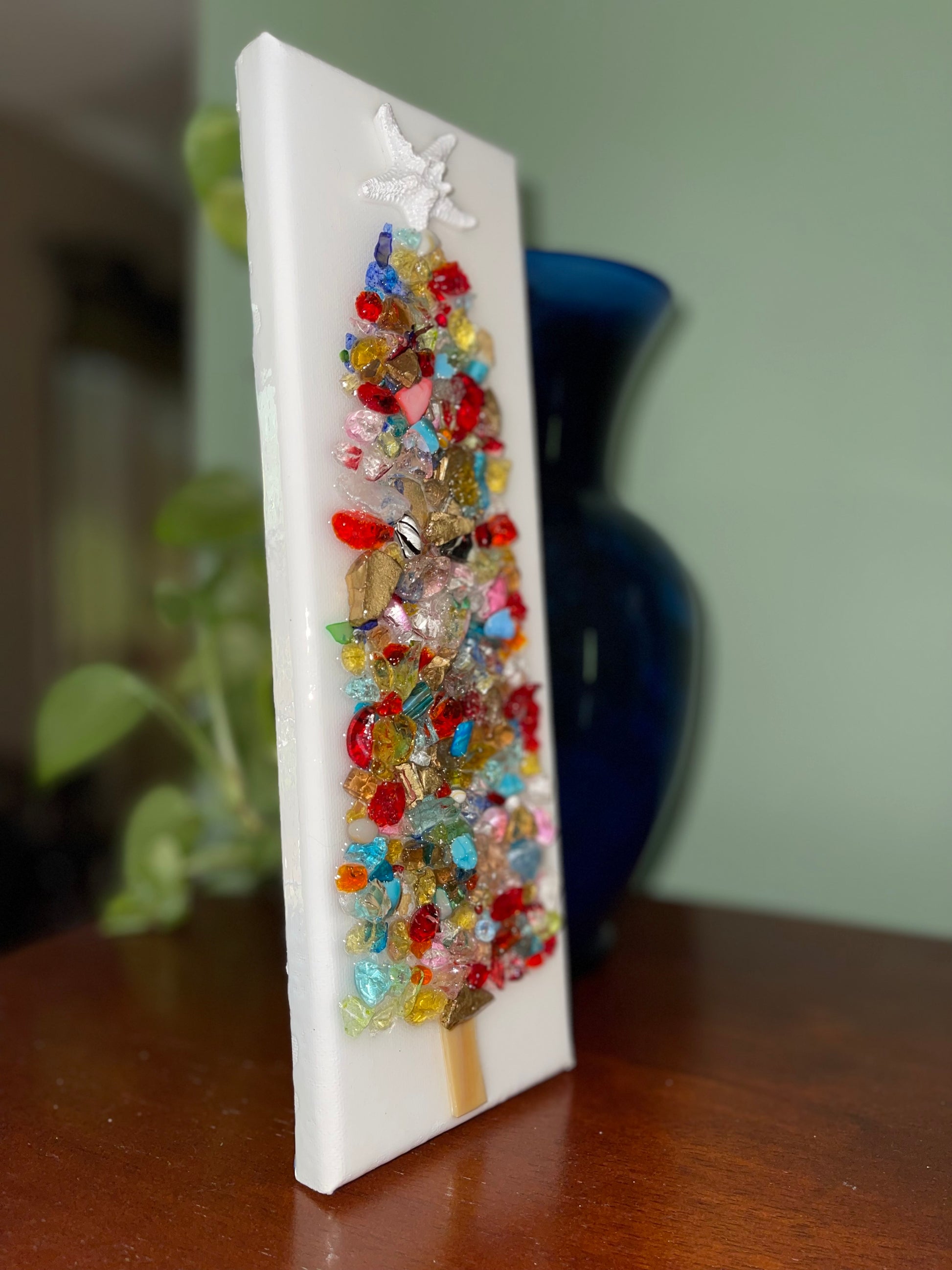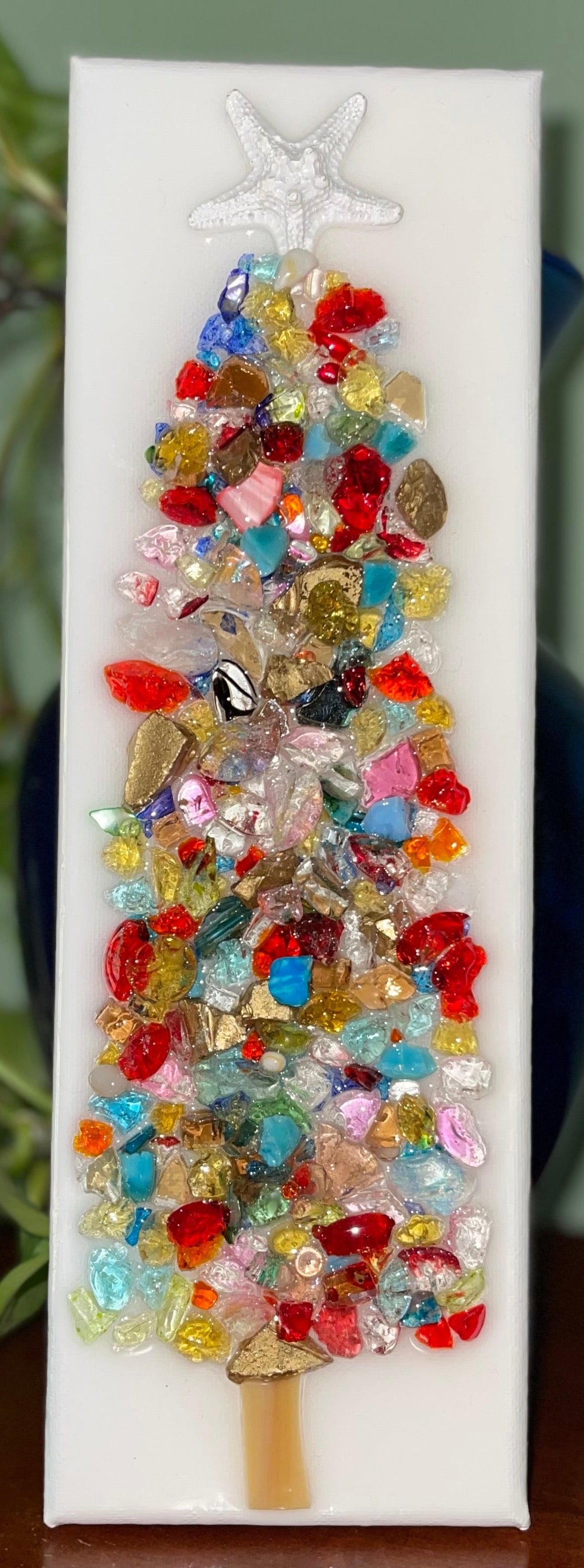 The canvas was gently coated with acrylic paints. The Christmas tree has broken glass and colorful seashells with a beautiful starfish at the top. The entire piece is sealed with epoxy resin.