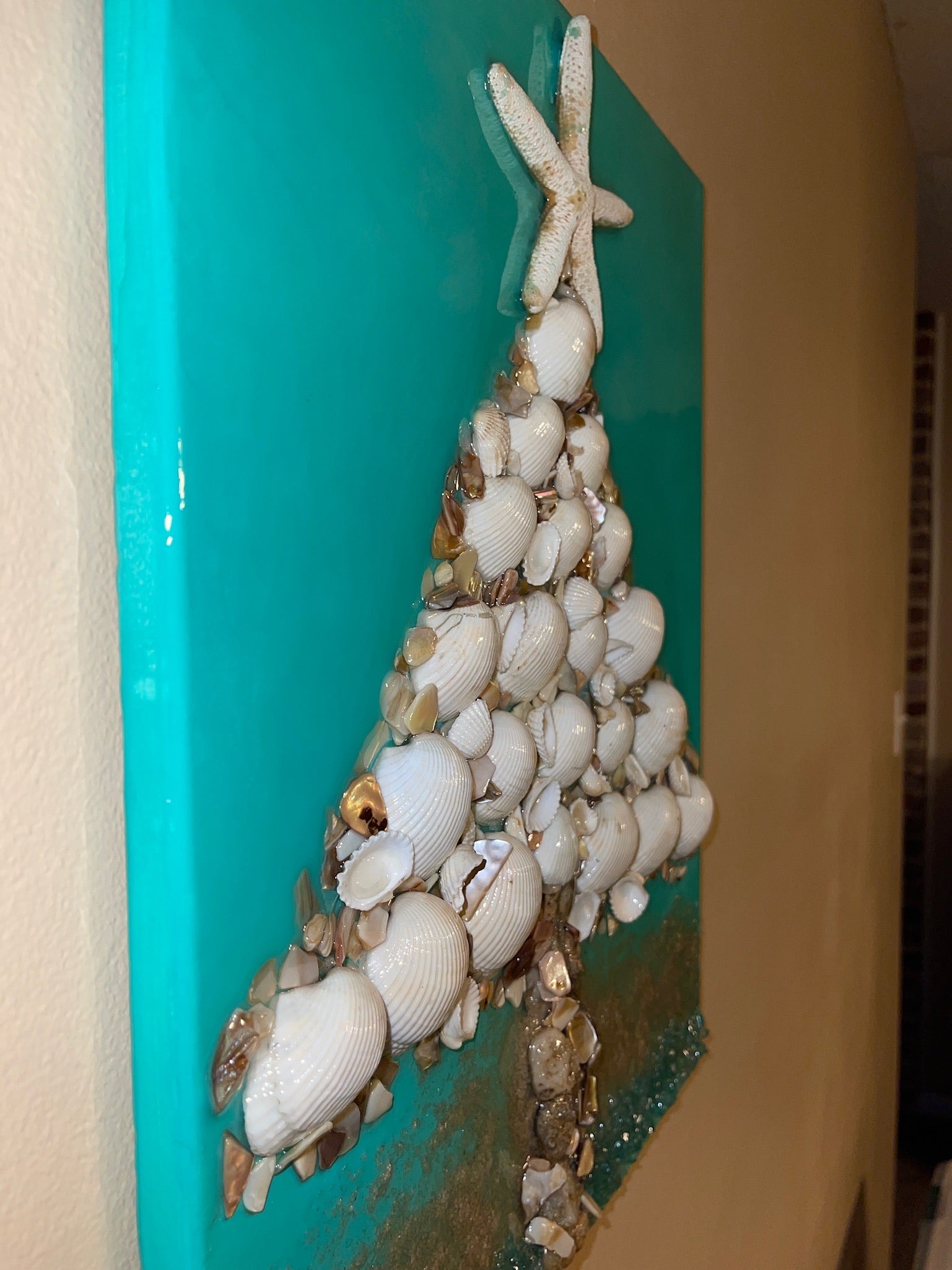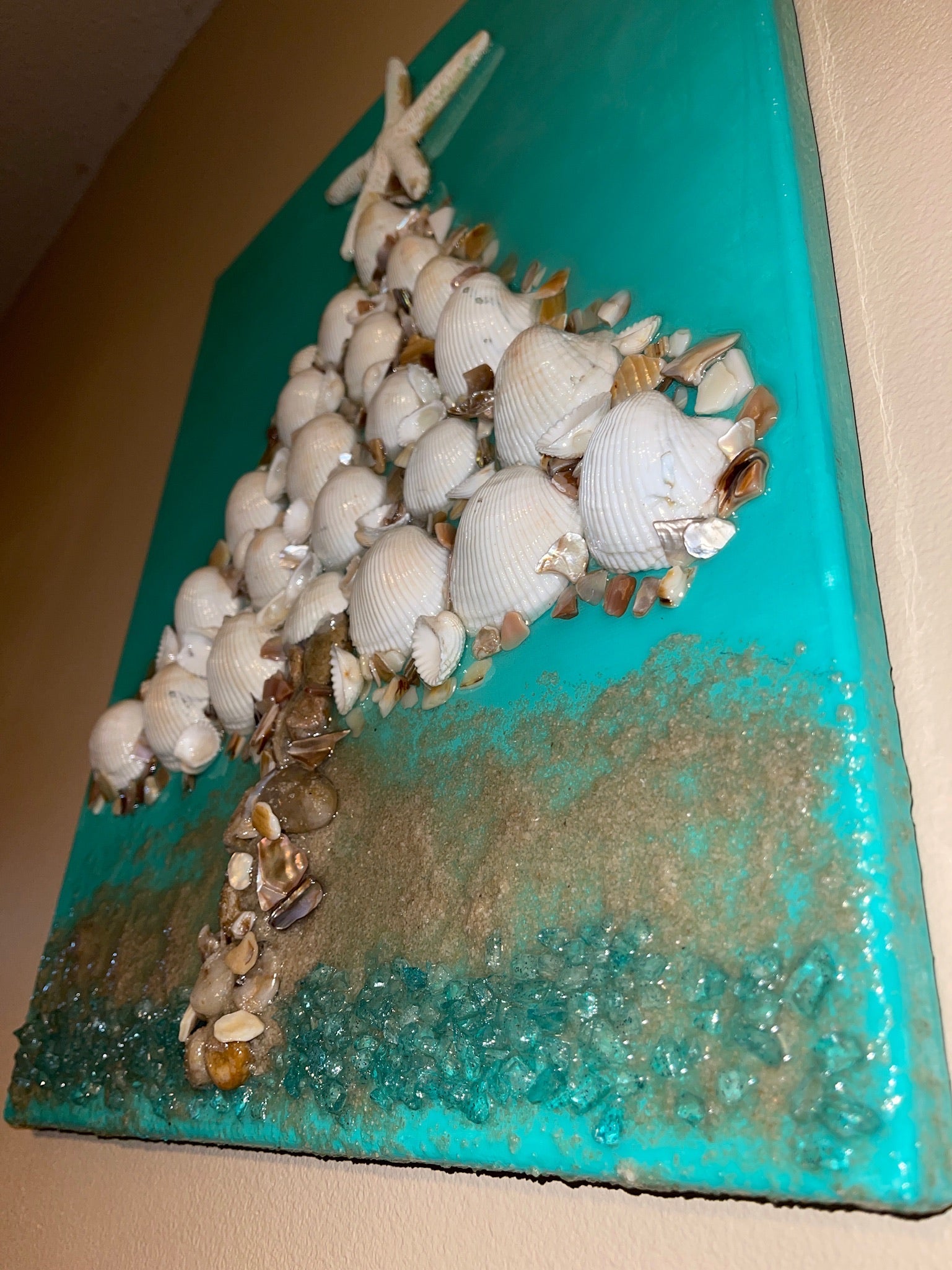Created with crushed glass, seashells & starfish on top. The entire piece is sealed with epoxy resin.