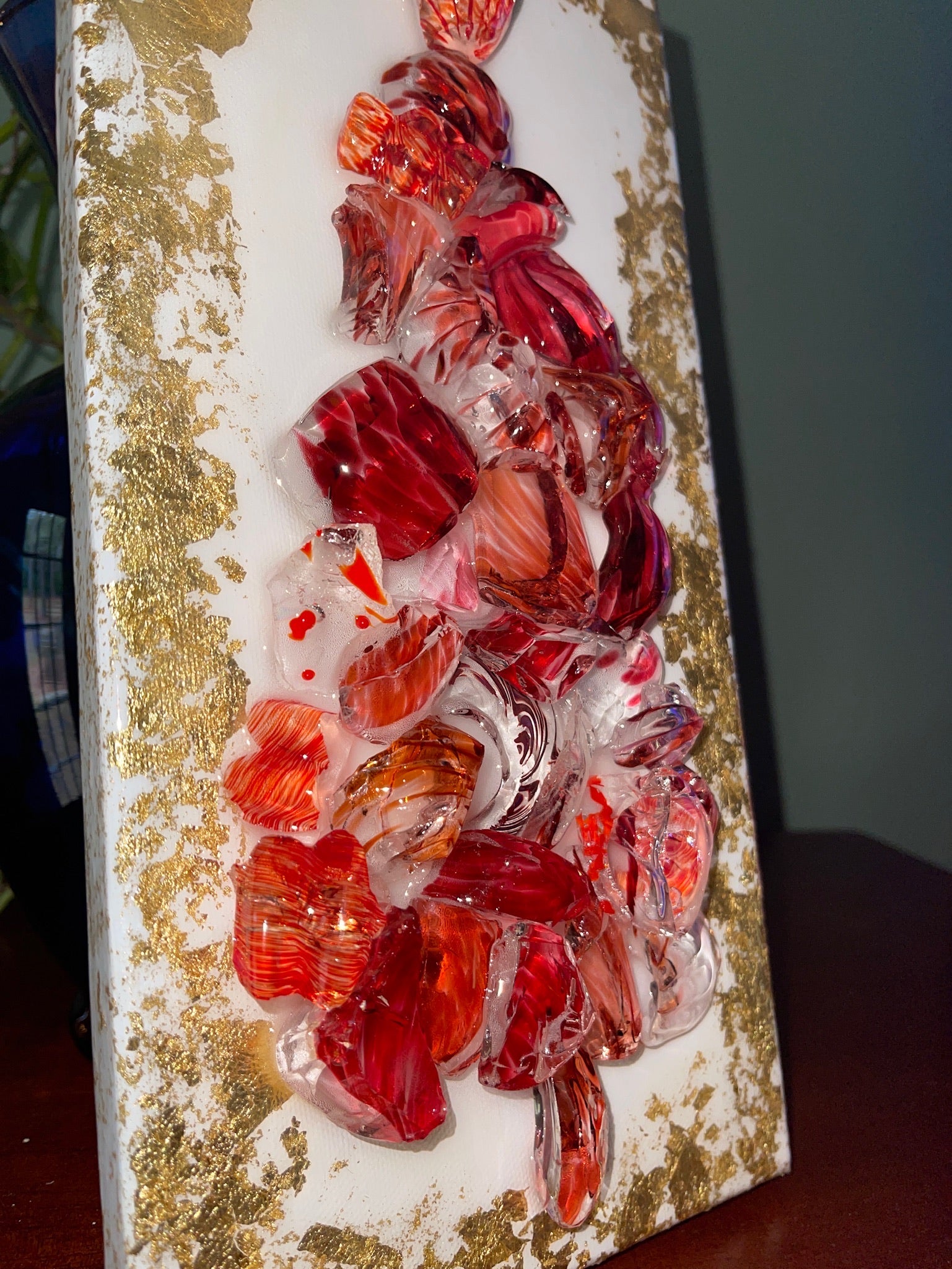 This beautiful hand blown glass Christmas tree is hand painted with acrylics and lined with gold leaf. The entire tree is sealed with epoxy resin and ready to hang for the holidays!