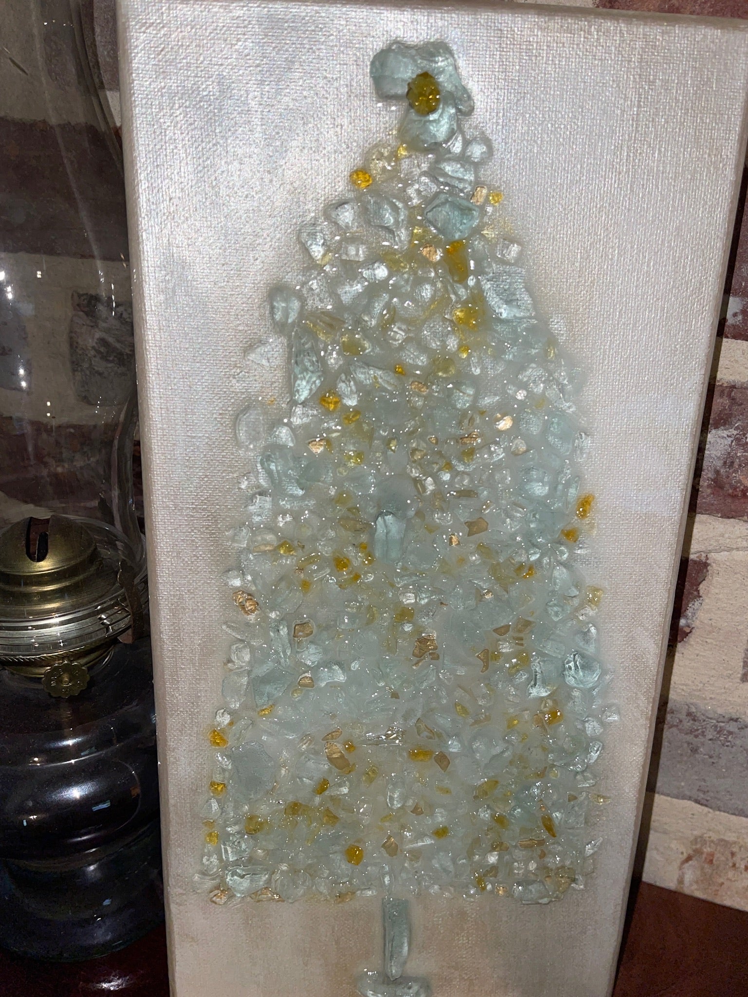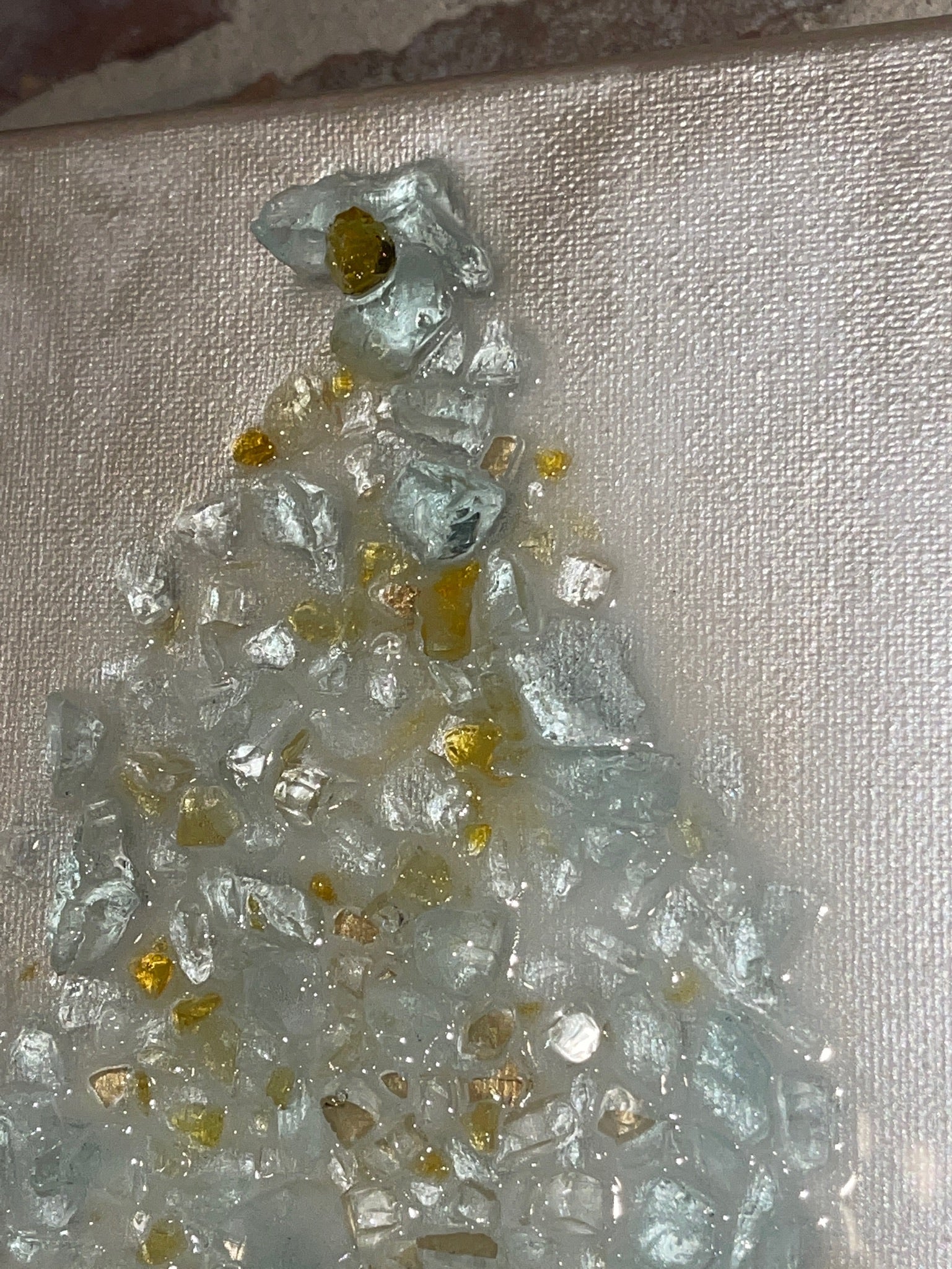 This beautiful broken glass Christmas tree is hand painted with acrylics and sealed with epoxy resin.