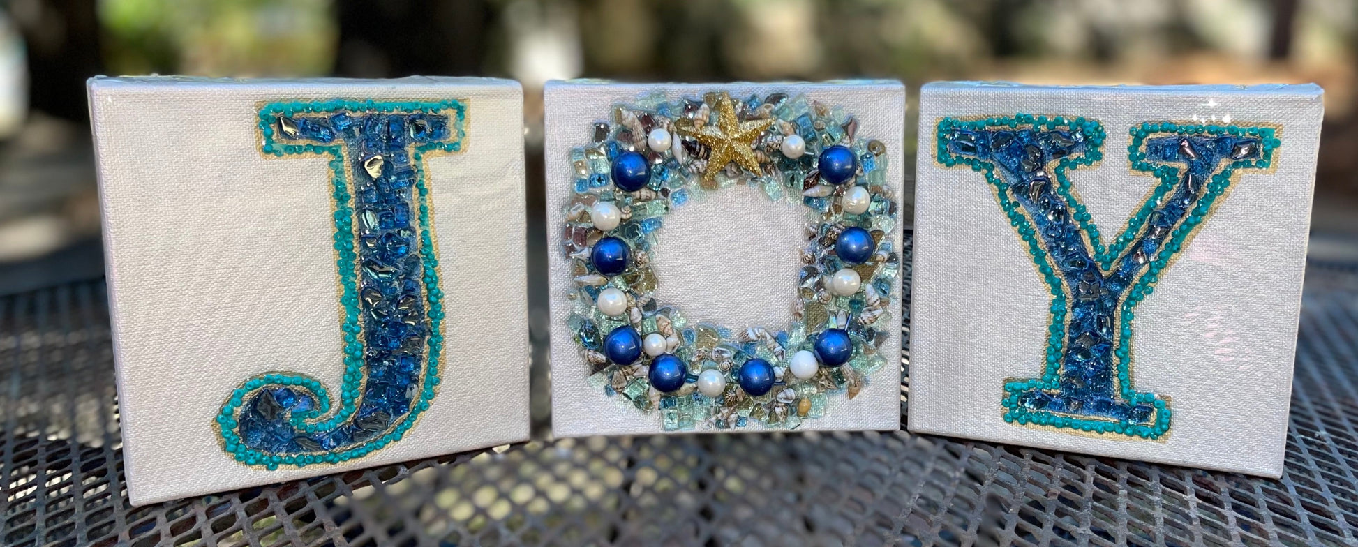 The letters are painted with acrylics, enclosed with texture paste, broken glass, cut glass topped and sealed with epoxy resin.