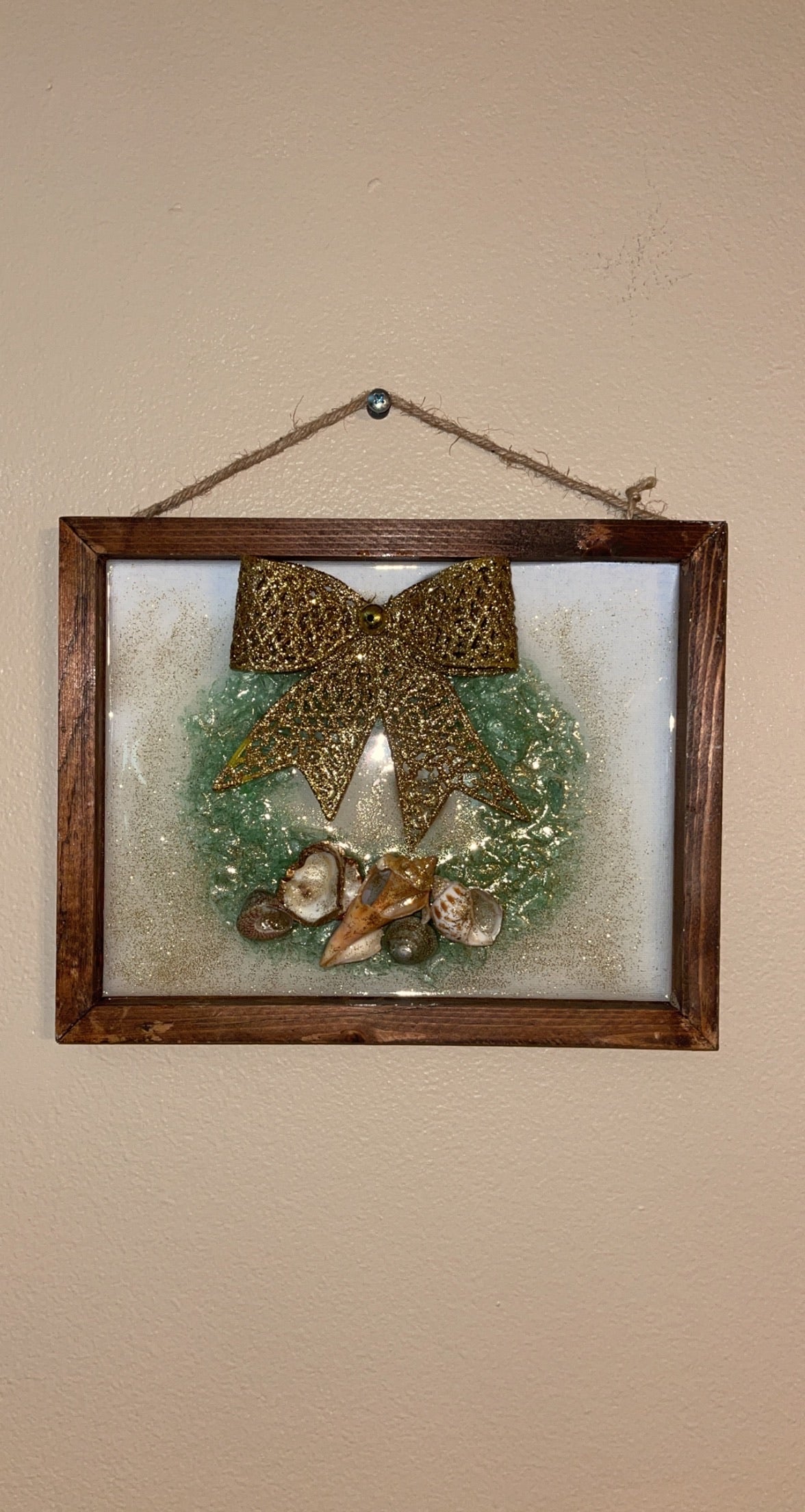 A fun spin on the traditional Christmas wreath. Crushed glass adorns a reversed 8x10 inc canvas to create this unique piece.