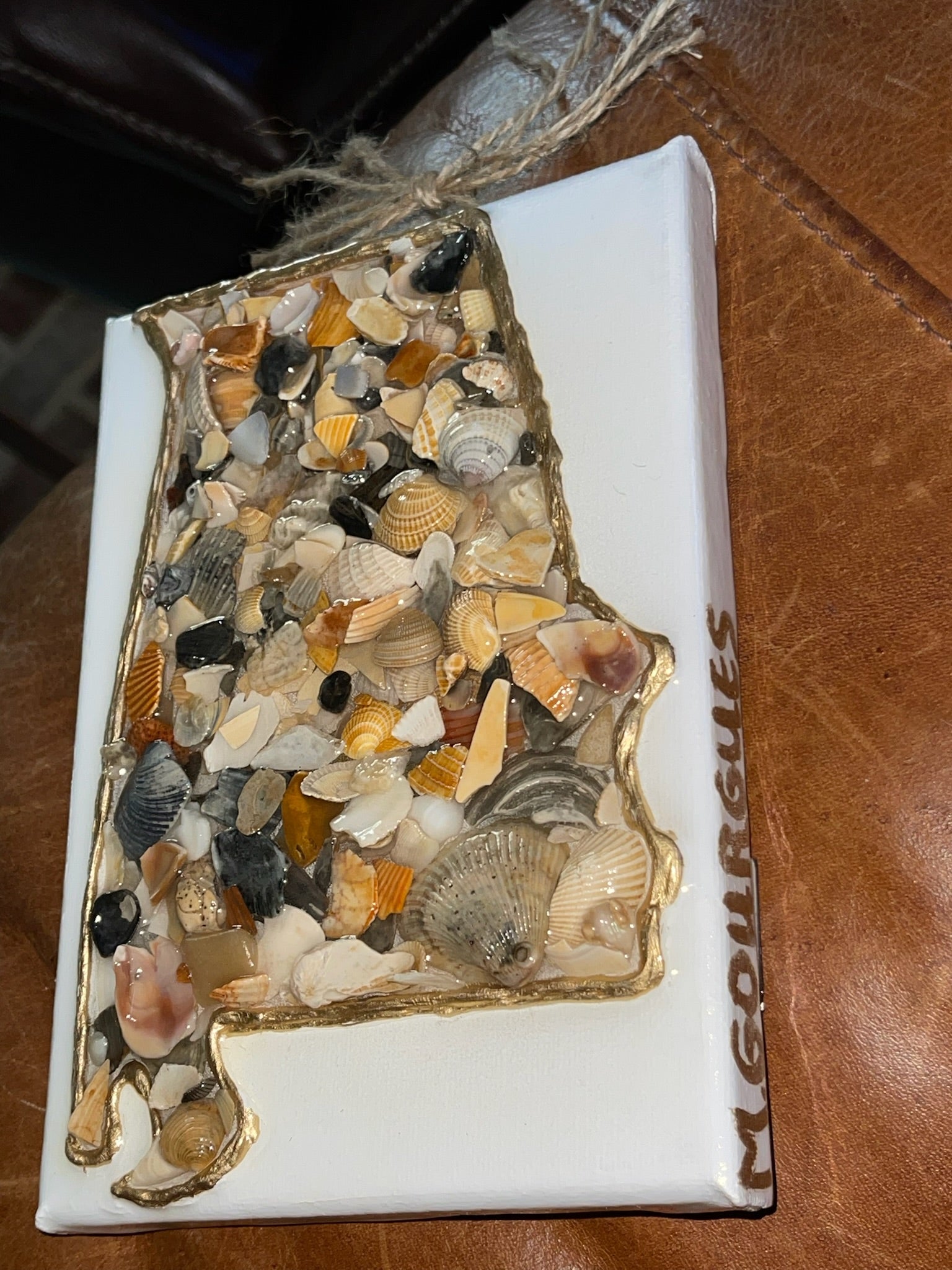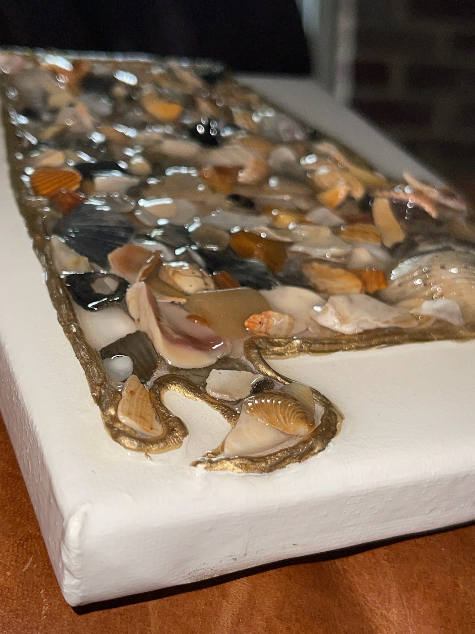 There are a lot of crushed seashells in this design. All of the crushed shells were collected along the Gulf Coast. And this piece is sealed with epoxy resin.
