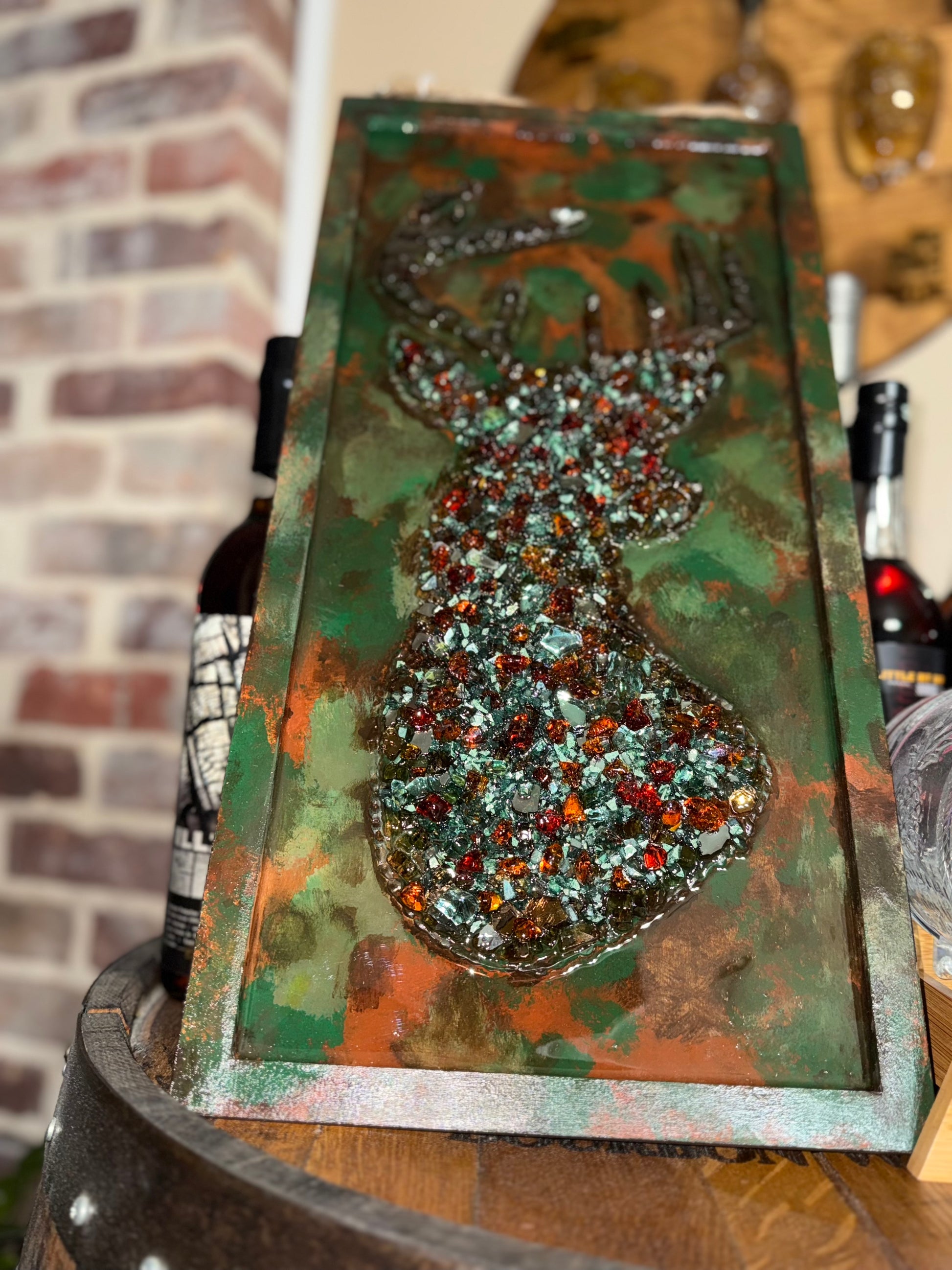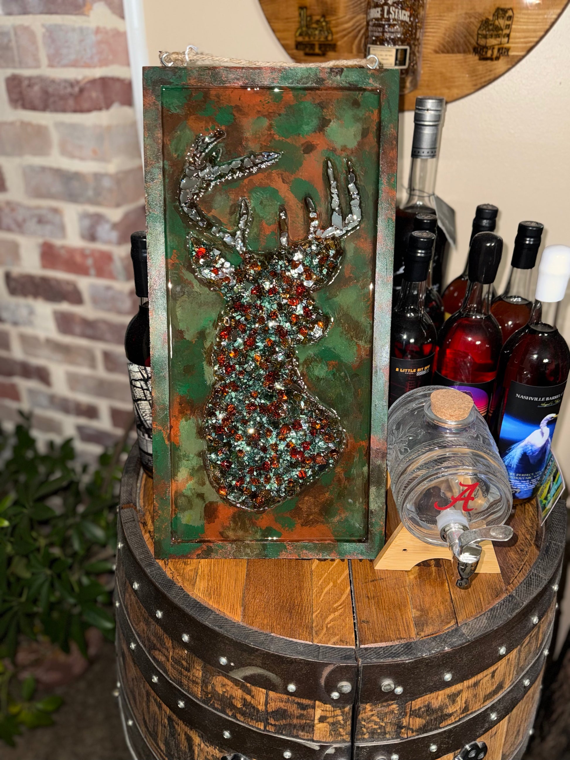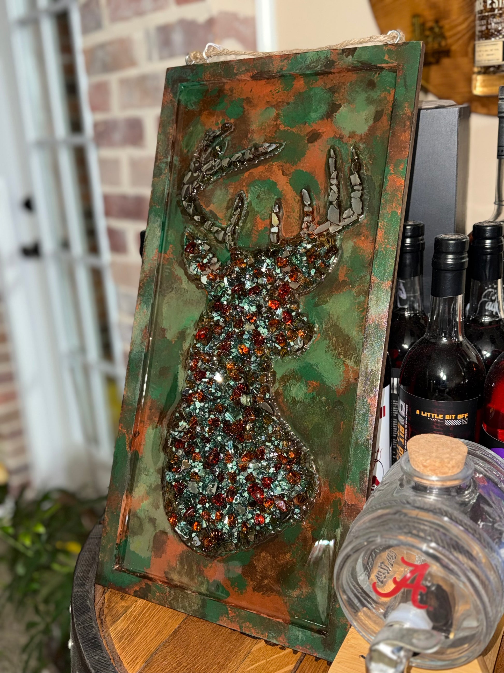 This camouflaged buck deer is on a birch wood Revered Canvas. All of the glass is inside the cradle and sealed with epoxy resin.