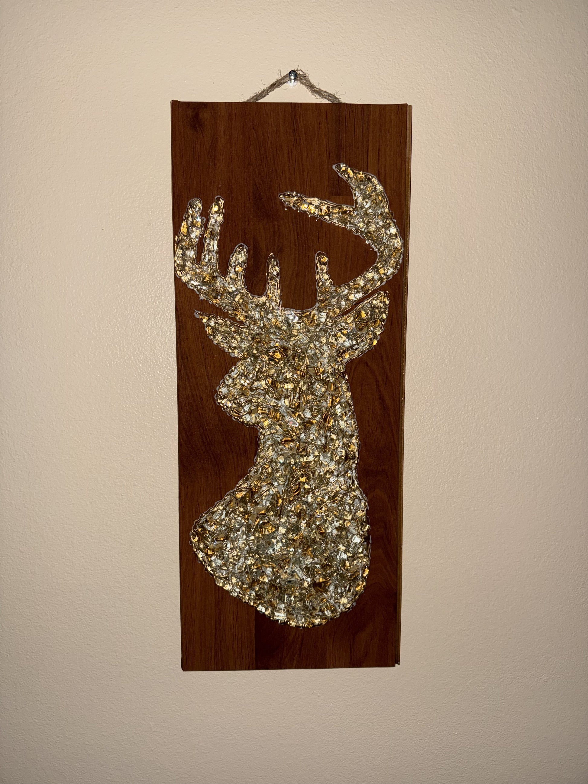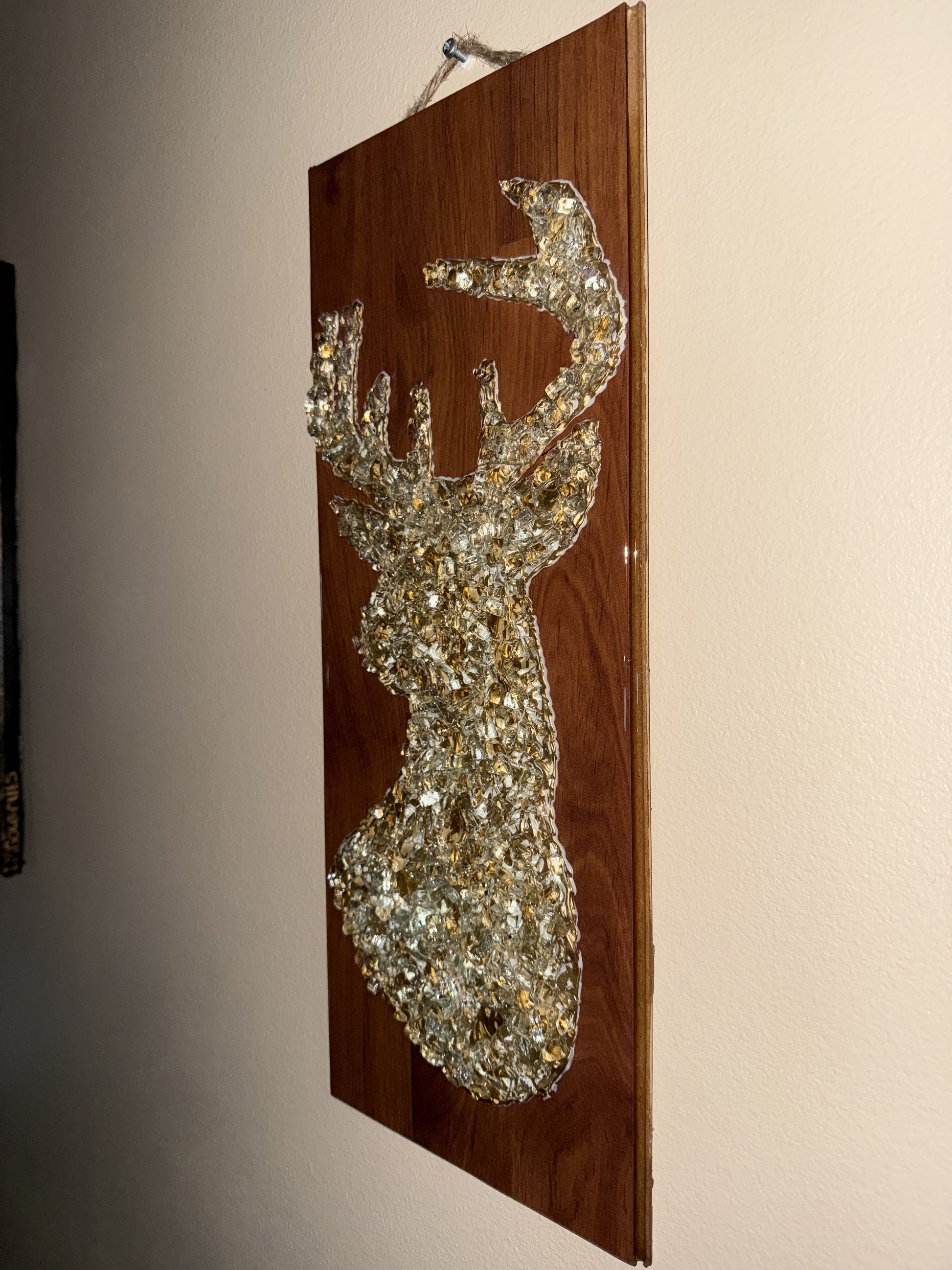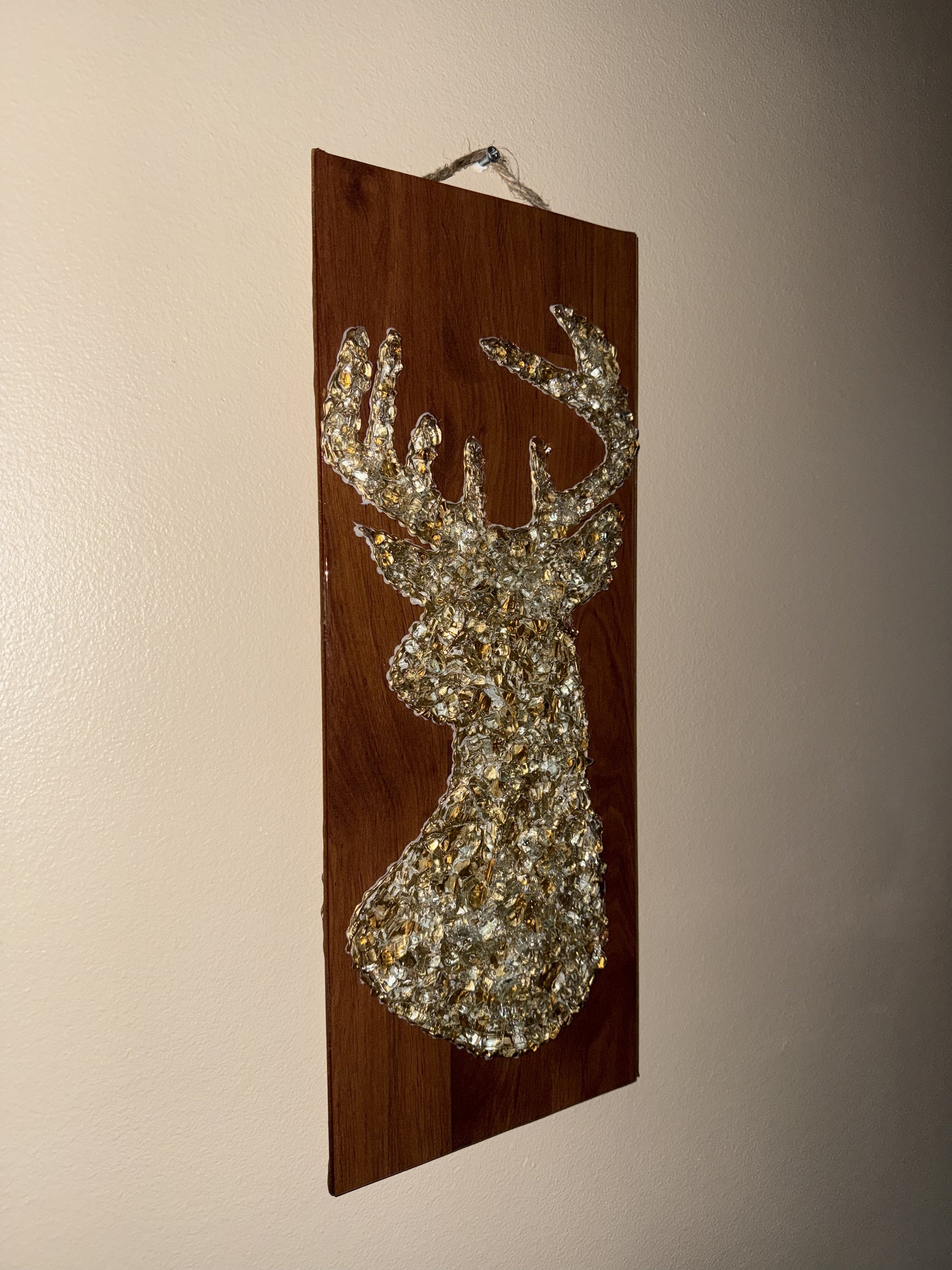 This mirrored glass buck deer is on a birch wood Revered Canvas. All of the glass is inside the cradle and sealed with epoxy resin.