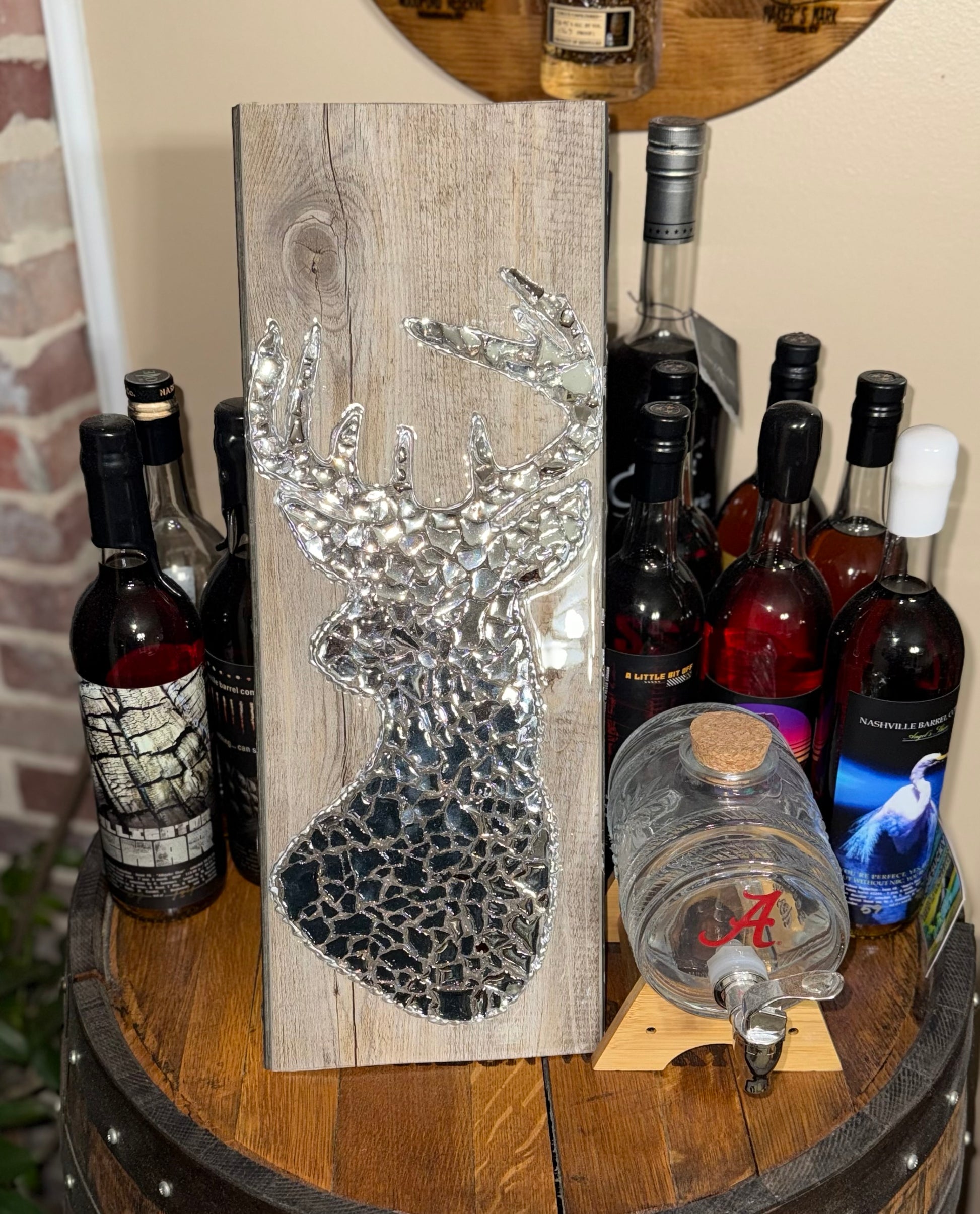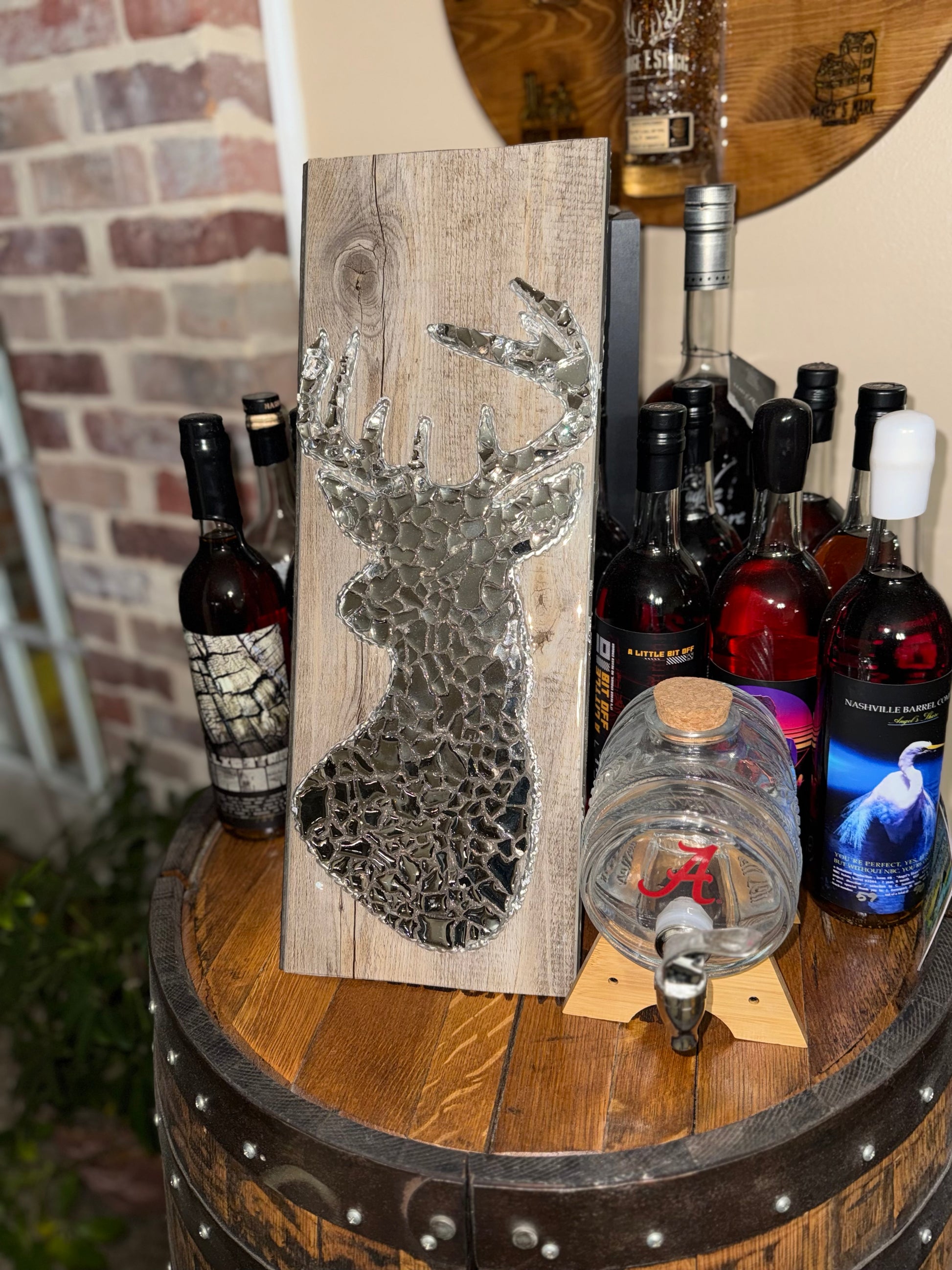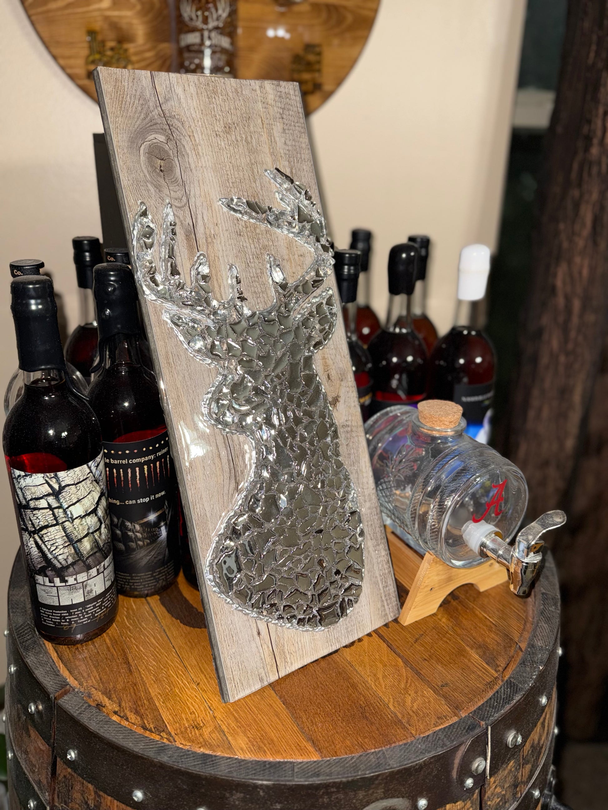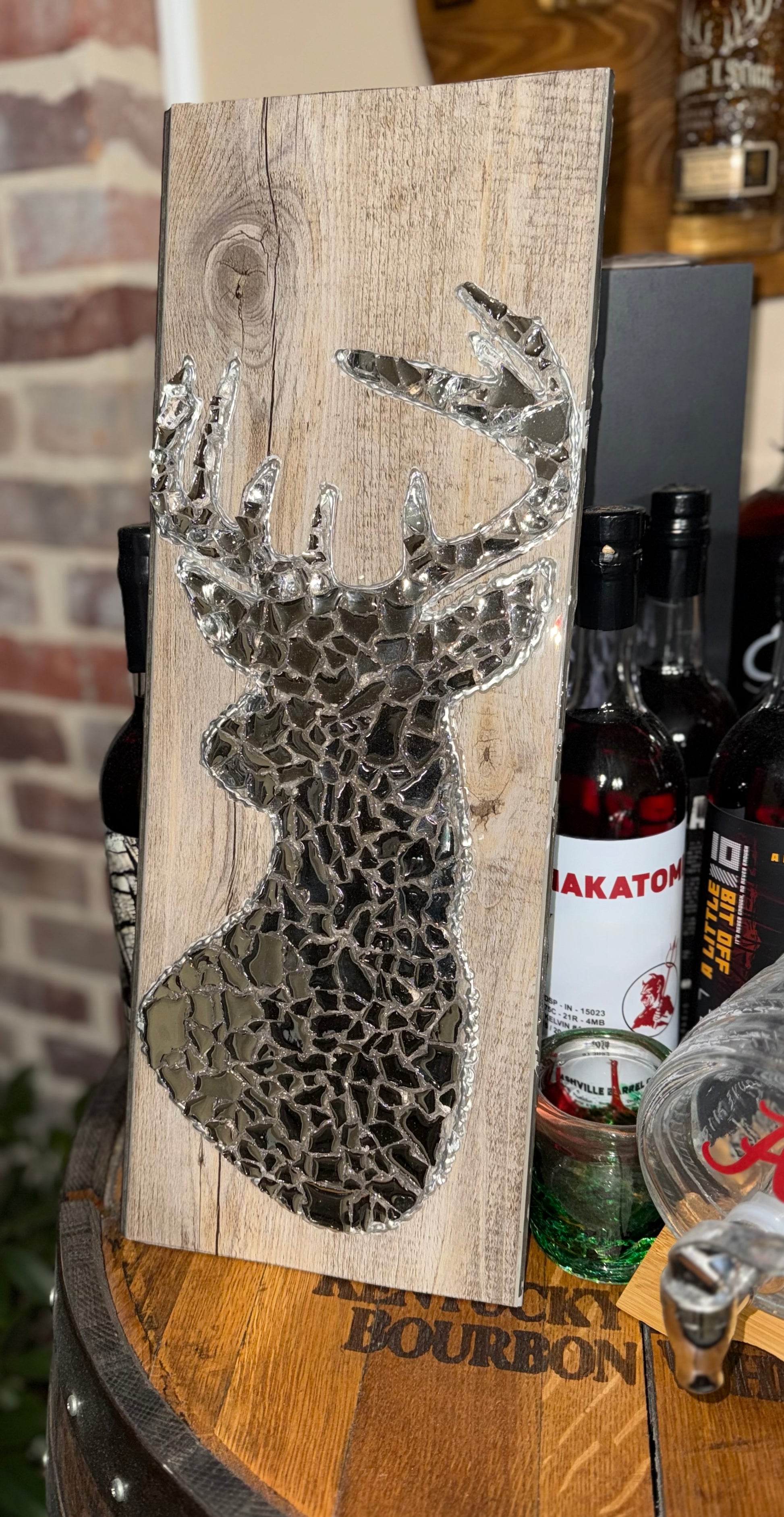 This mirrored glass buck deer is on a birch wood Revered Canvas. All of the glass is inside the cradle and sealed with epoxy resin.