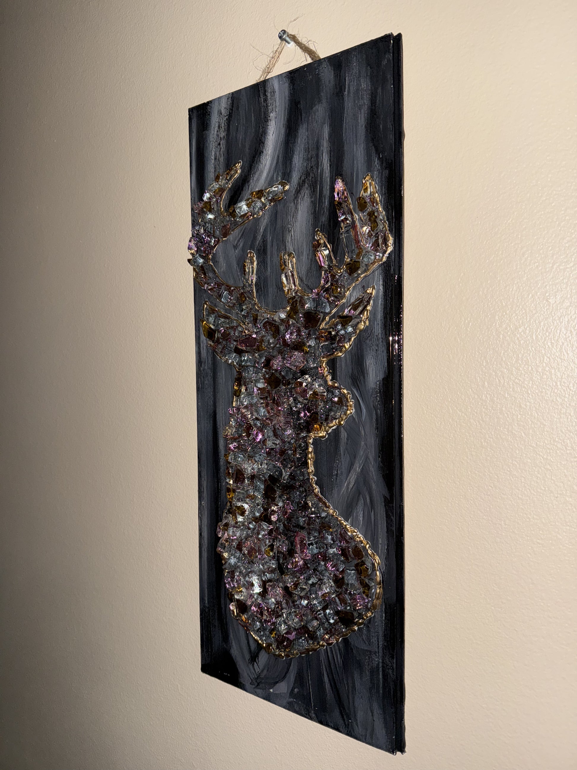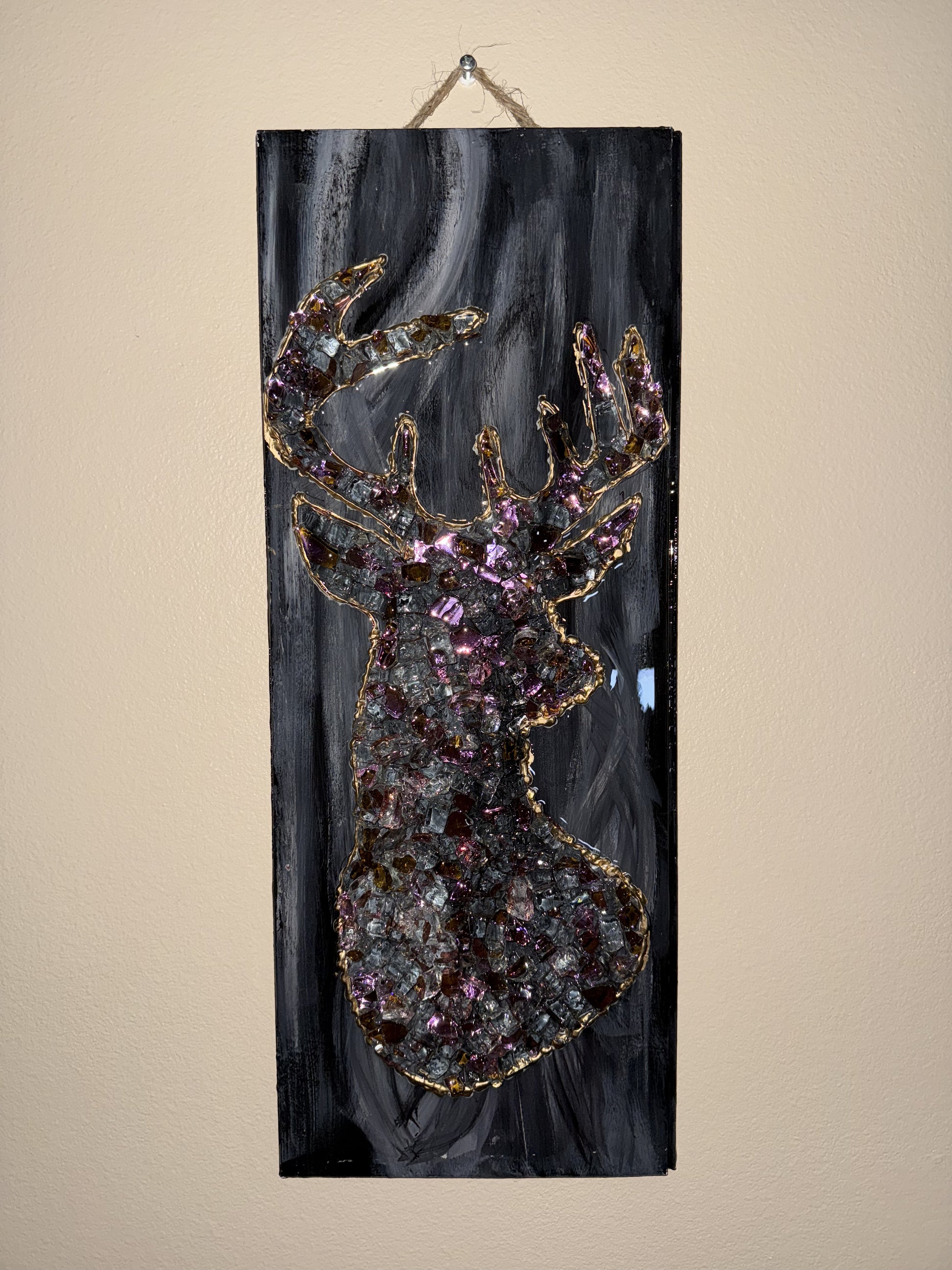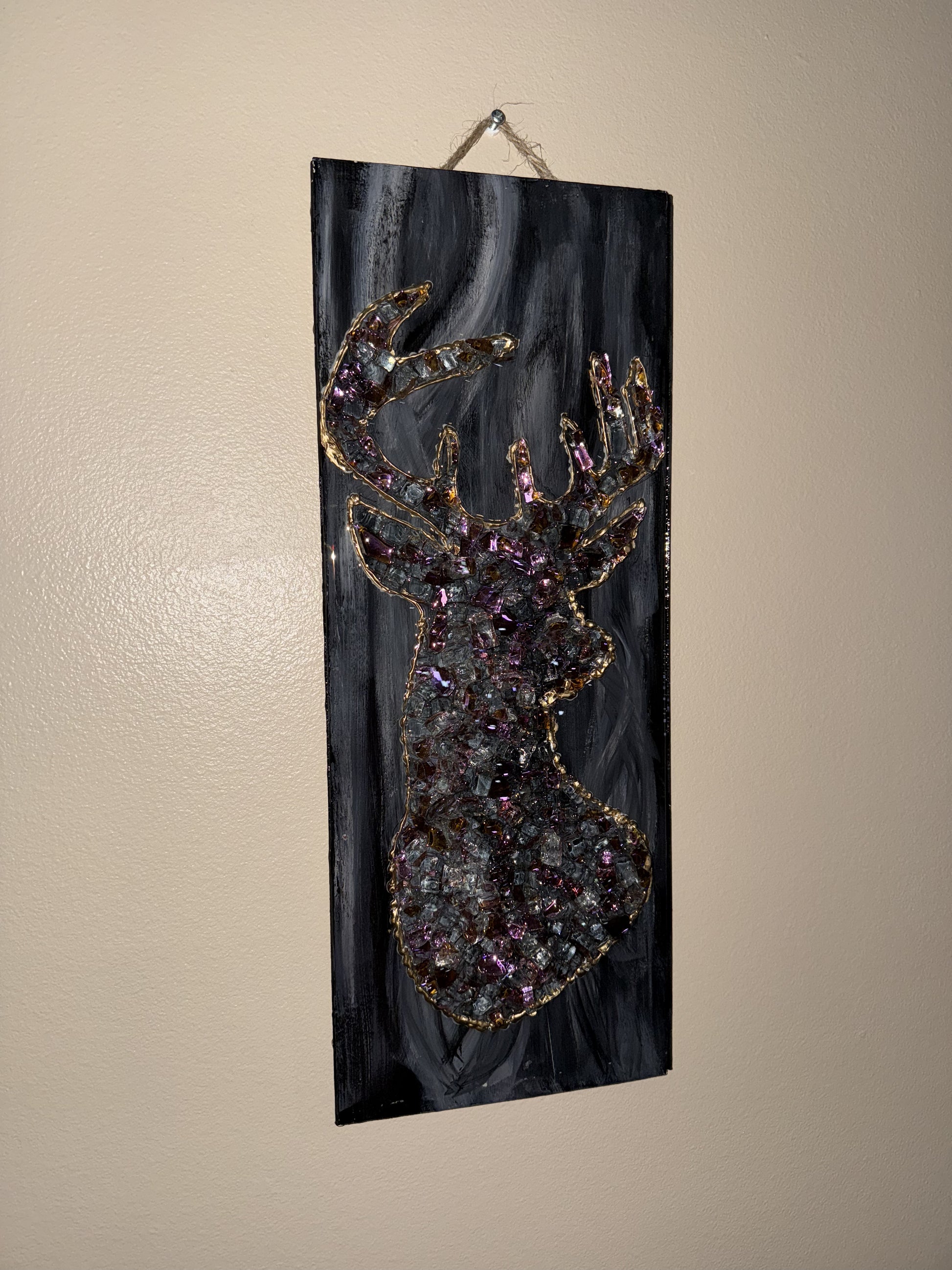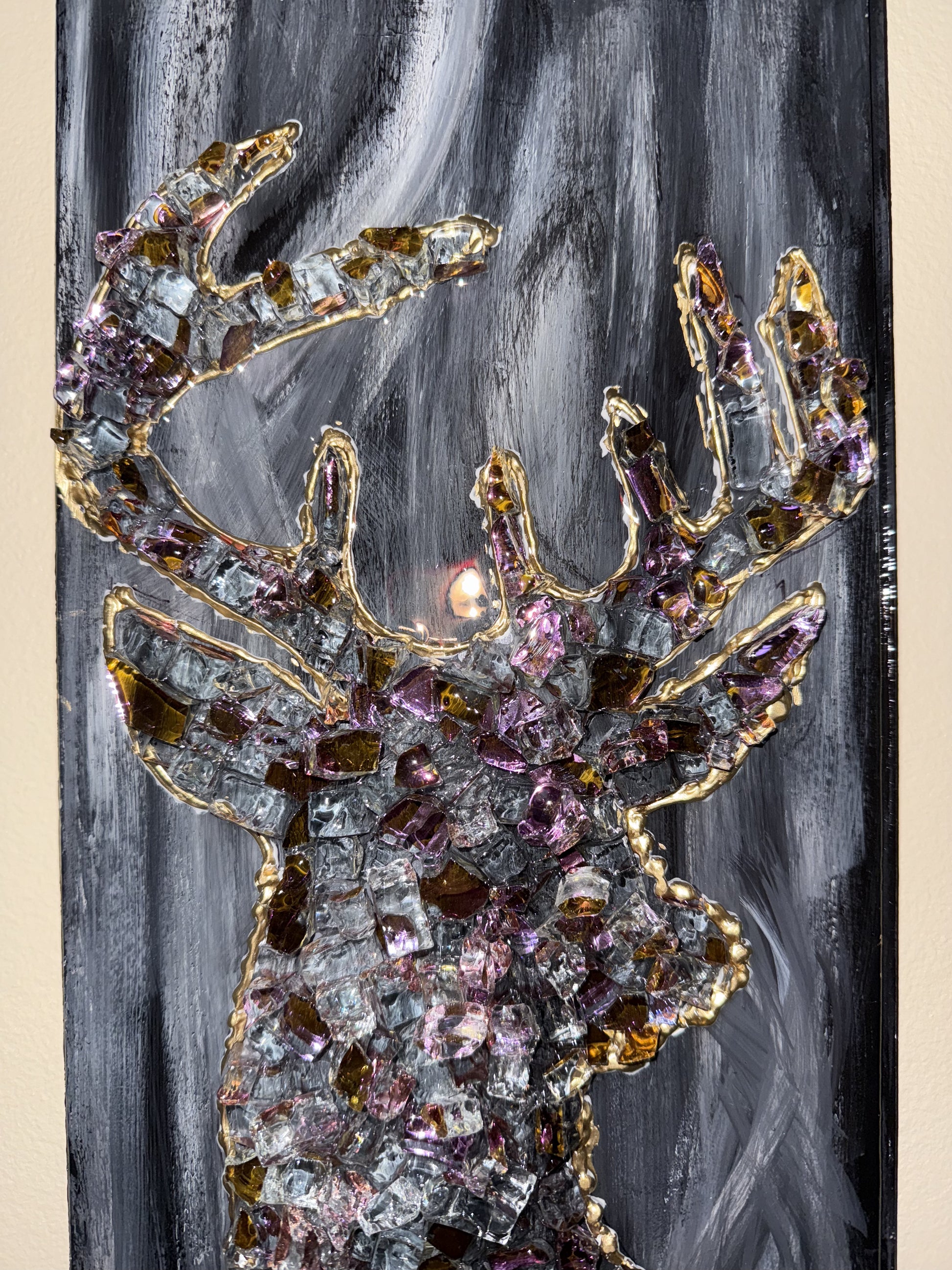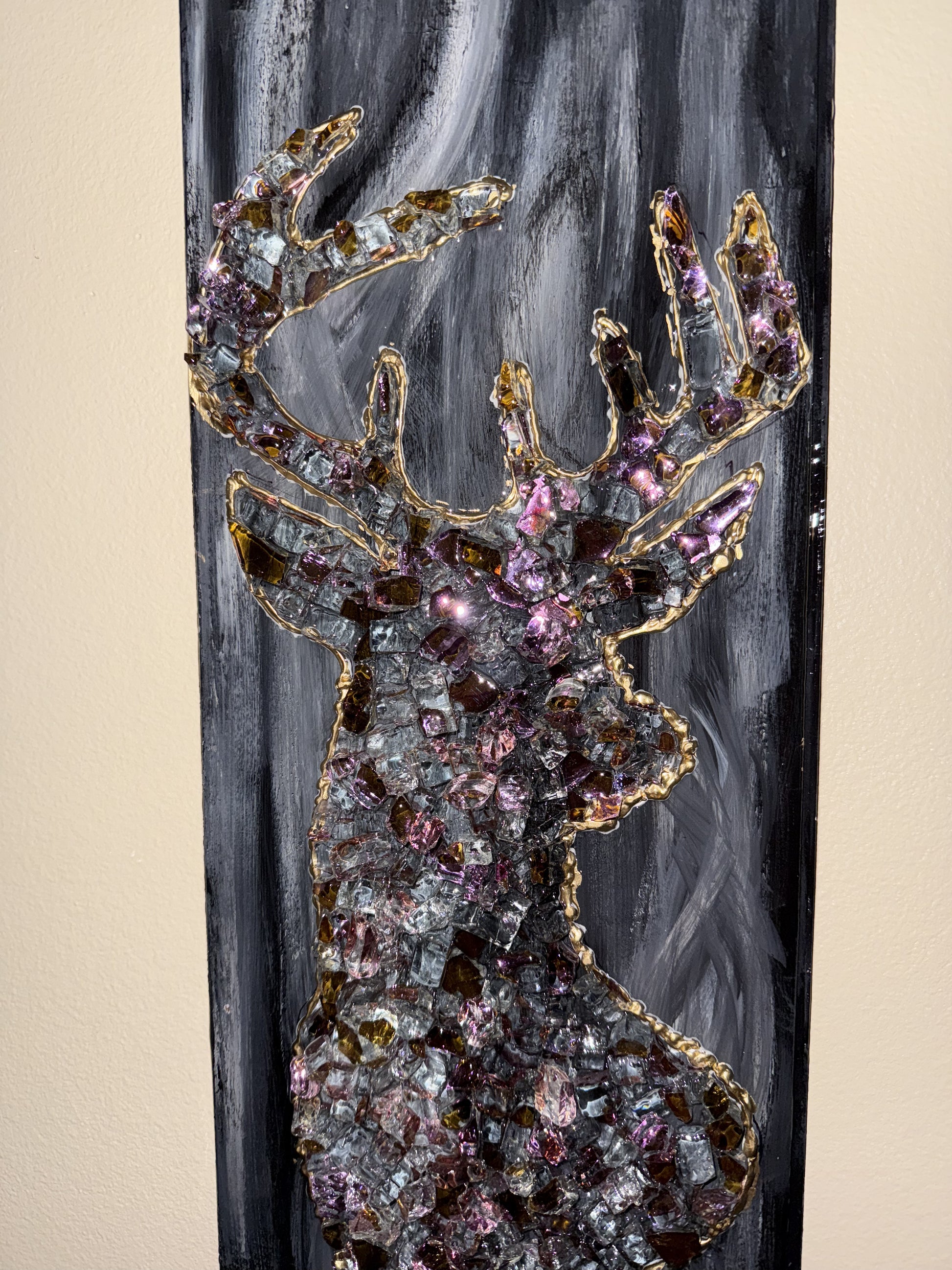 This mirrored glass buck deer is on a birch wood Revered Canvas. All of the glass is inside the cradle and sealed with epoxy resin.