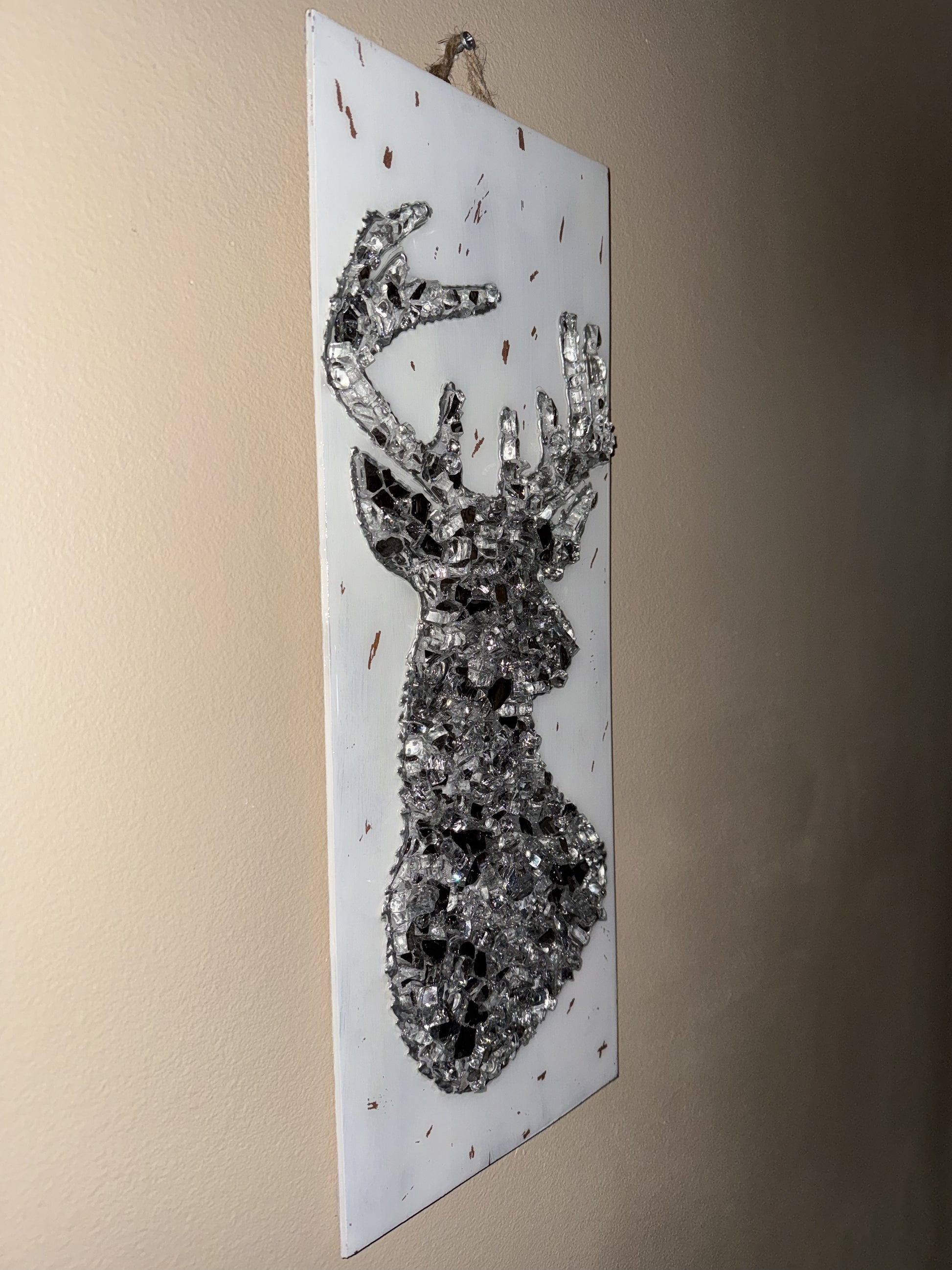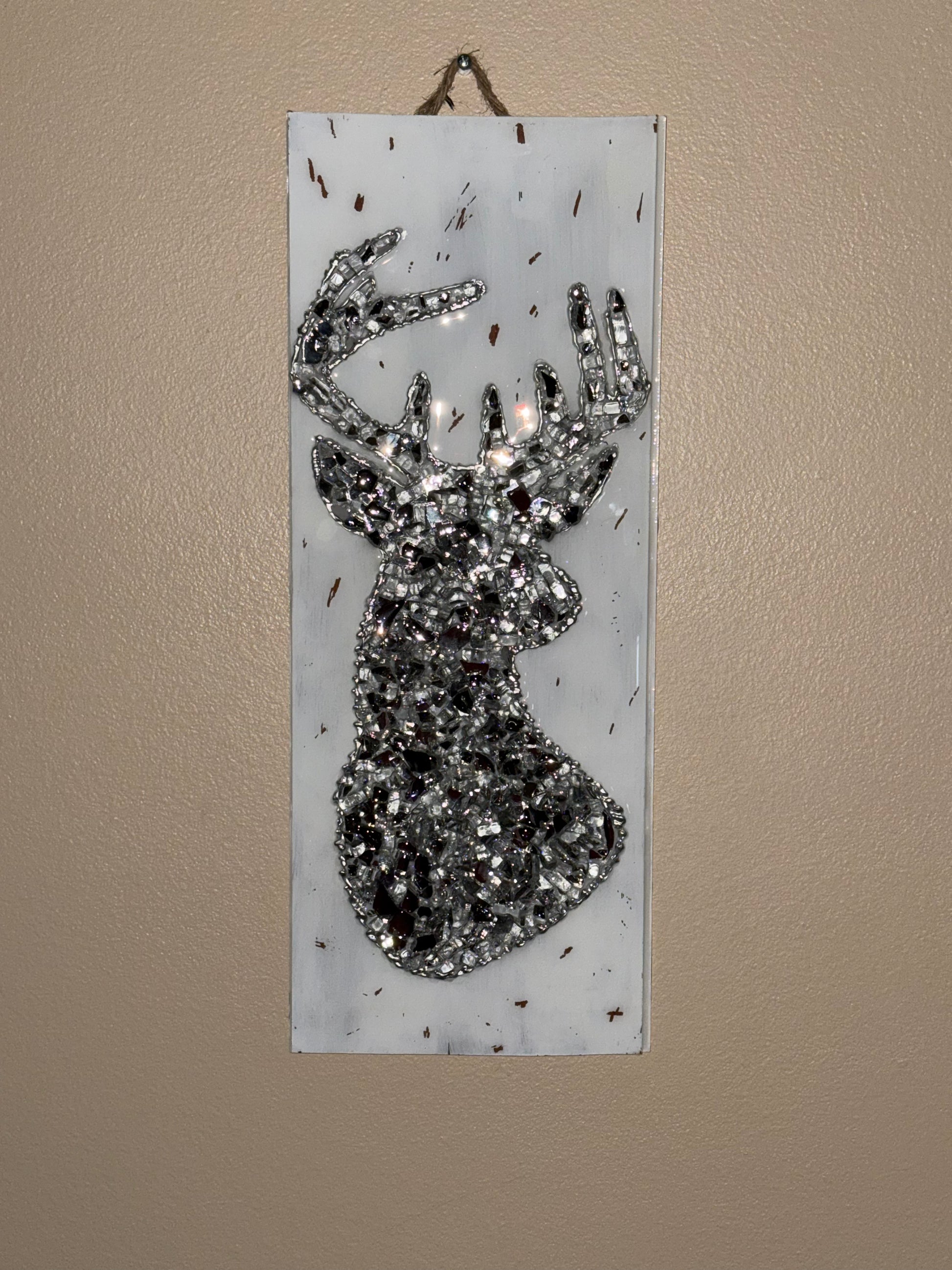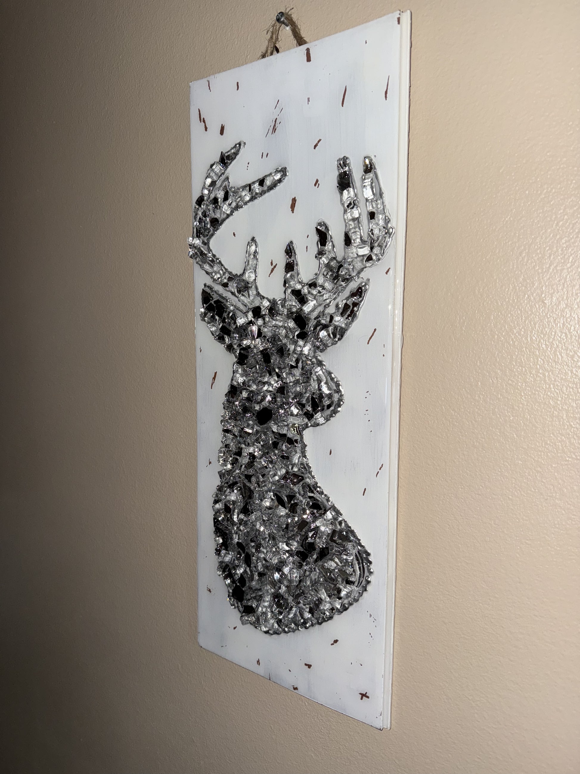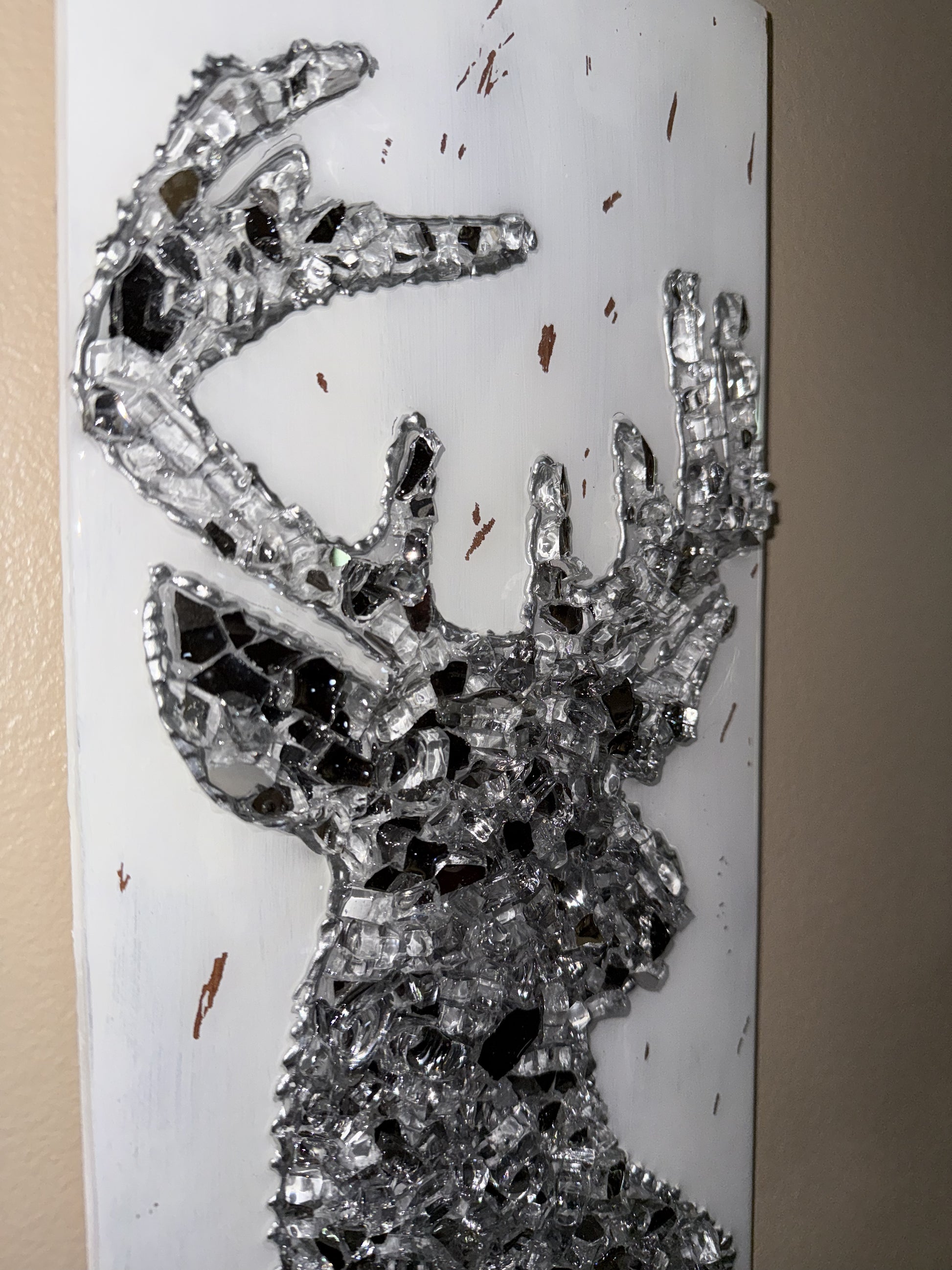 This mirrored glass buck deer is on a birch wood Revered Canvas. All of the glass is inside the cradle and sealed with epoxy resin.