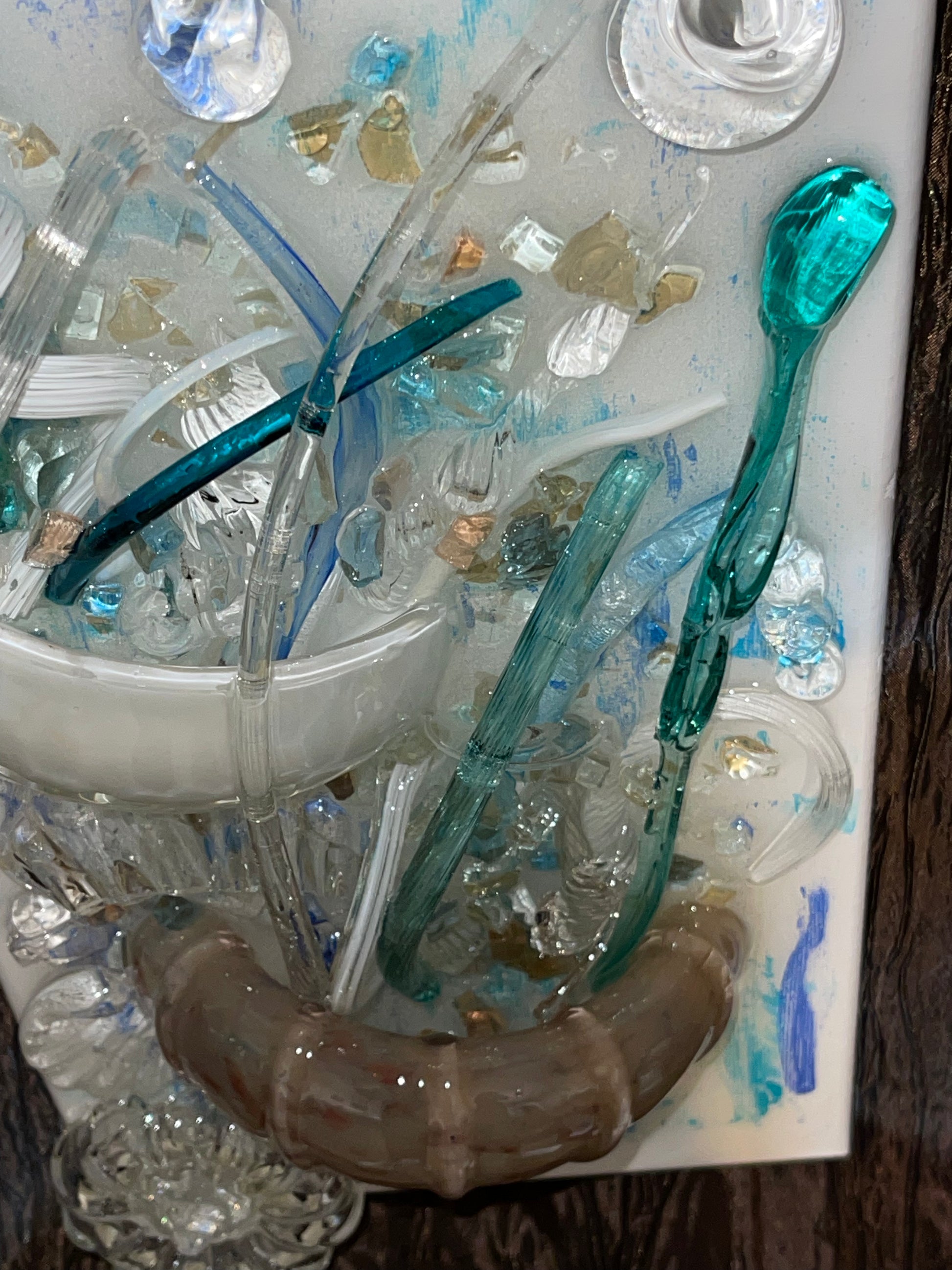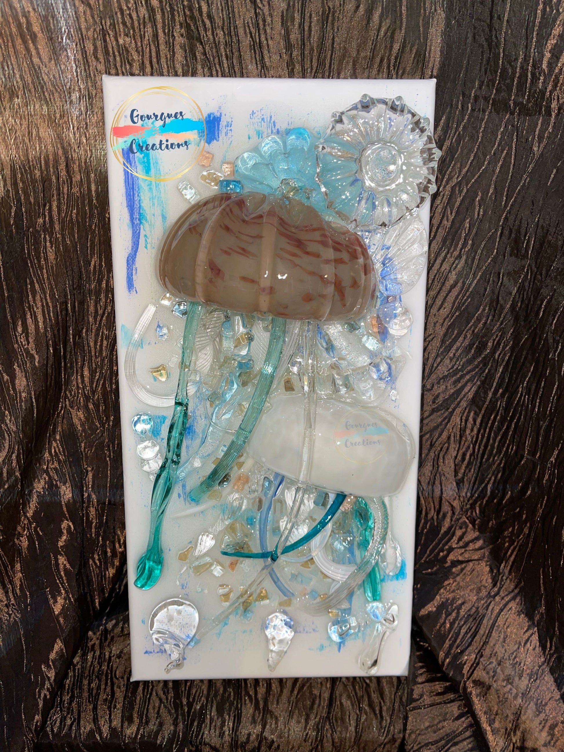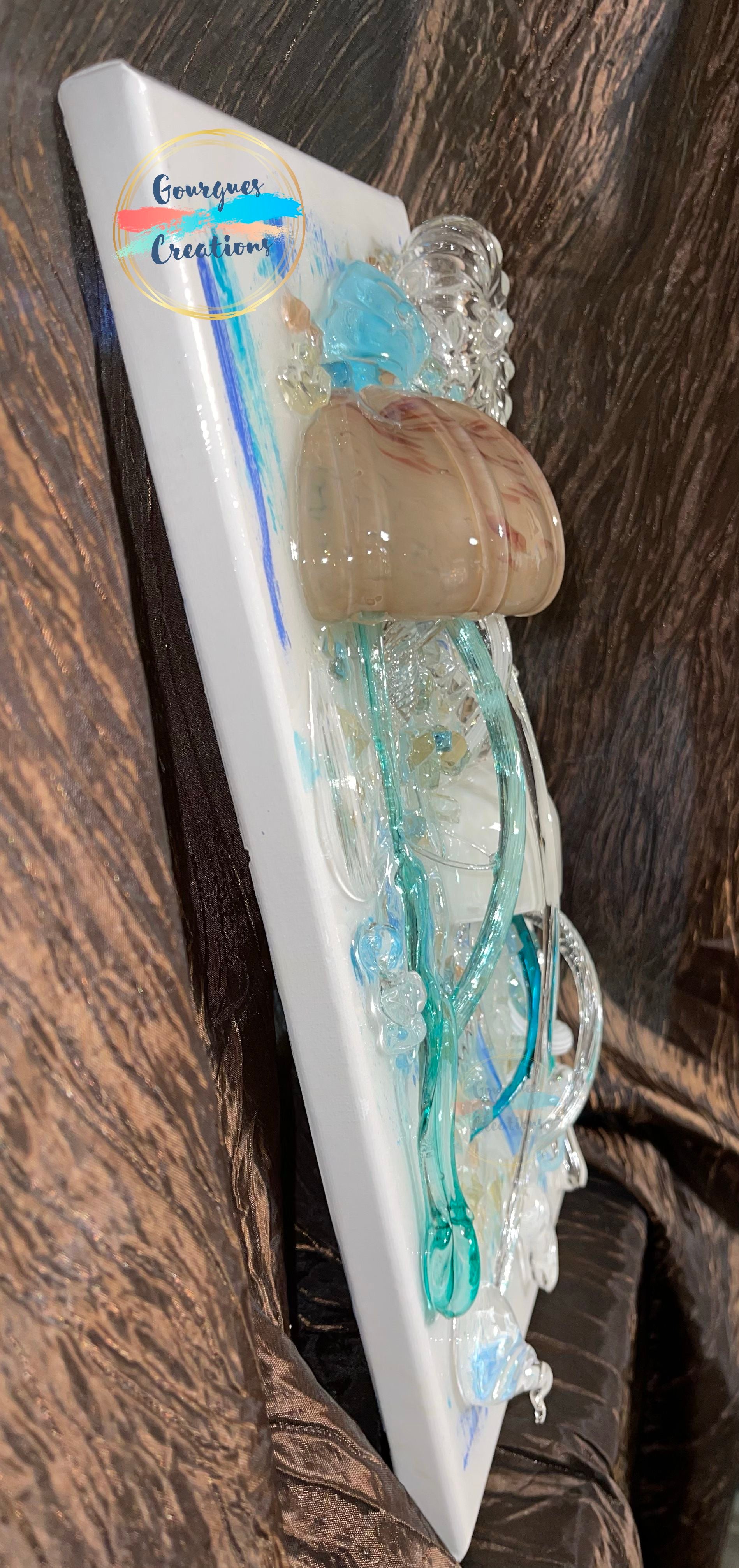 These beautiful jellyfish are on a 7"x14" - 1" Canvas and they were made with blown glass & broken glass pieces. It is a ONE OF A KIND Gourgues Creations that will be the center of attention in any room!!