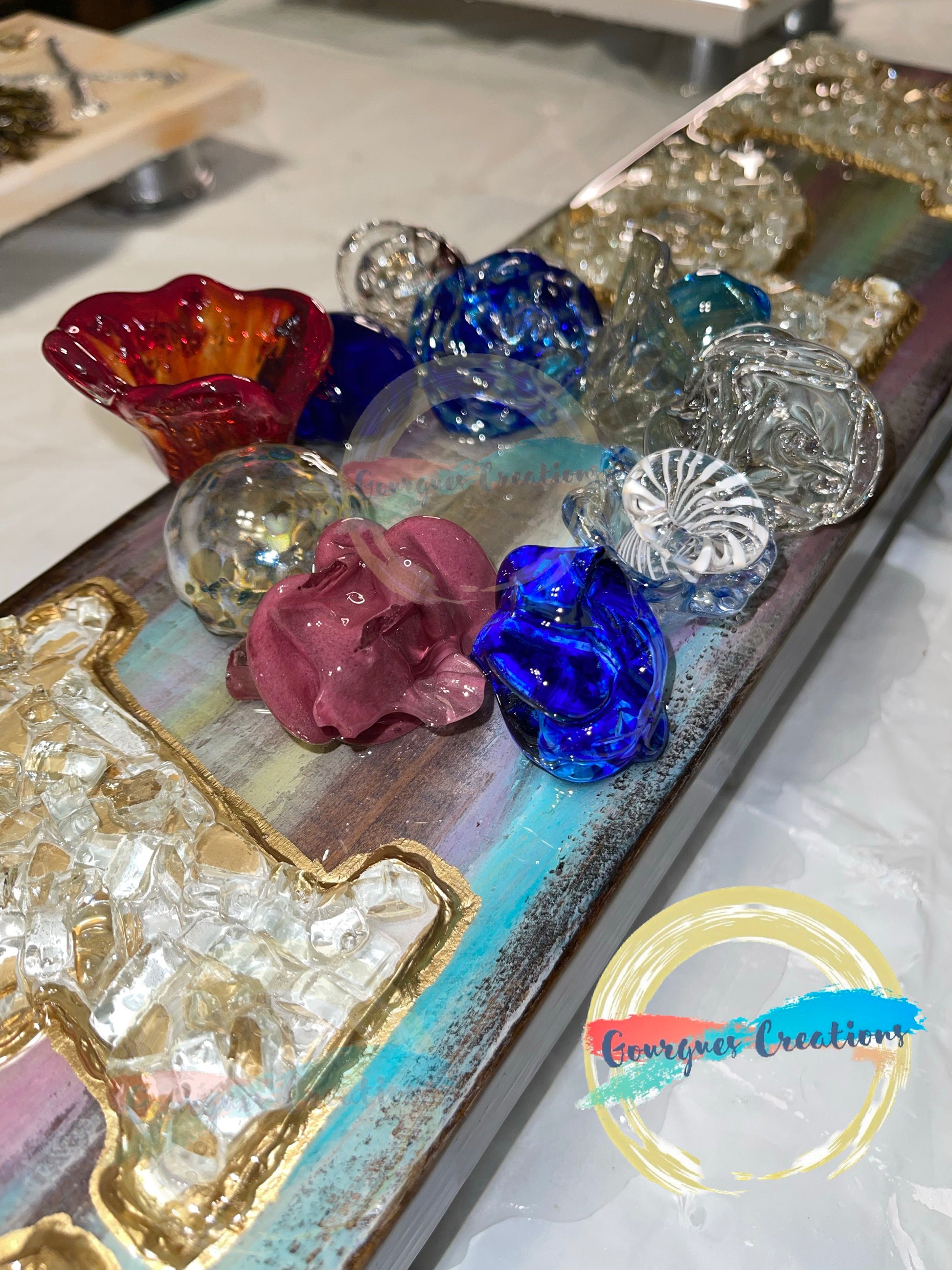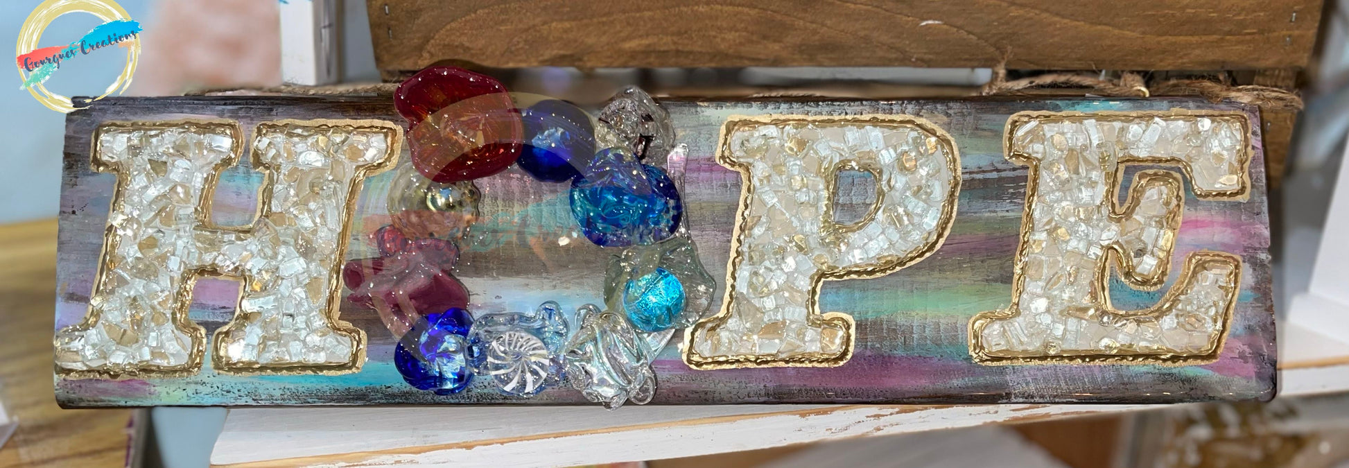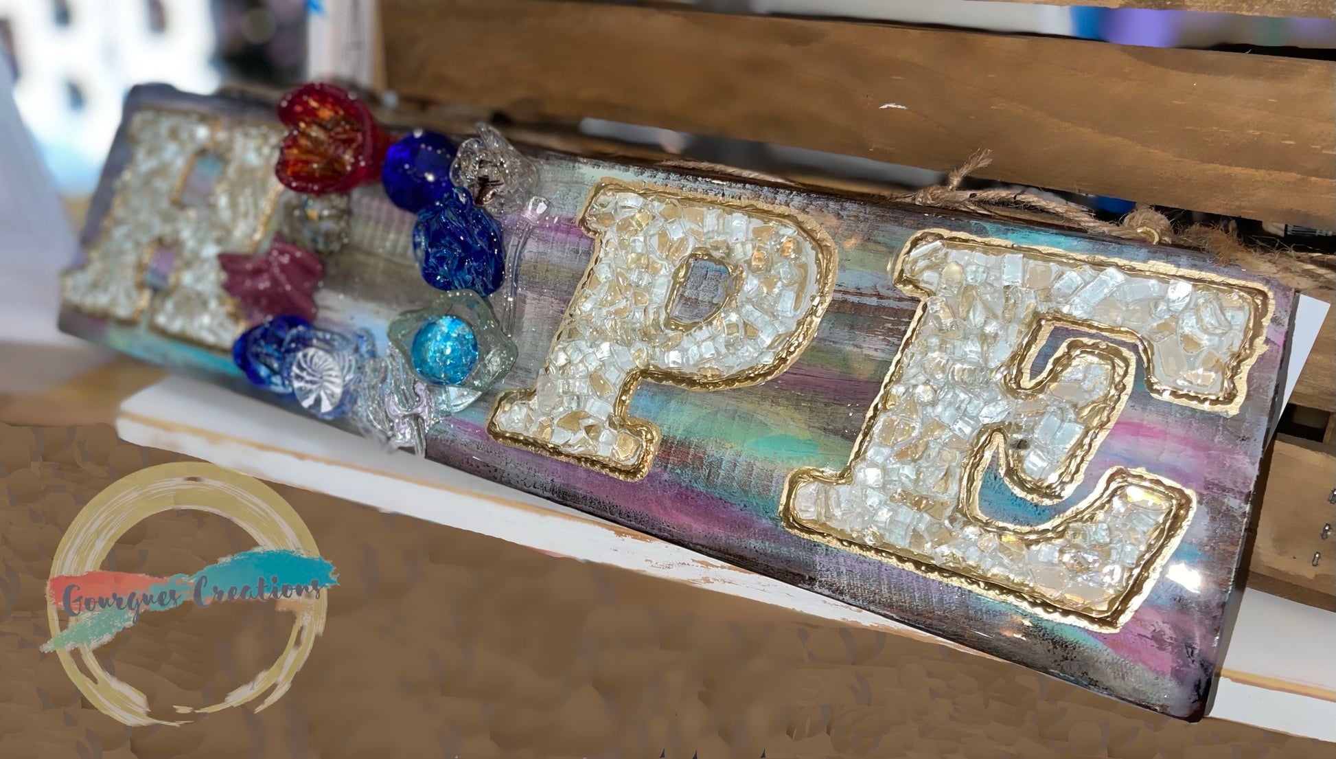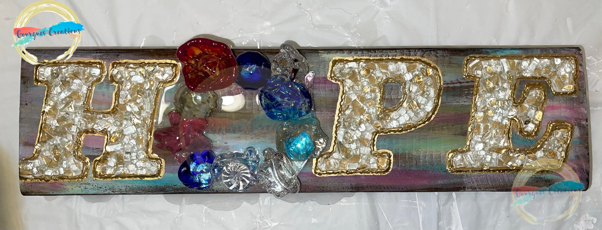 This beautiful flower of Hope bouquet is on a 6x20 inch piece of wood. The letter “O” is created with blown glass flowers and the other letters are painted white with broken glass. The entire piece is safely sealed with epoxy resin. This is a conversation starter and will be sure to impress all of your guest year round!!