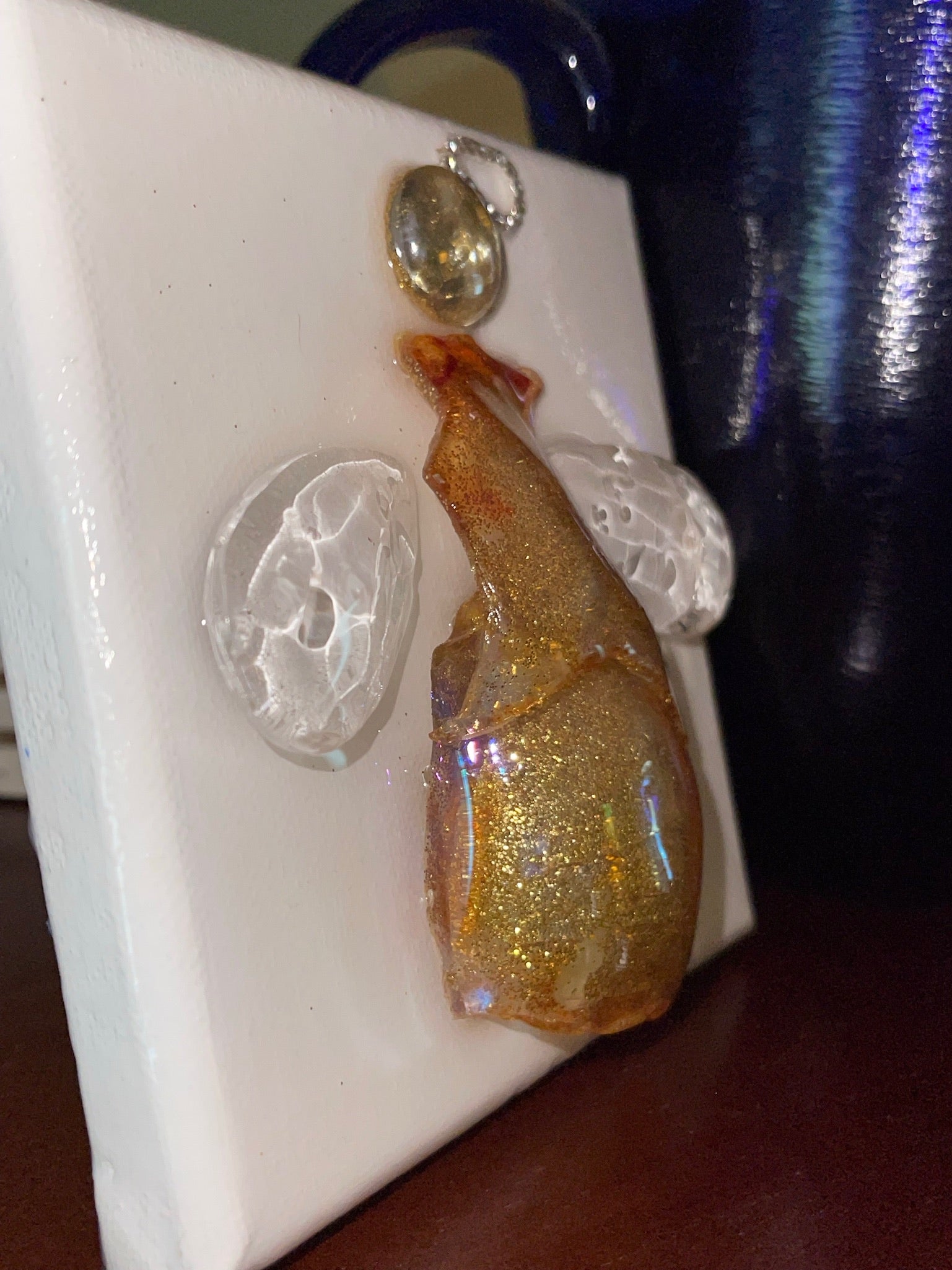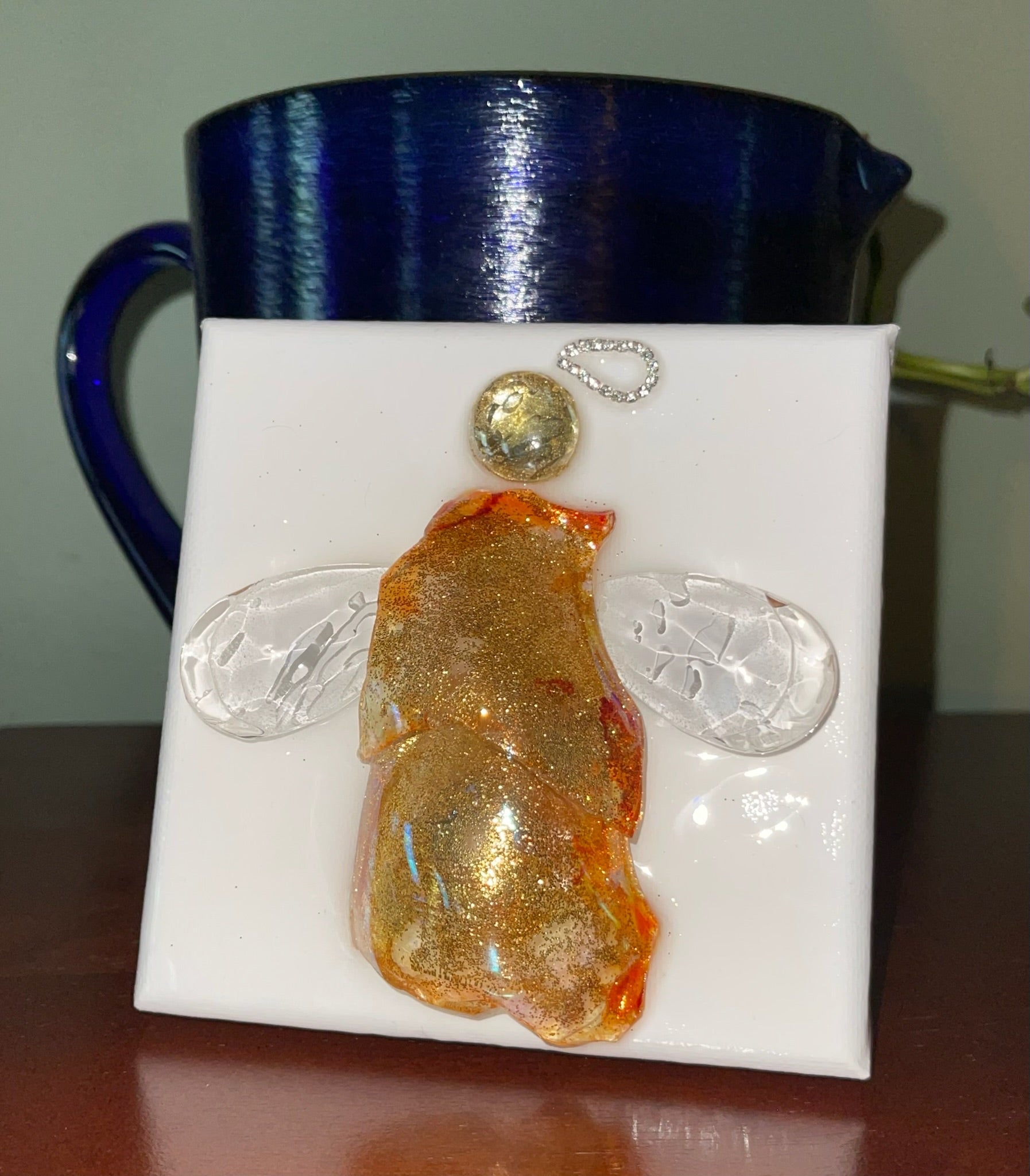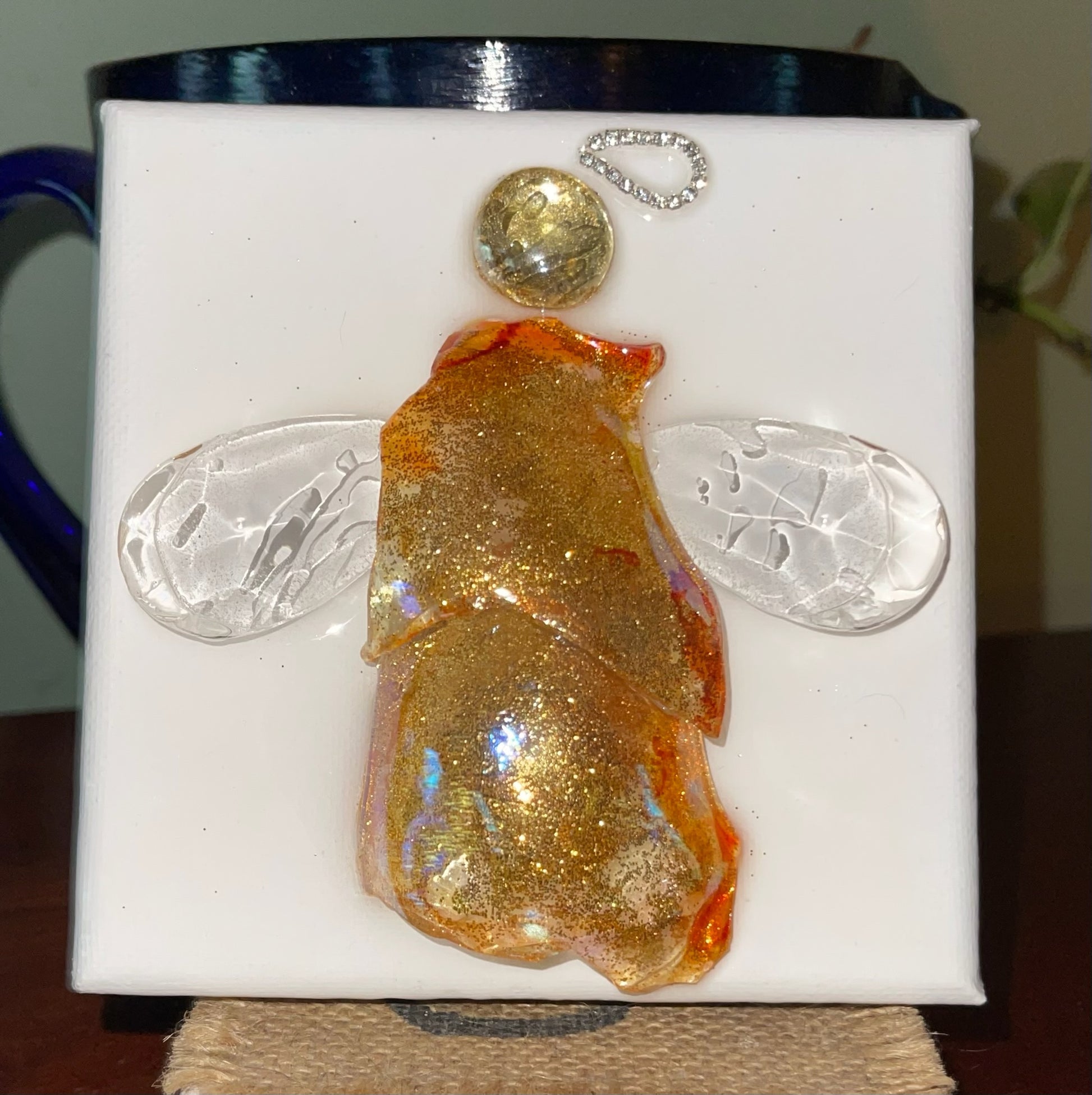 This beautiful angel is centered inside a 4x4 inch canvas and it is ready to hang or it is a great shelf sitter. The angels dress is made from hand cut glass, topped with an angelic halo & the entire piece is sealed with epoxy resin.