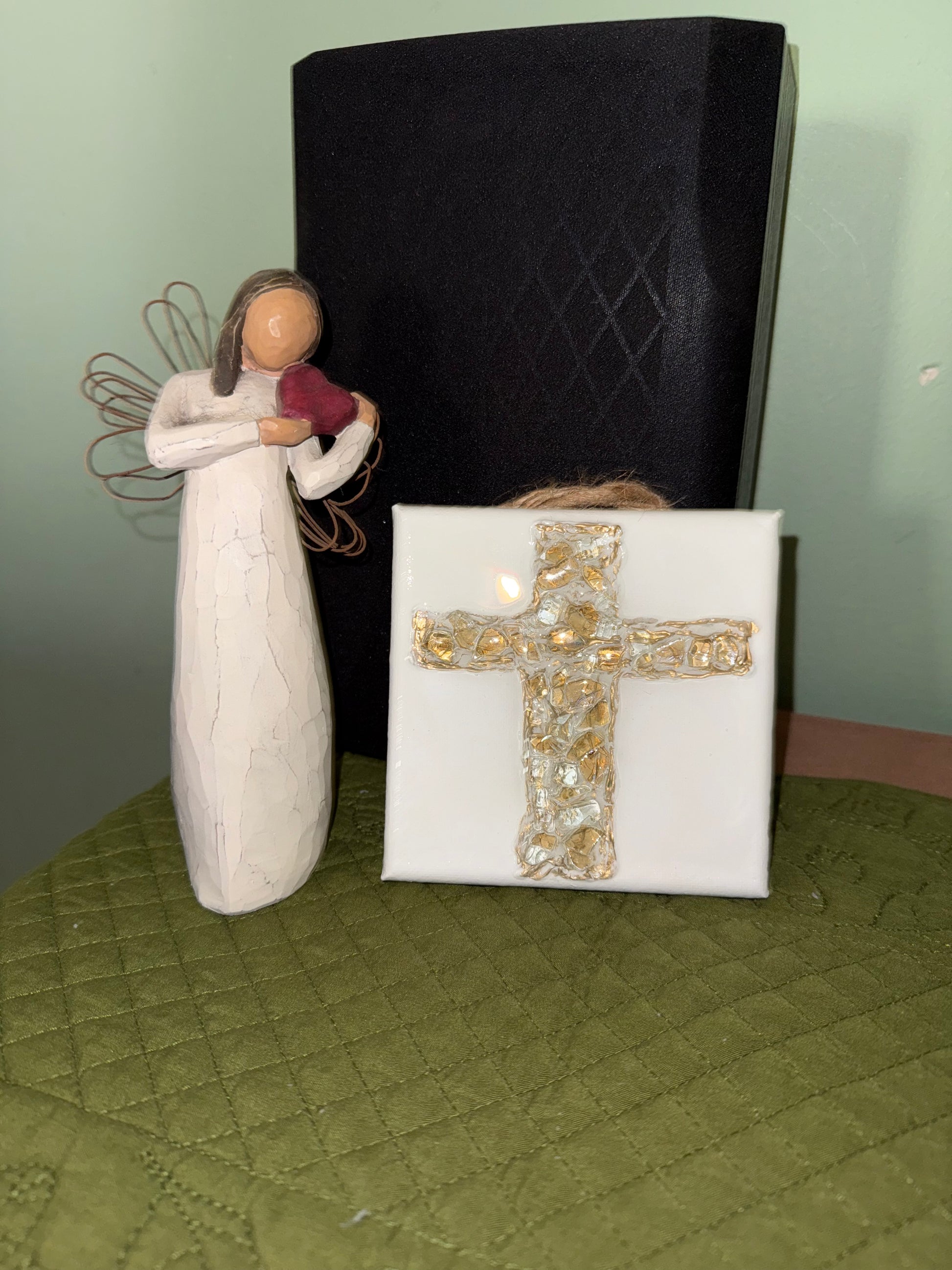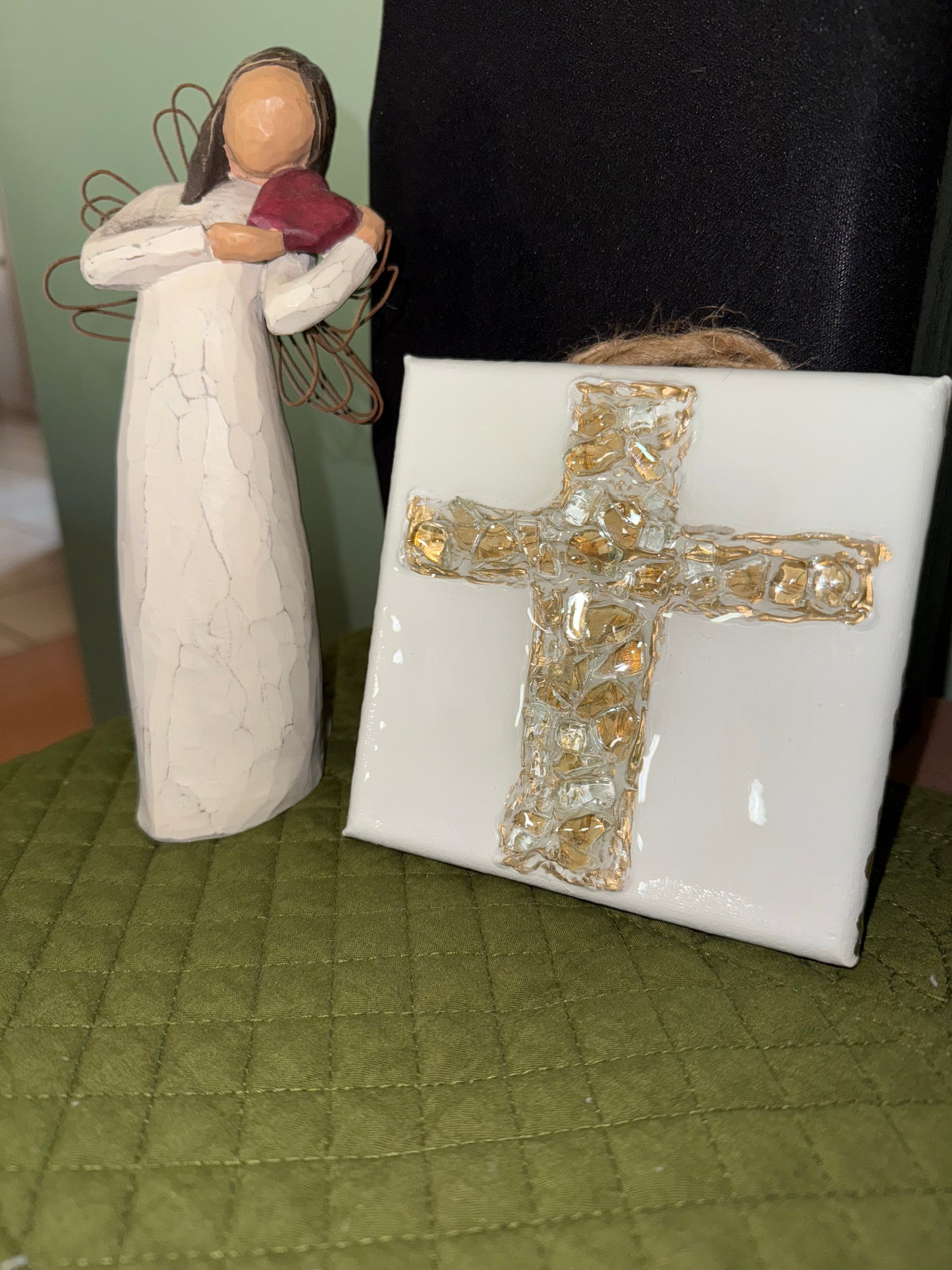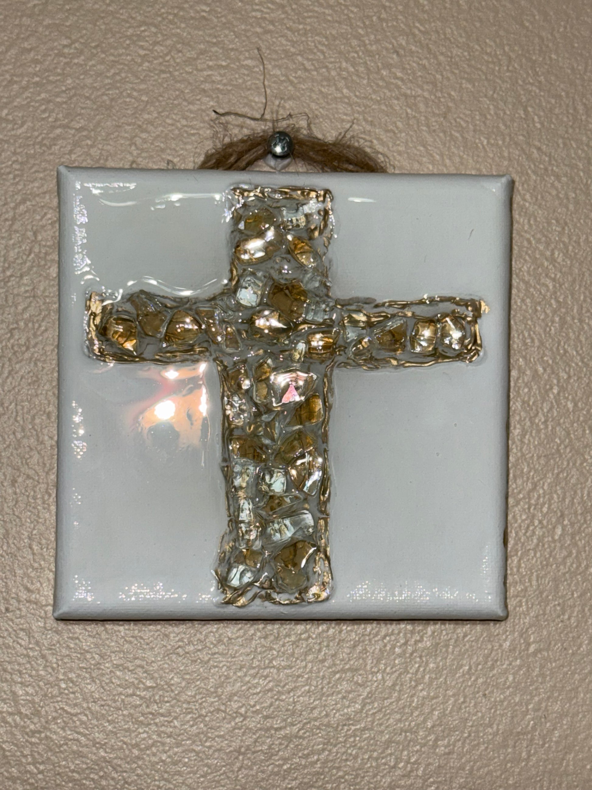 This beautiful glass cross is centered inside a 4x4 inch canvas and it is ready to hang or it is a great shelf sitter. The cross is made from crushed glass & the entire piece is sealed with epoxy resin.