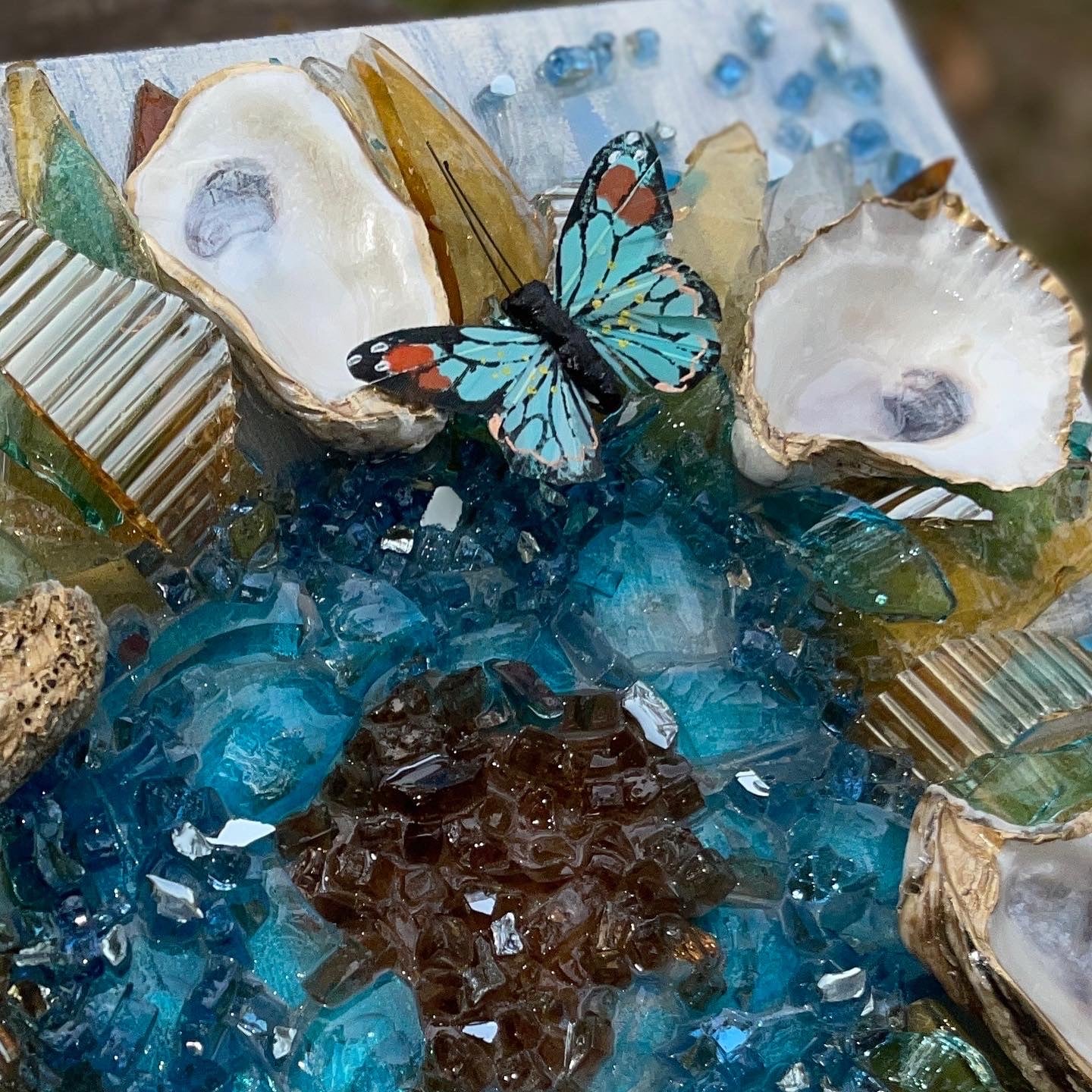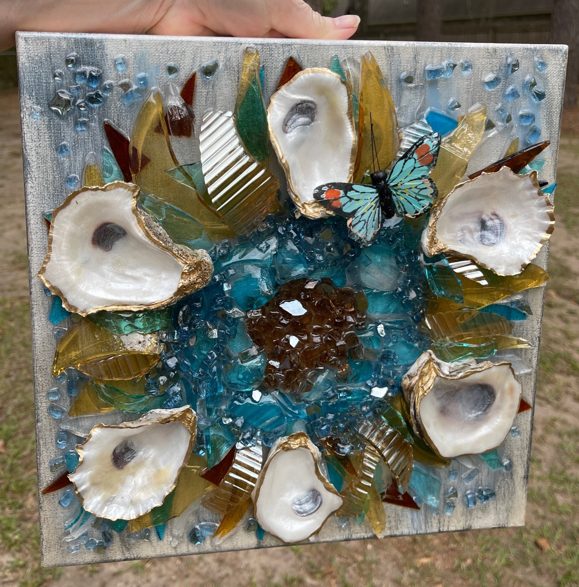 This beautiful Coastal inspired sunflower is on a 12x12 gallery wrapped canvas. This one of a kind original will be sure to be a favorite for everyone. It is truly a one of a kind work of art because of the OYS shell & glass combination.