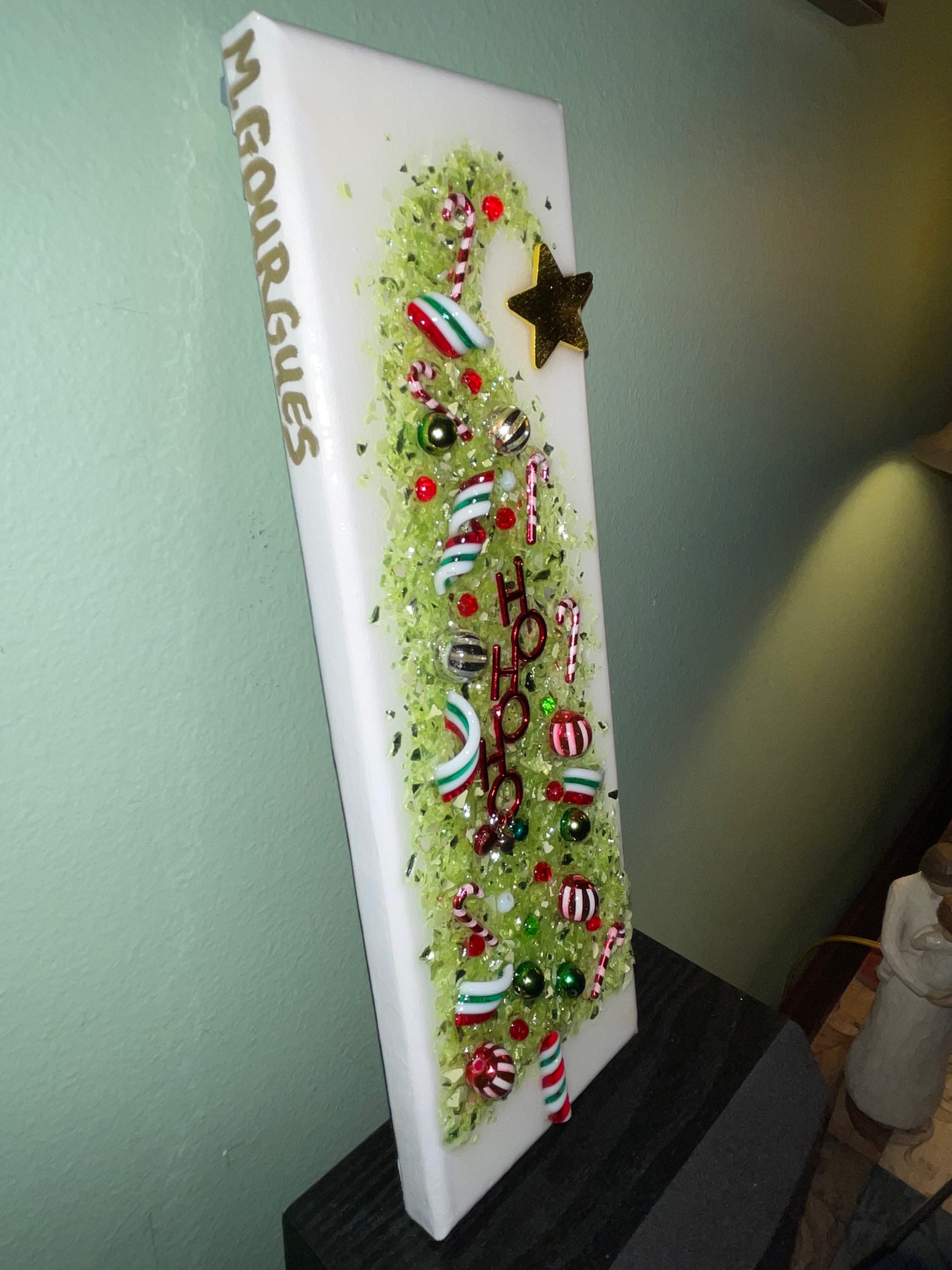 Each piece is created on a 4x12 canvas, painted with acrylic paints with hand cut glass, broken glass accents and a beautiful starfish at the top.
