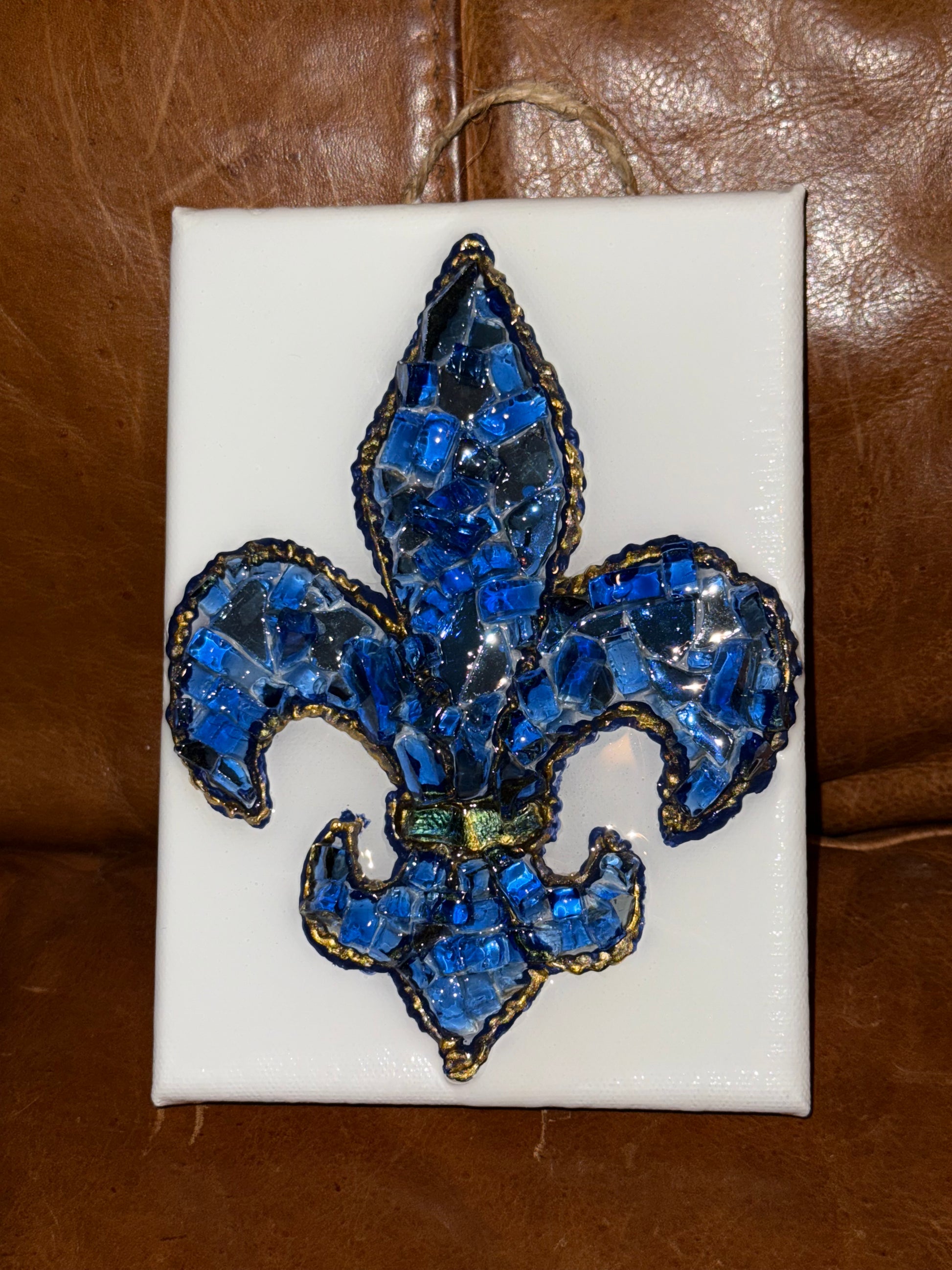 Elegant yet impactful, this small Fleur De Lis art piece features a unique acrylic epoxy resin poured over broken glass accents. Ready to hang.