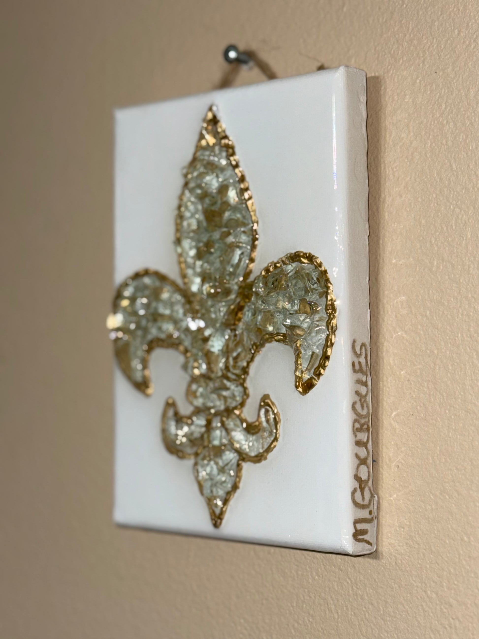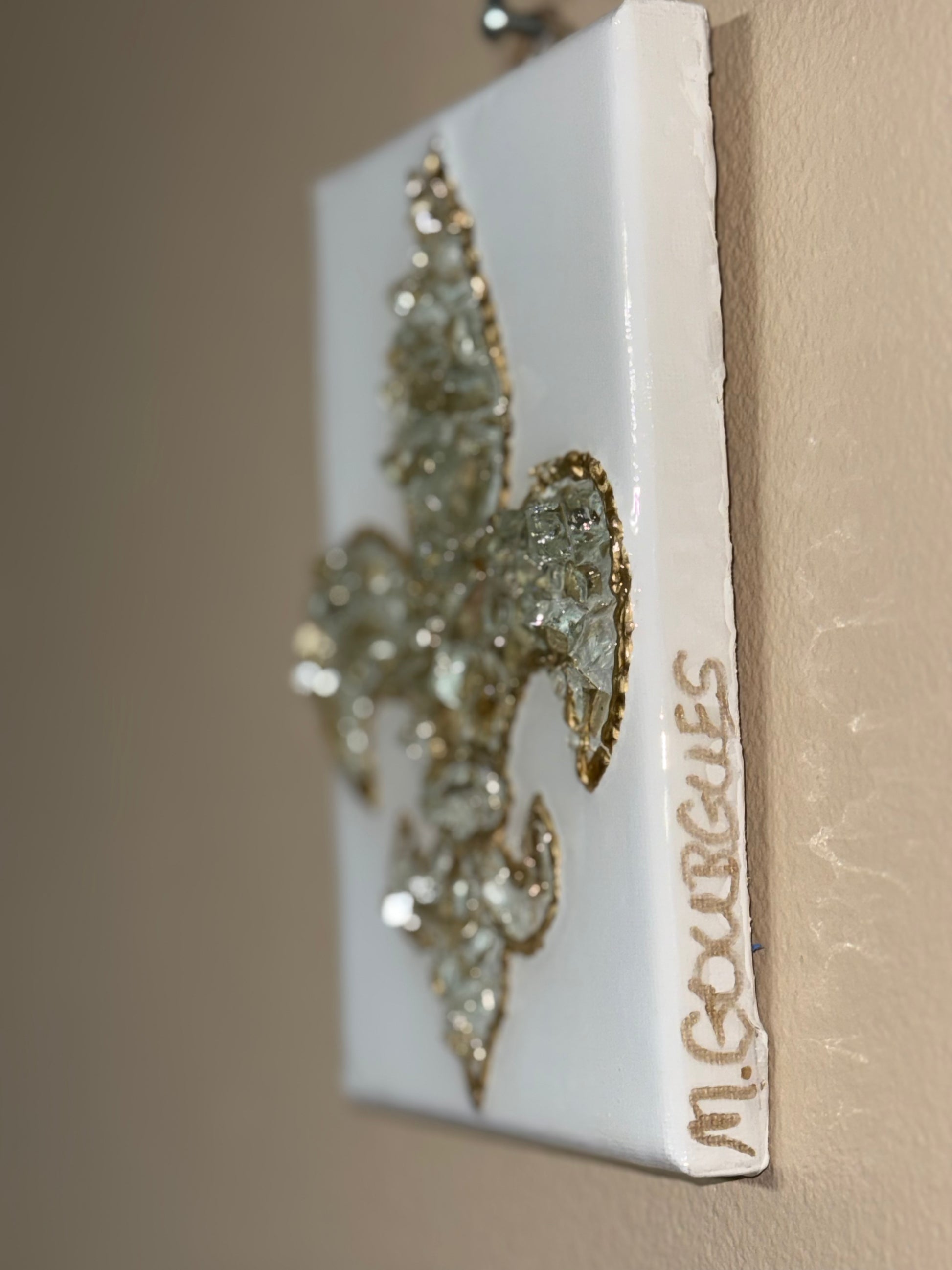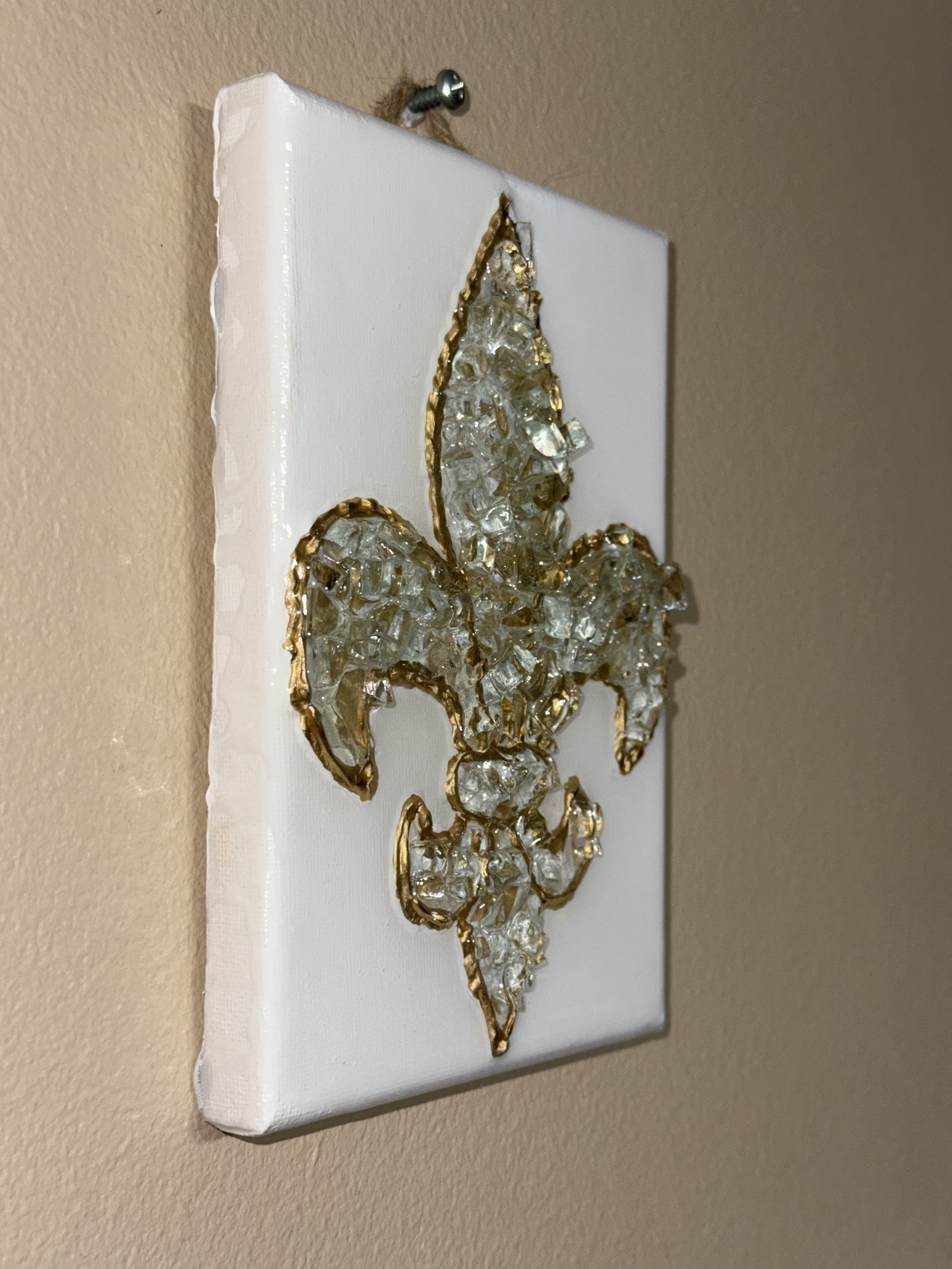 Elegant yet impactful, this small Fleur De Lis art piece features a unique acrylic epoxy resin poured over broken glass accents. Ready to hang.