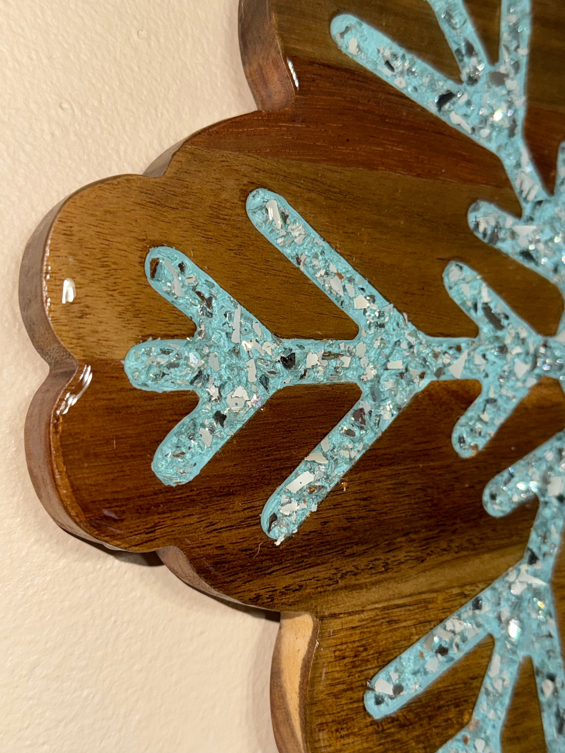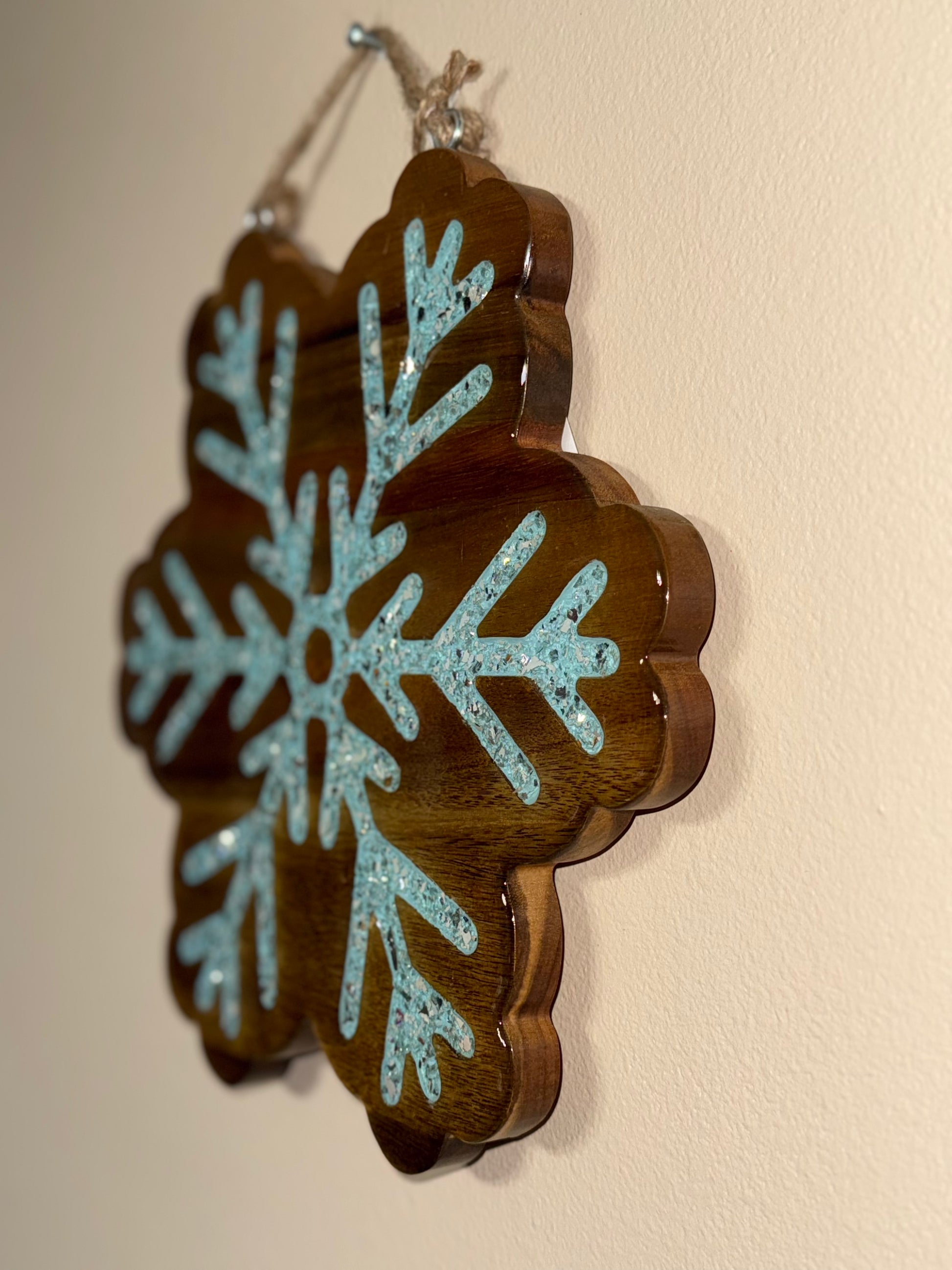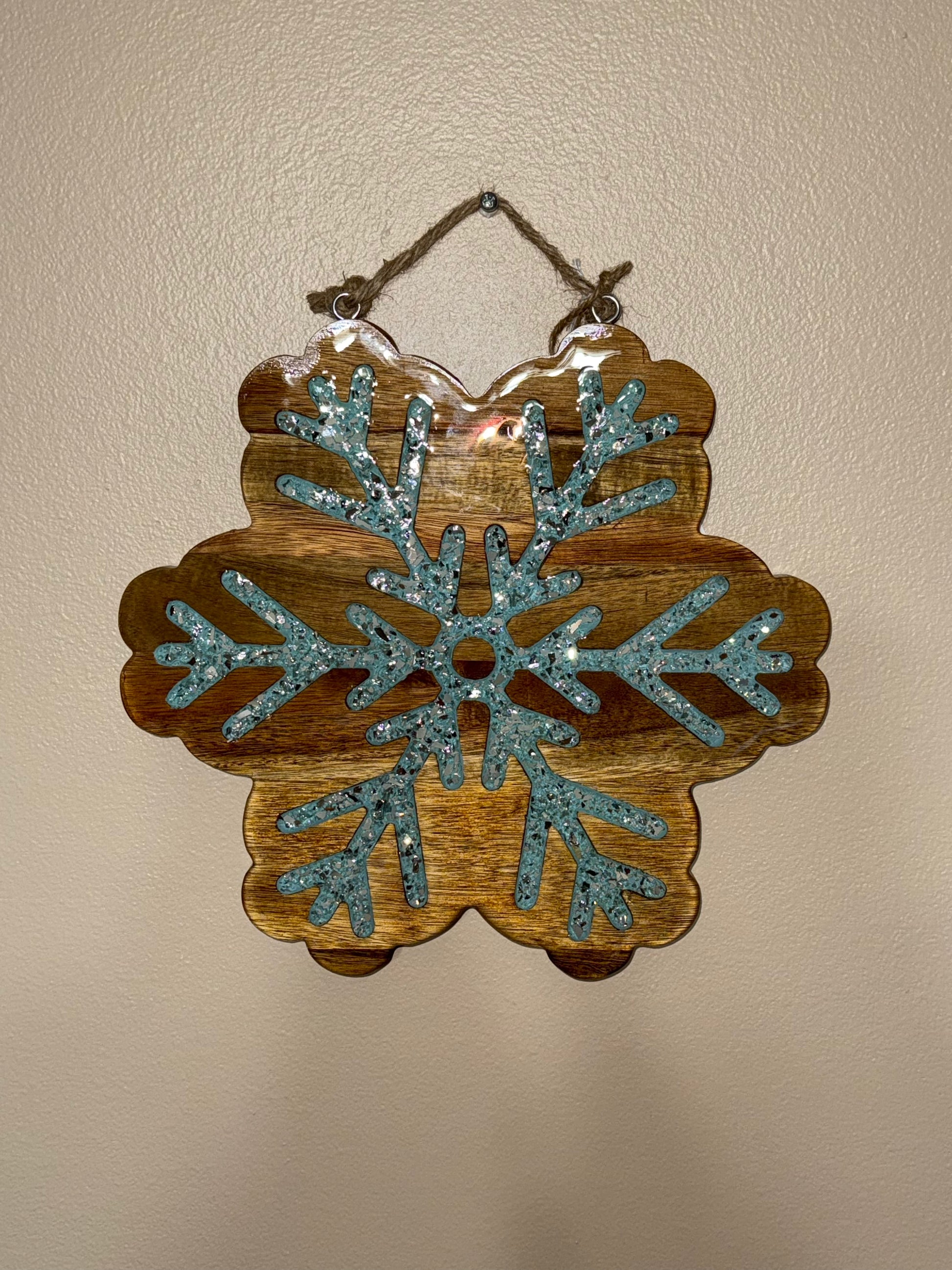 This beautiful wooden snowflake was hand painted with acrylic paints, embellished with crushed glass and sealed with epoxy resin. This beauty is ready to hang in your favorite spot & it sure to make you smile.