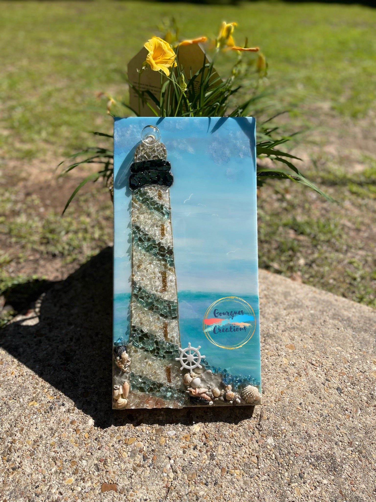 These beautiful lighthouses are hand painted with acrylics covered with glass. The shore that the lighthouse sits on is covered with sand & shells from the beach.