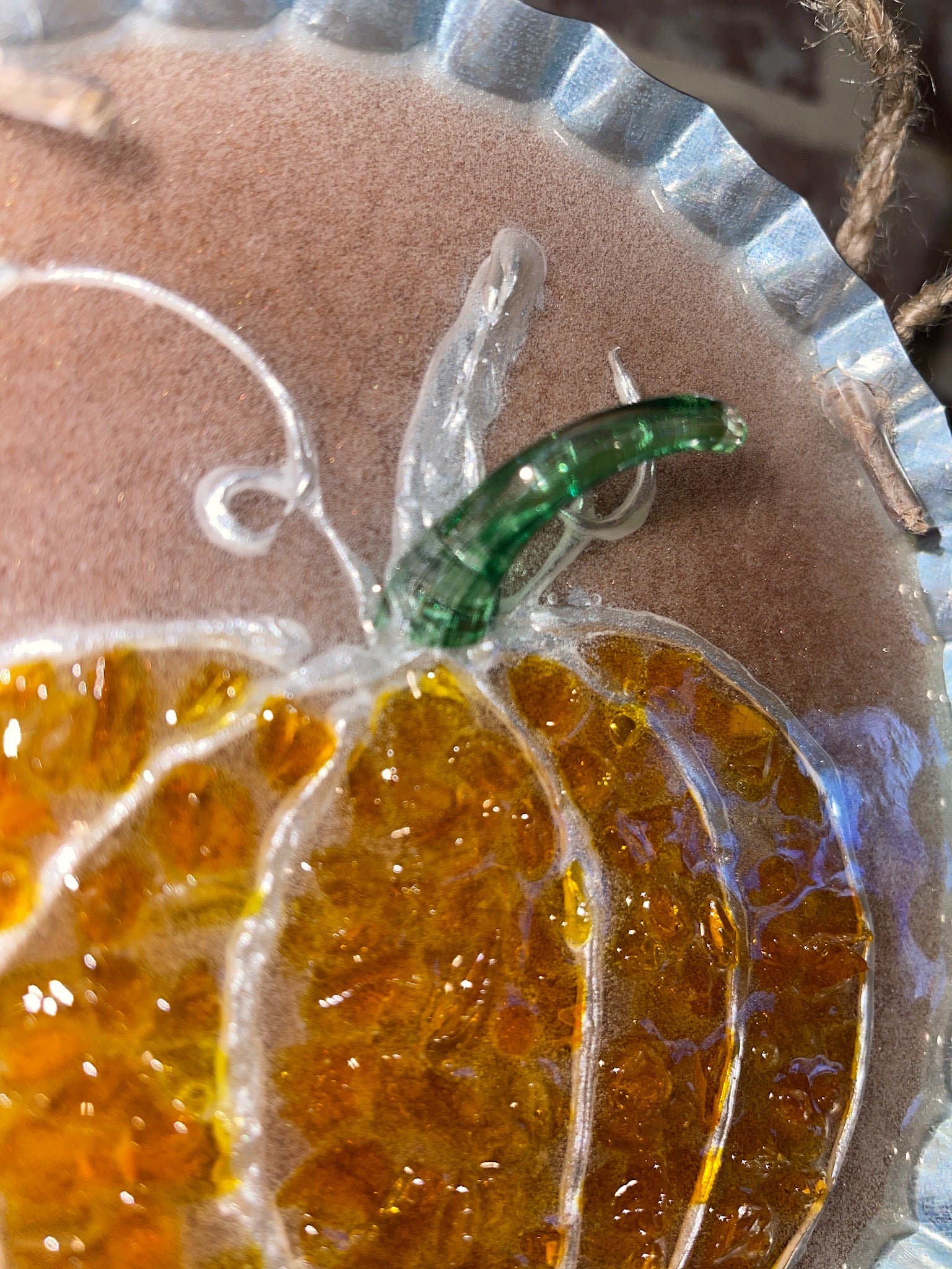 This beautiful little pumpkin has a silver outline & it is drizzled with broken glass. It is ready to hang for all your family and friends to admire. The inside is made up of an epoxy pour and then the entire inside is sealed with epoxy resin.