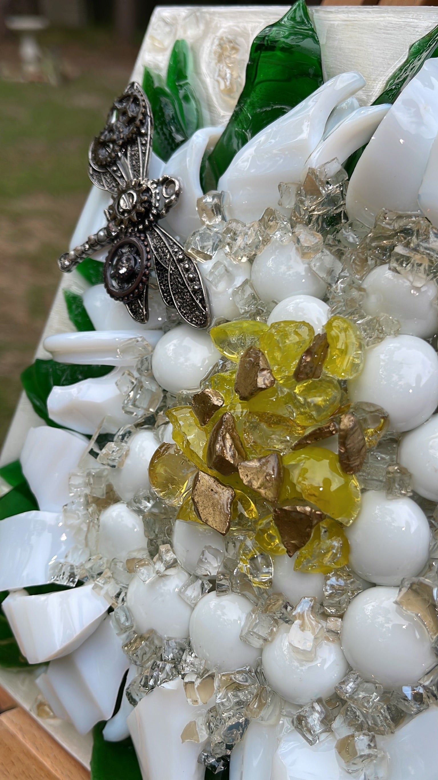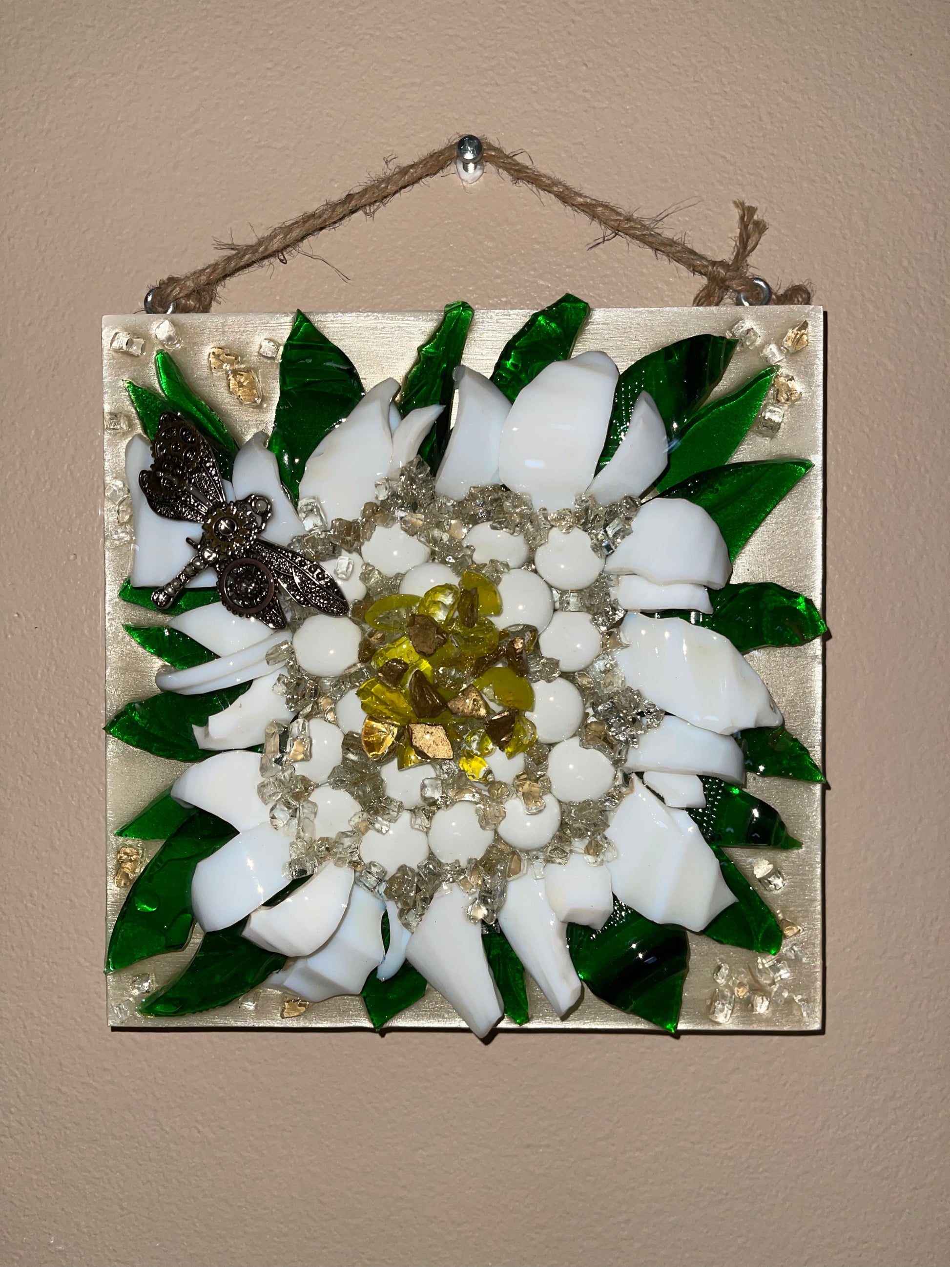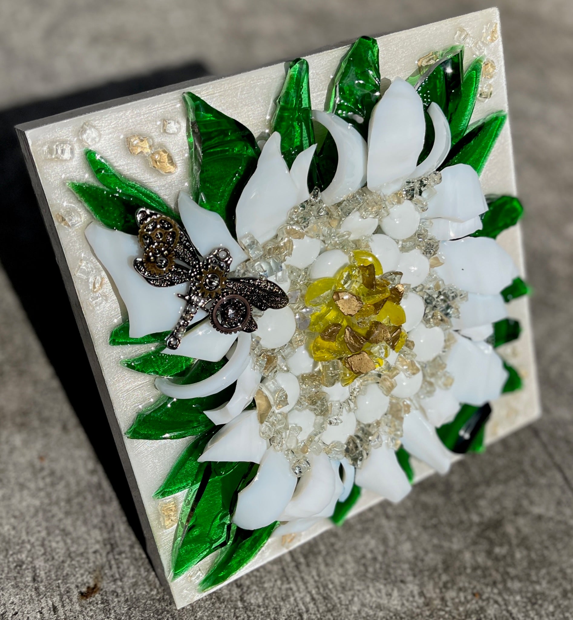 This beautiful magnolia flower has been created on a wood panel canvas. If you look really close, you will find a special accessory. Each one is individually painted with acrylics, topped with hand cut glass, broken glass and sealed with epoxy resin.