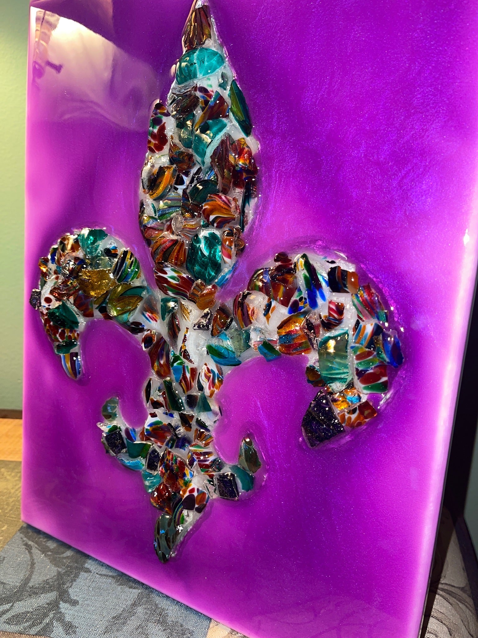 This Mardi Gras inspired Fleur De Lis will makes a big statement in any room! This piece was made with tinted epoxy resin and it was poured around the broken glass accents in the center of the fleur de lis. It is ready to hang or it can be a leaning shelf sitter.