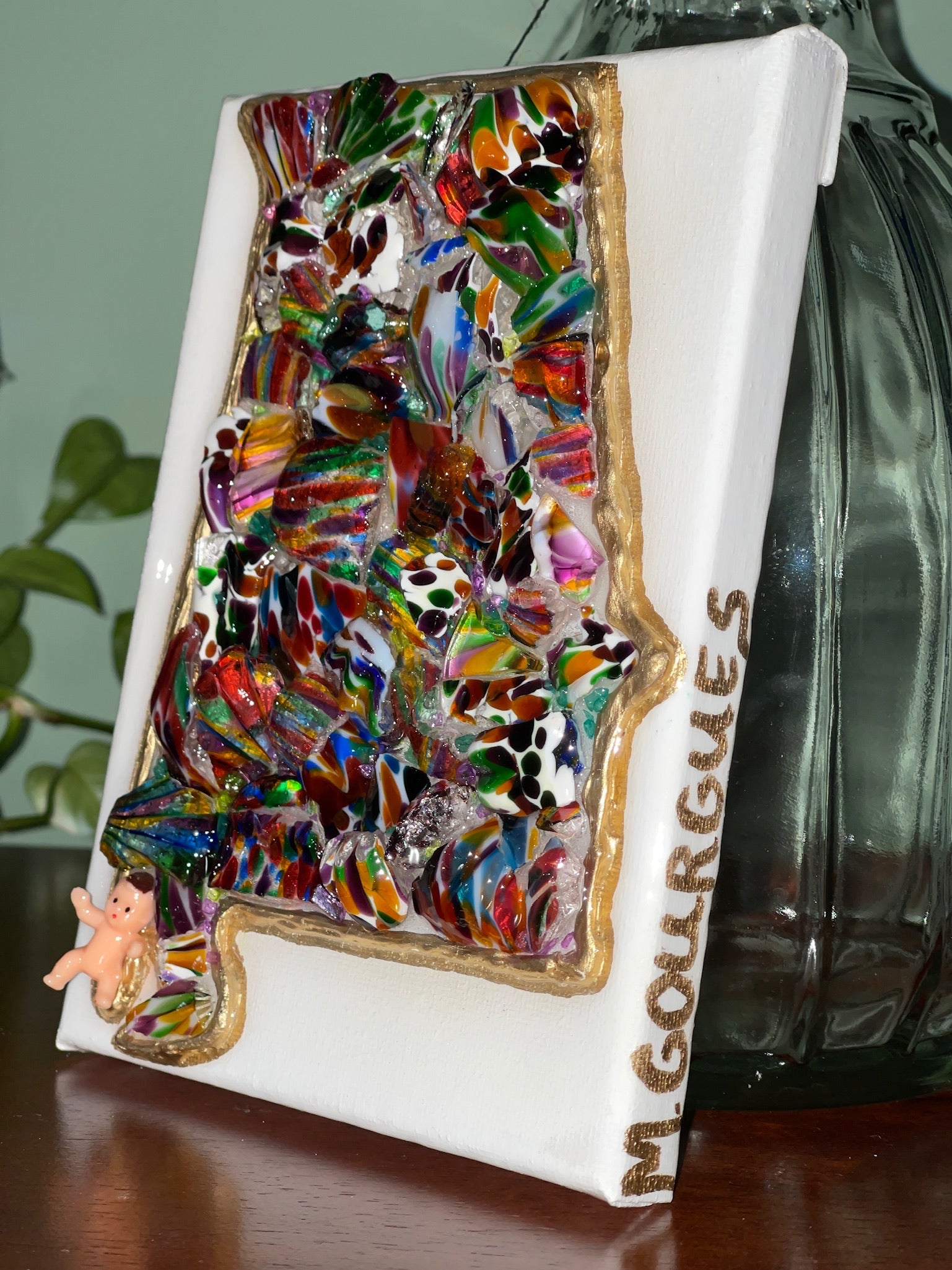 These stunning piece was created with hand blown glass, a Mardi Gras king cake baby and sealed with epoxy resin.
