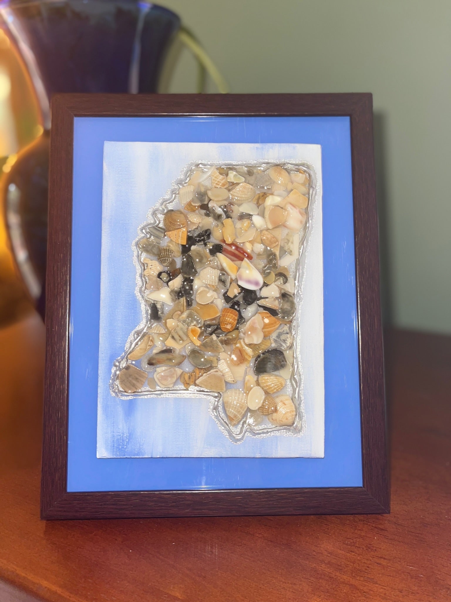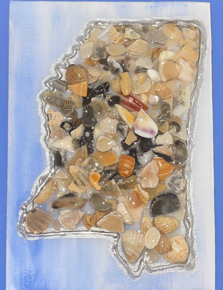 The state of MS was created using textured paste, crushed seashells from along the gulf coast & the entire piece is sealed with epoxy resin.