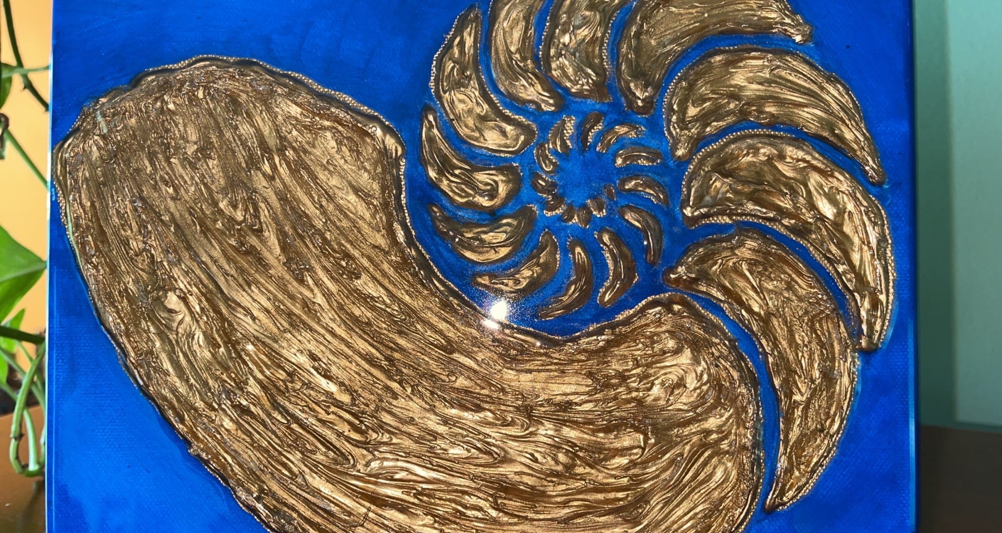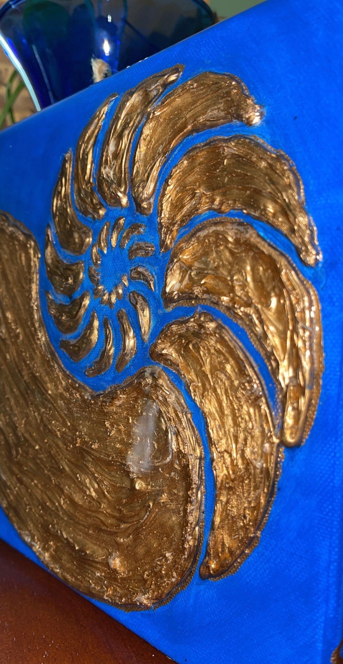 This beautiful mixed media, seashell inspired piece is sure to make a big statement Navy blue background with the gold shell in the center of an 8x10 inch canvas that is sealed with epoxy resin.