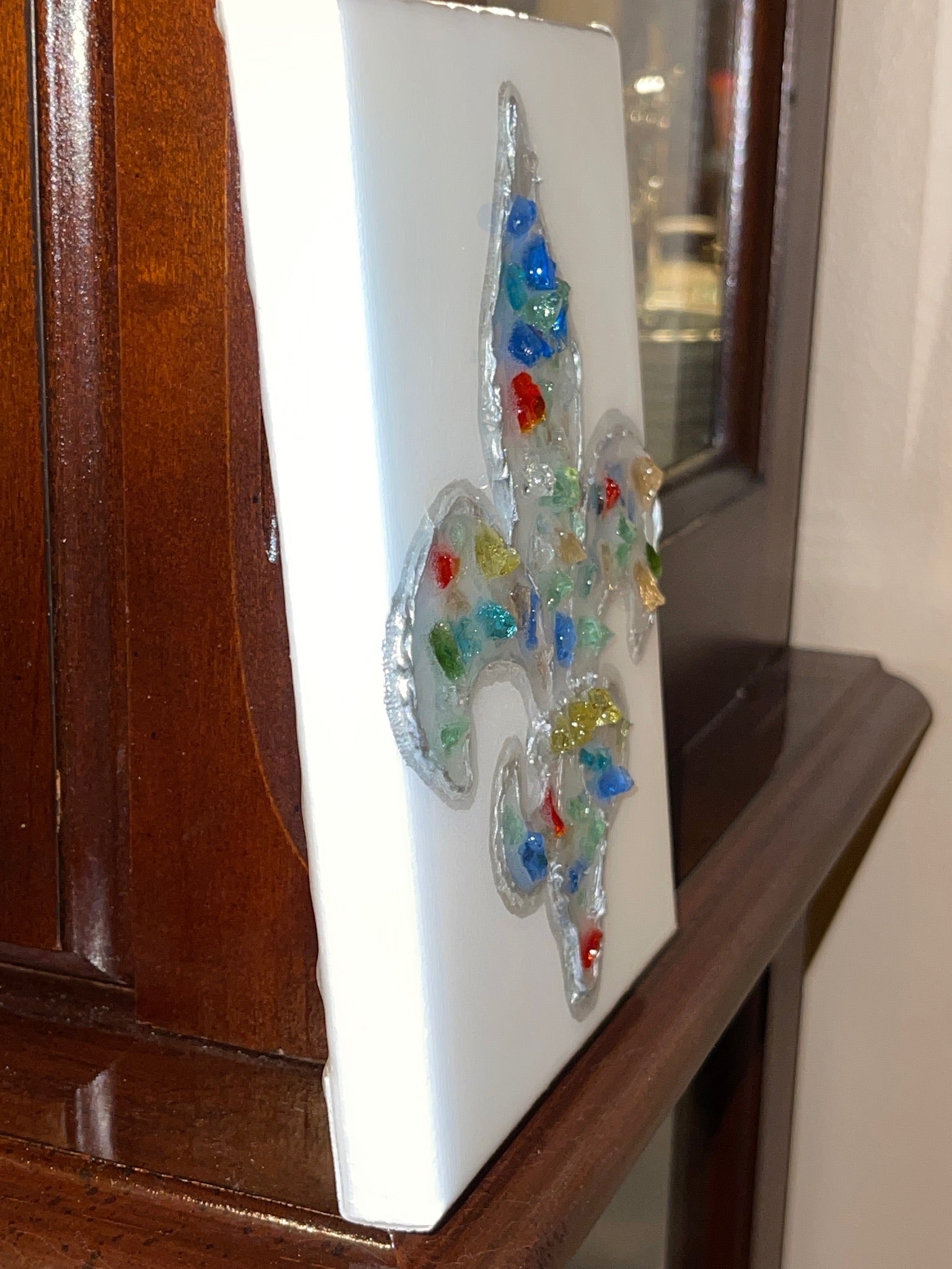 Elegant yet impactful, this small Fleur De Lis art piece features a unique acrylic epoxy resin poured over broken glass accents. Ready to hang.