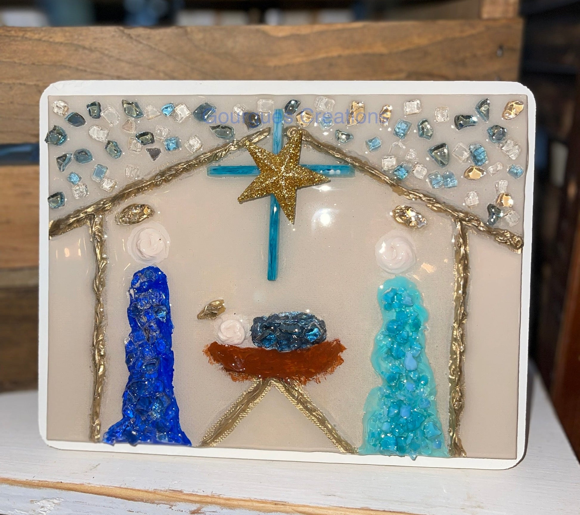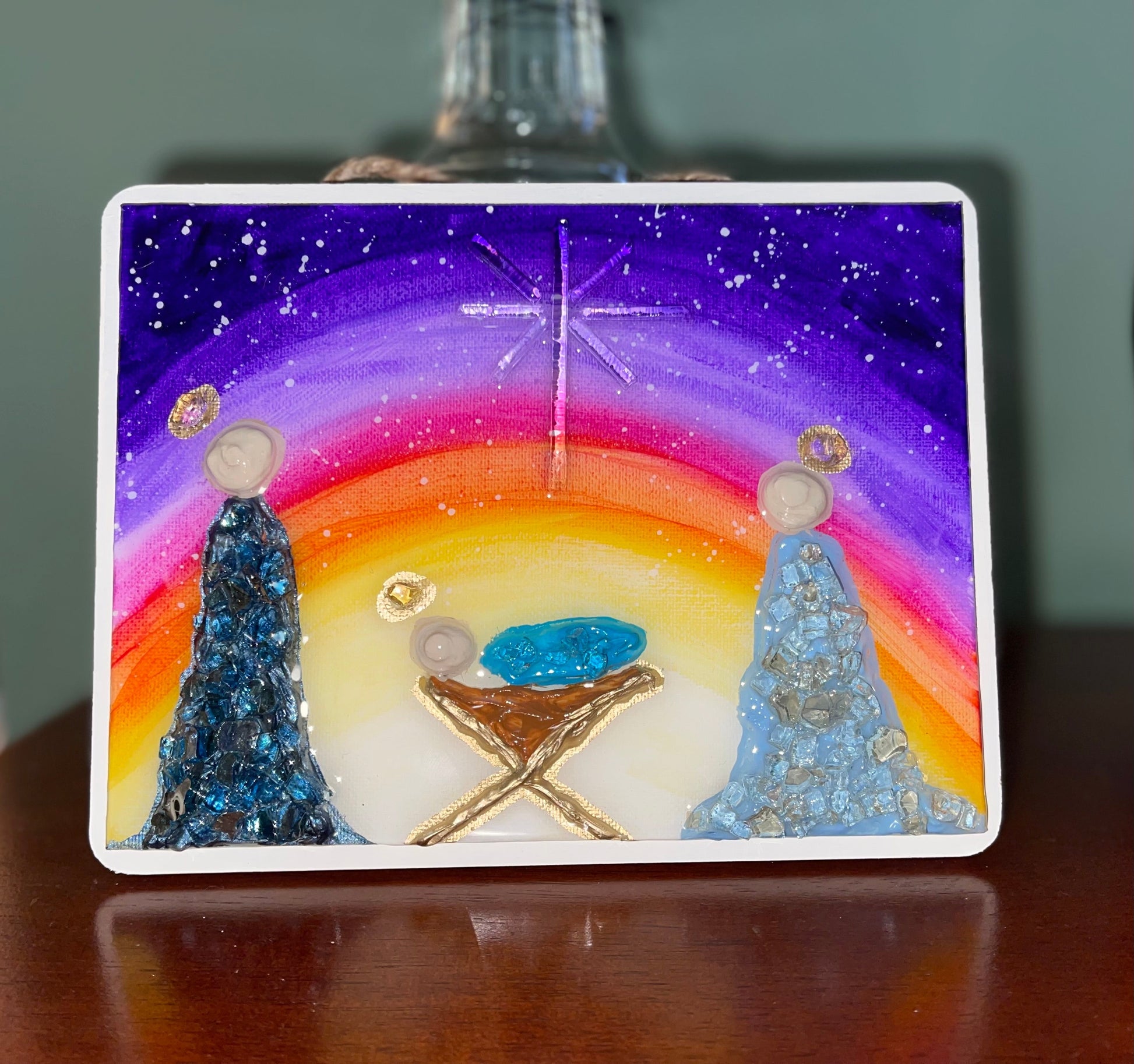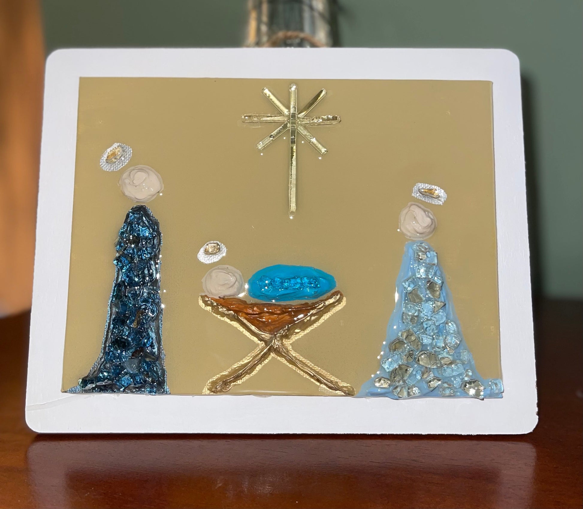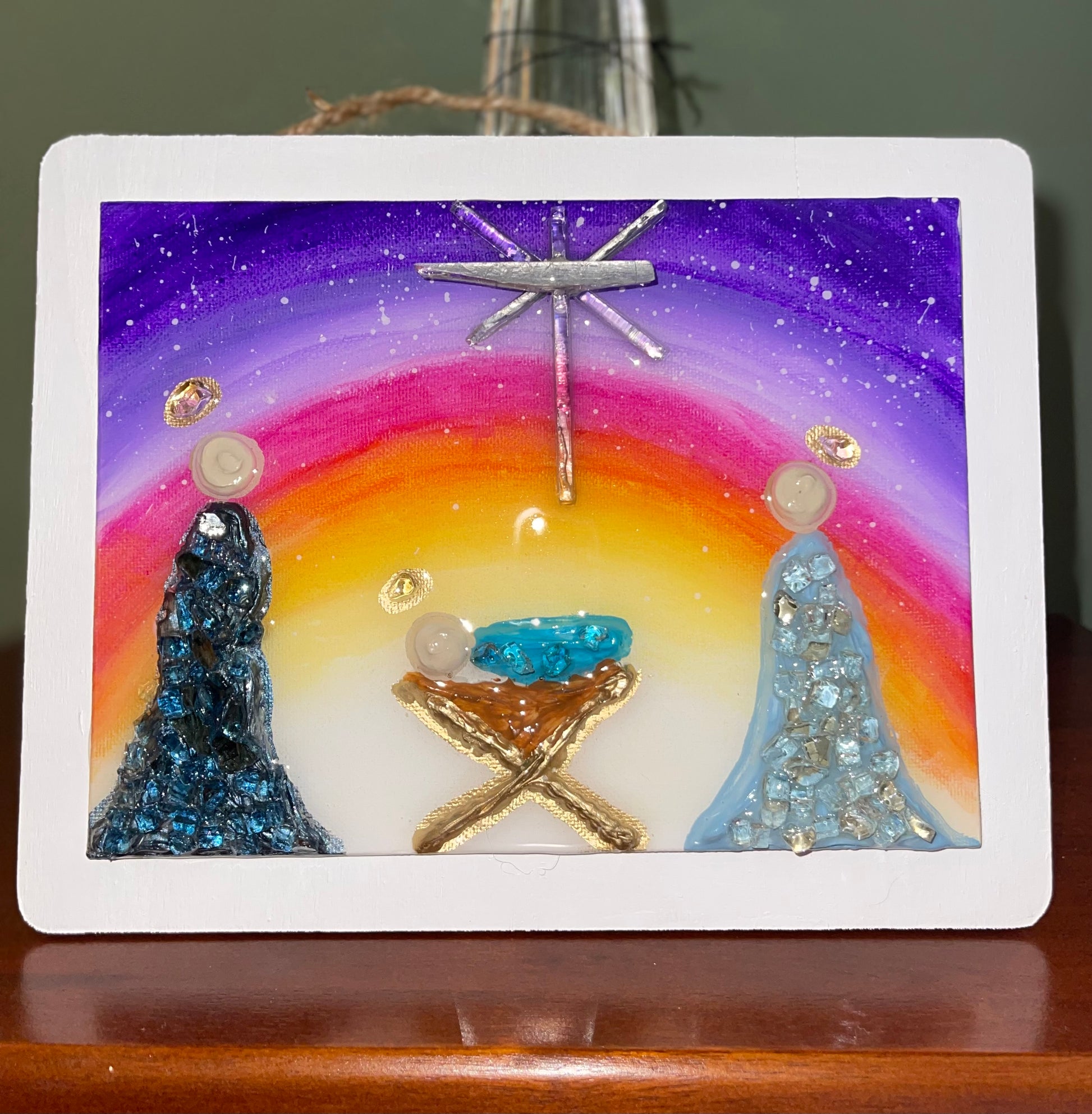 It was created on a 6x8 canvas panel with acrylic paint, texture paste, cut & broken glass and sealed with epoxy resin. This precious representation of a magical birth is on a 6x8 inch canvas & securely attached on top of a wooden picture frame.