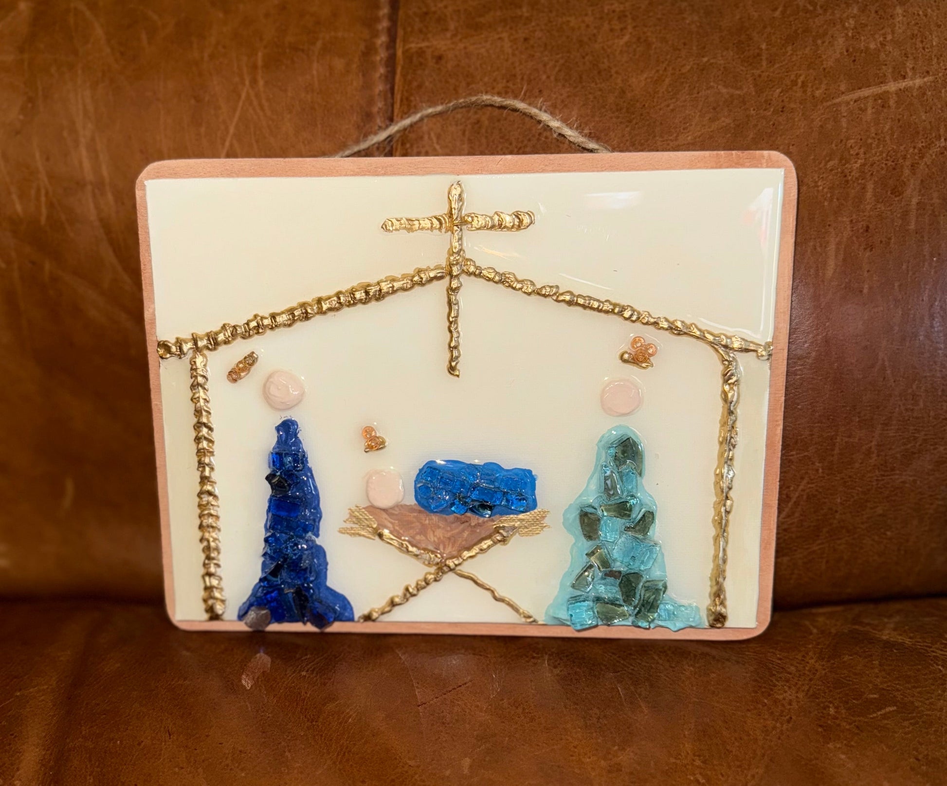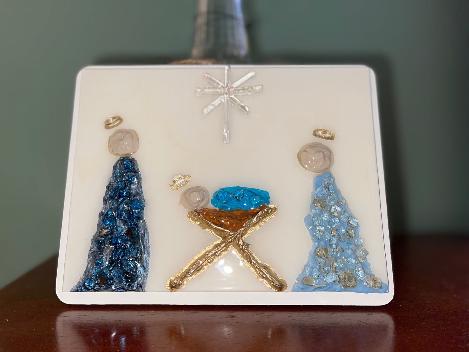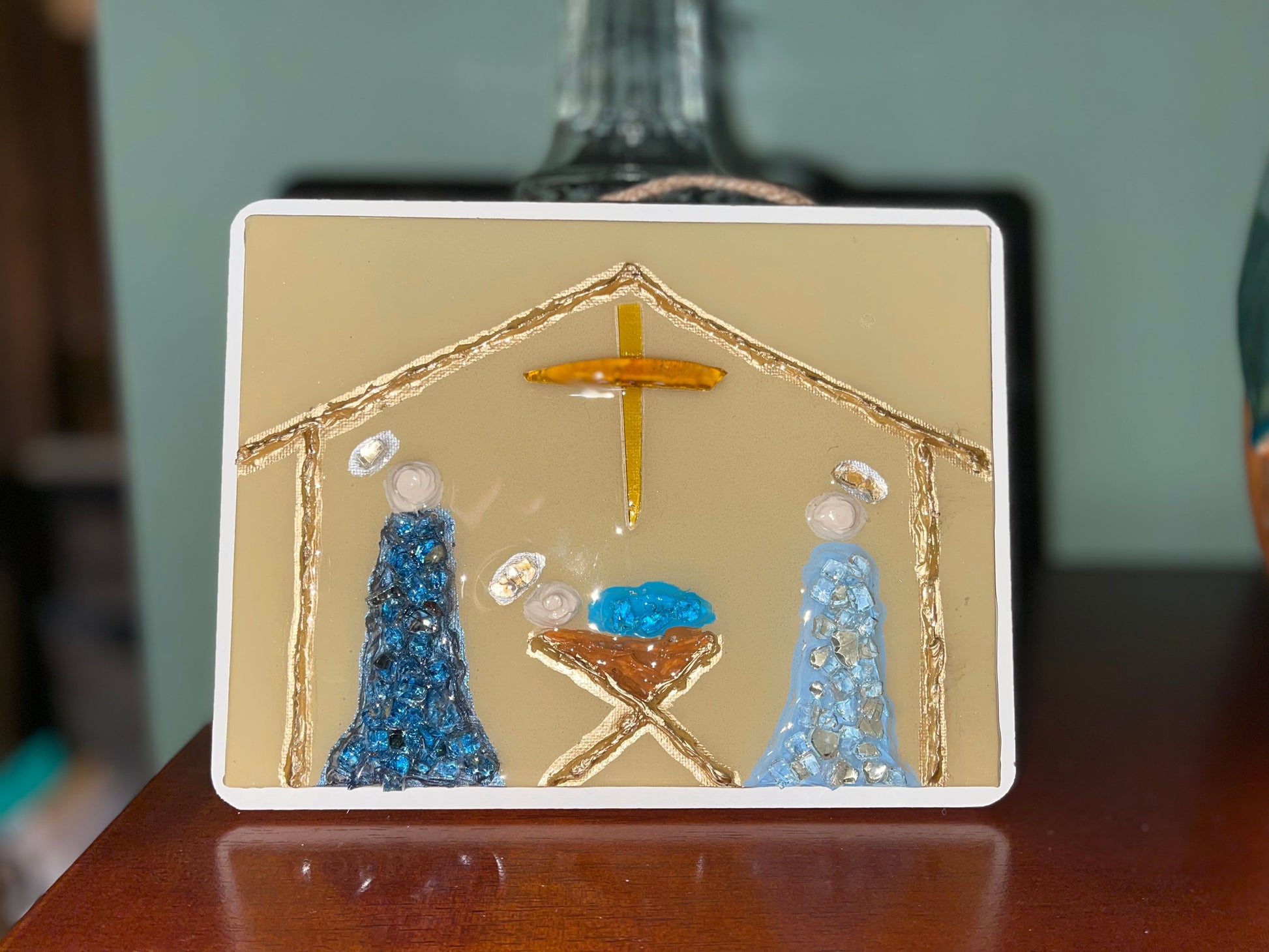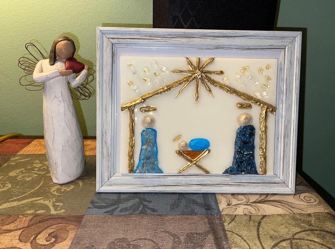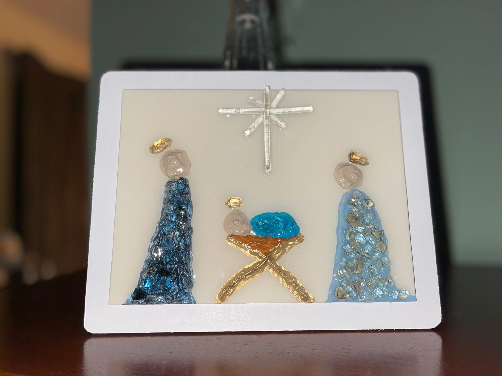 It was created on a 6x8 canvas panel with acrylic paint, texture paste, cut & broken glass and sealed with epoxy resin. This precious representation of a magical birth is on a 6x8 inch canvas & securely attached on top of a wooden picture frame.