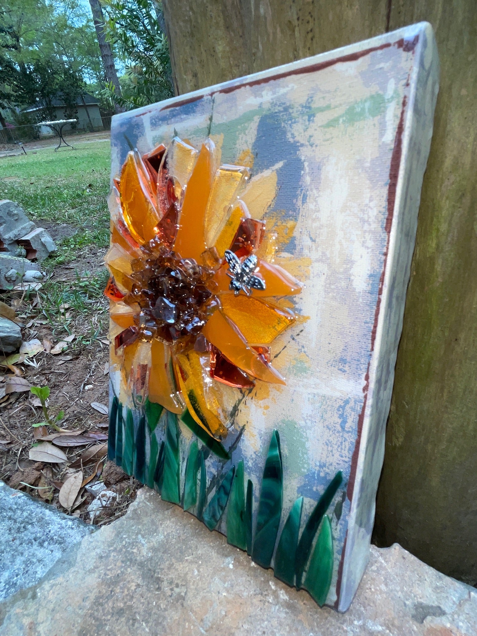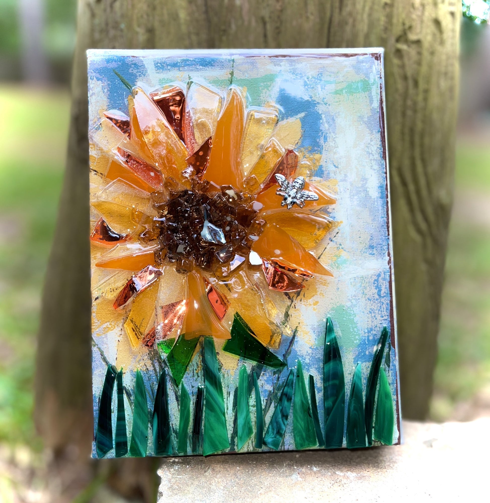 The sunflower is made with hand cut glass, broken glass and sealed with epoxy resin.