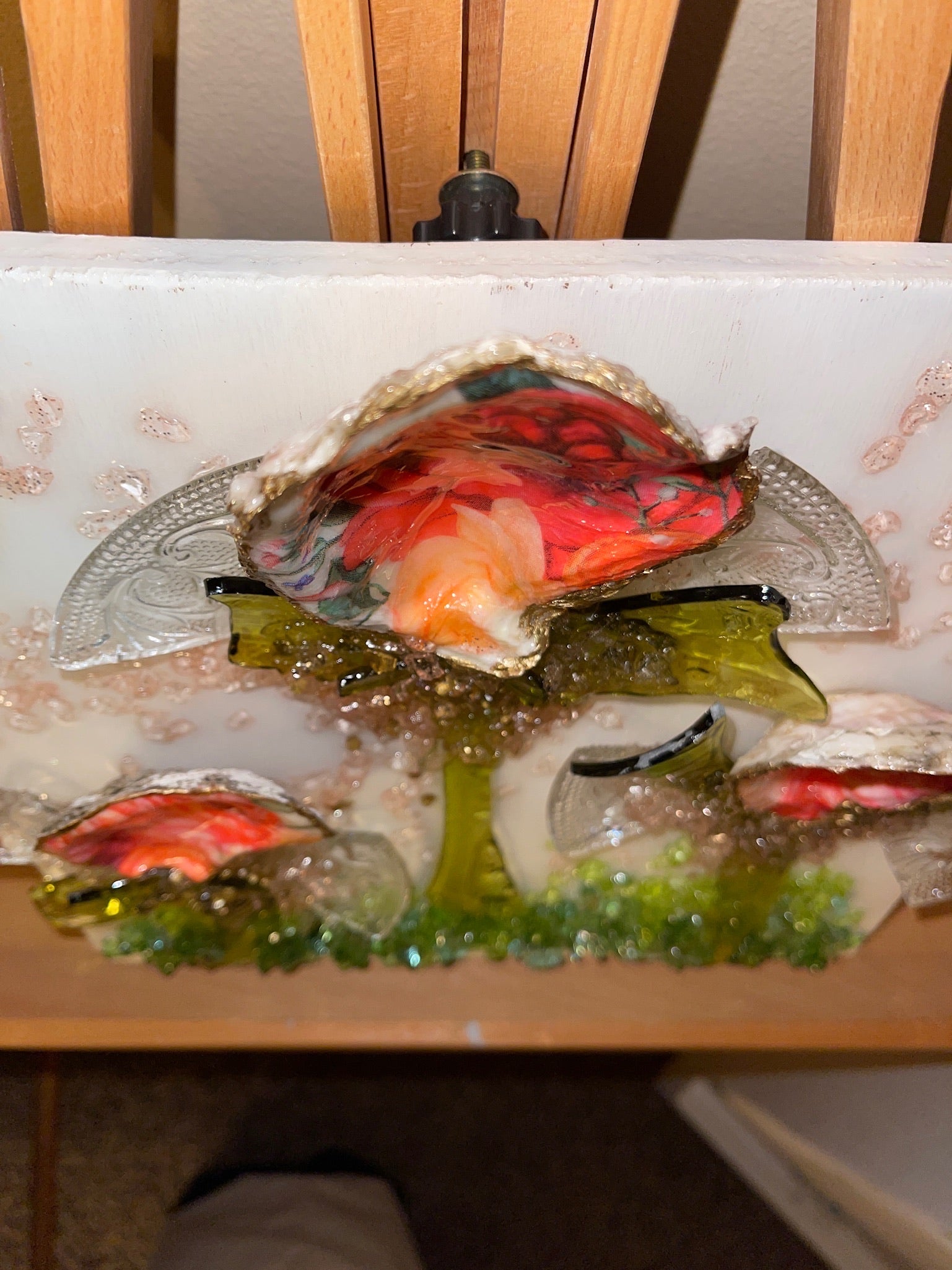 This beautiful OYS shell flower bouquet has decoupaged OYS shells, hand cut and broken glass that are all safely sealed with epoxy resin.