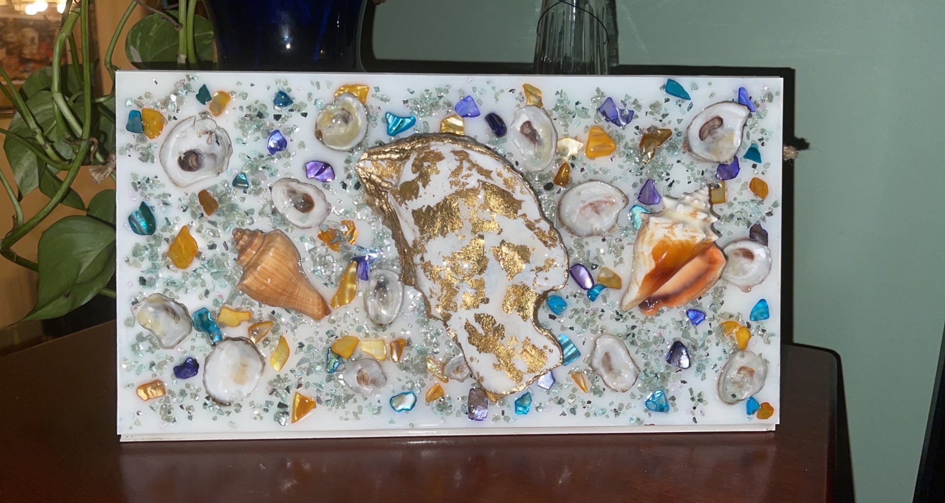 This beautiful OYS shell piece is surrounded by small conch shells, color seashells and glass.