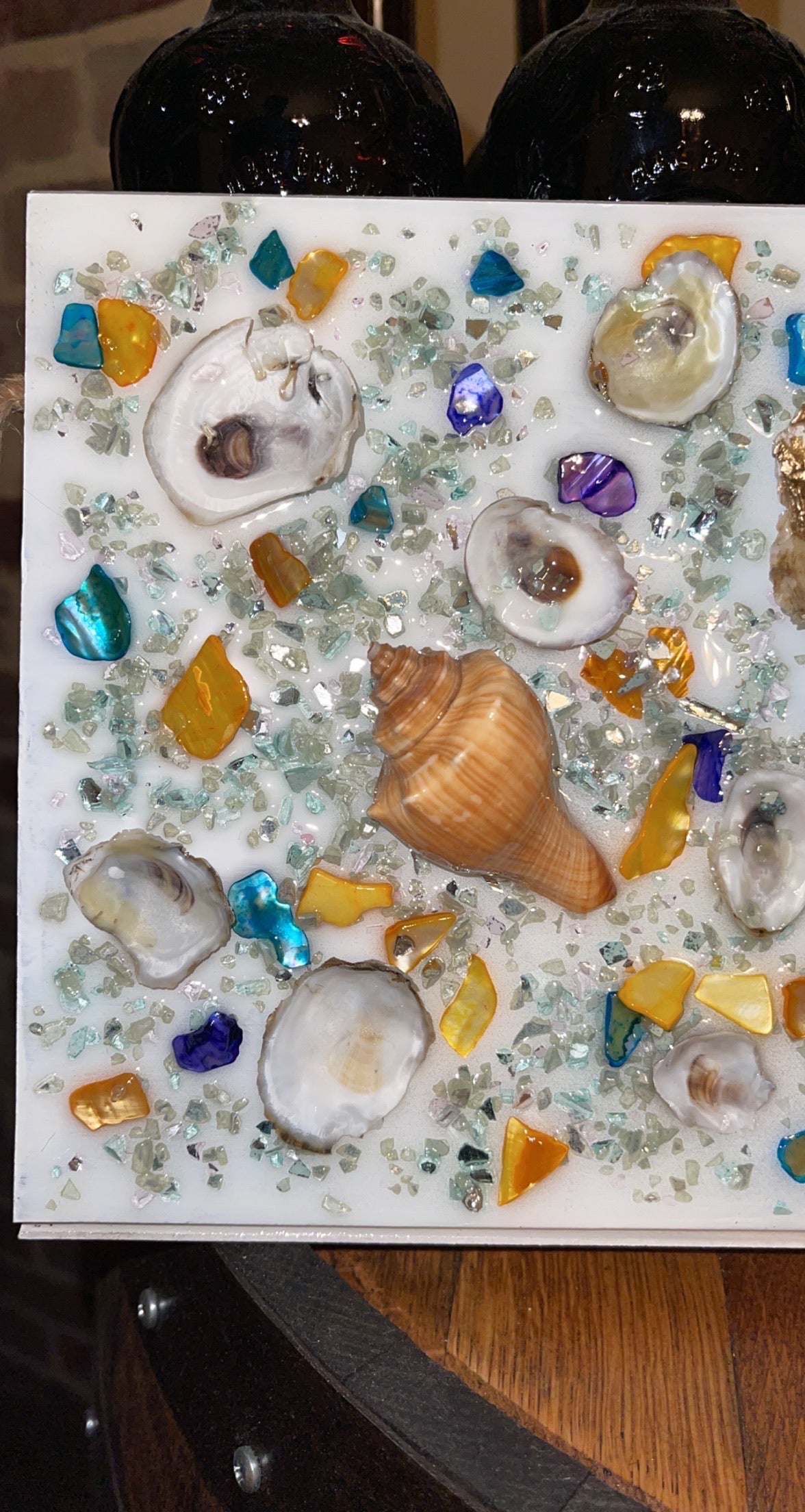 There are large and small oyster shells from along the Gulf Coast. The entire piece is safely sealed with epoxy resin.
