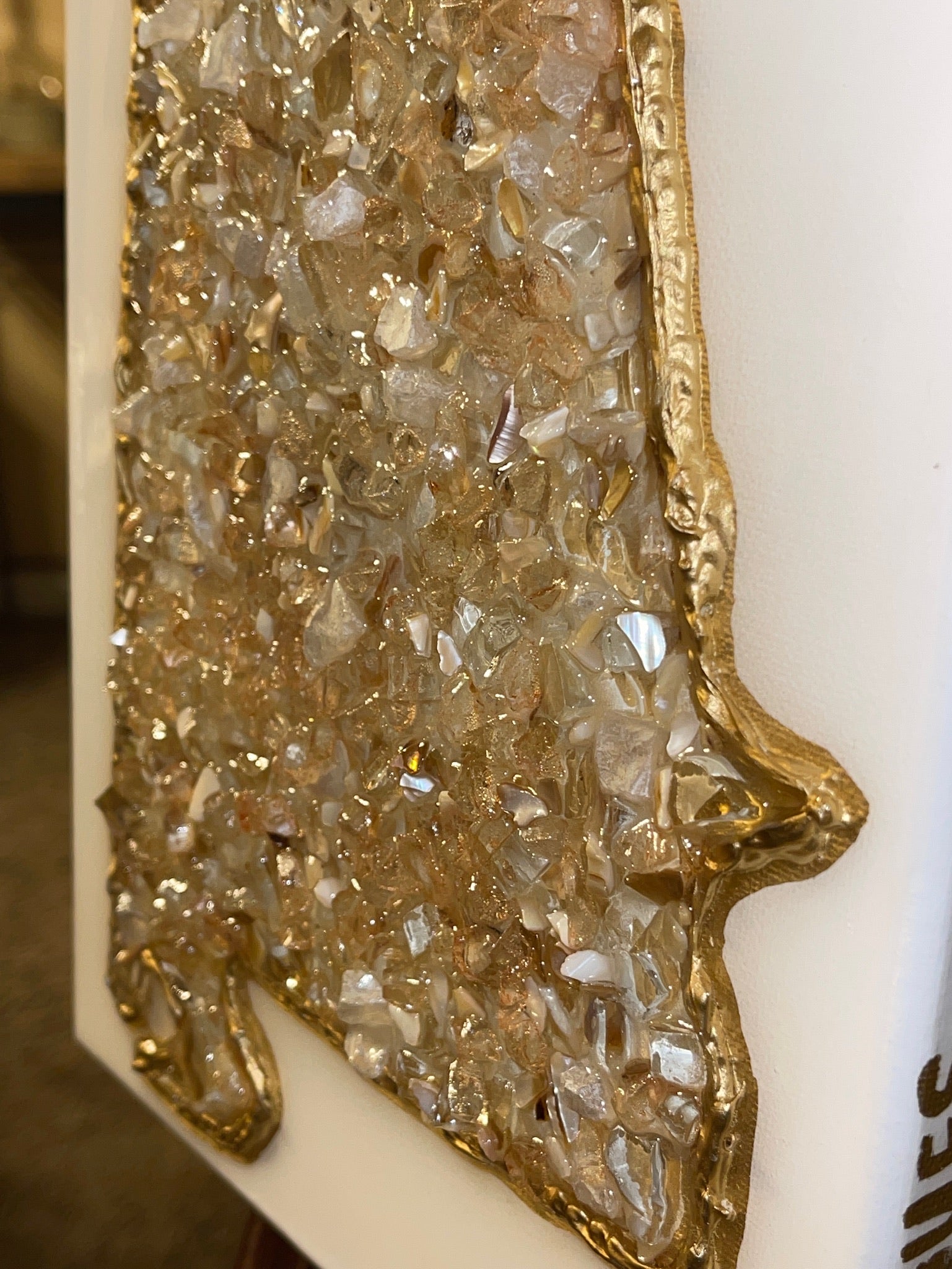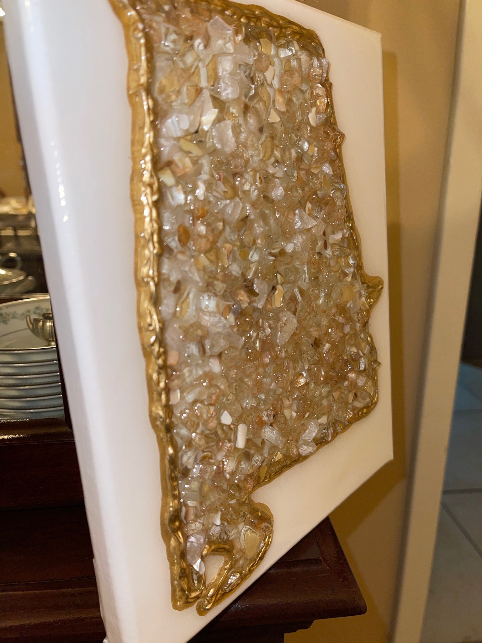 Broken glass, & sealed with epoxy resin.
