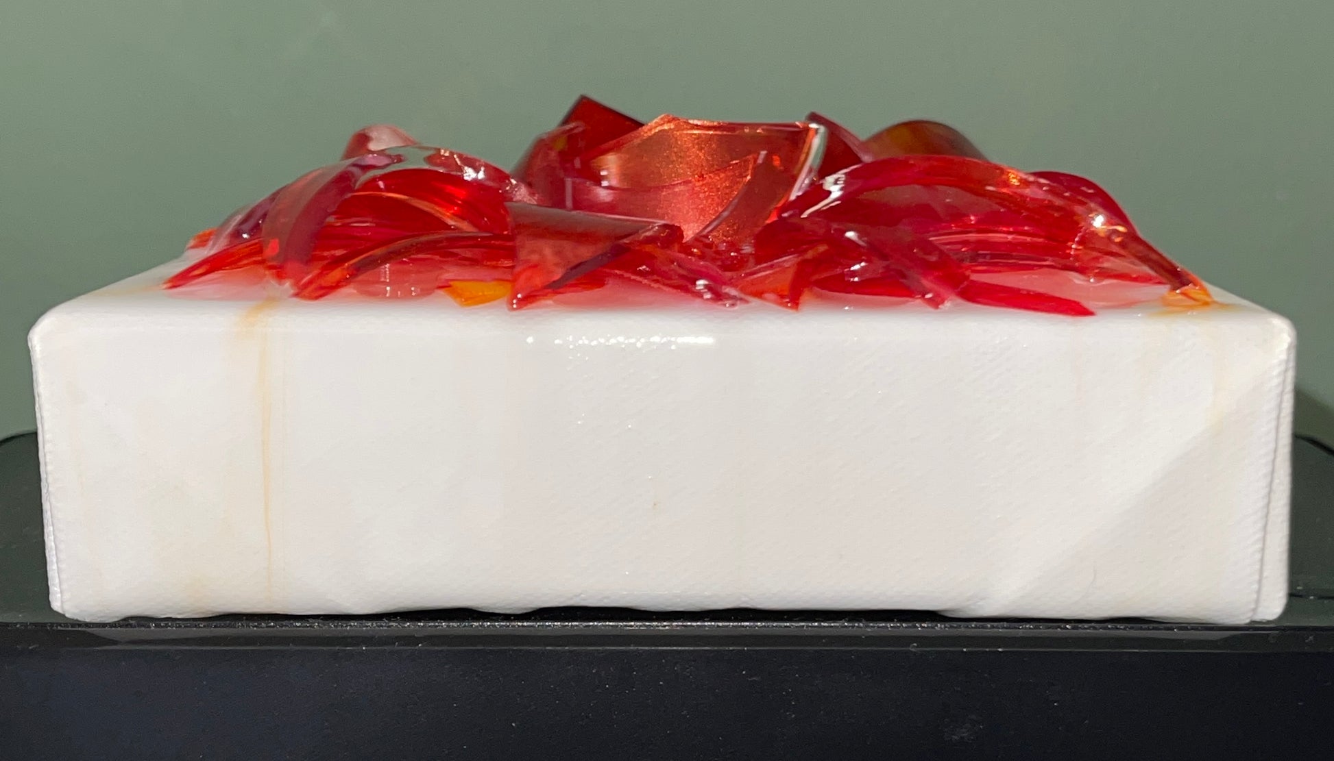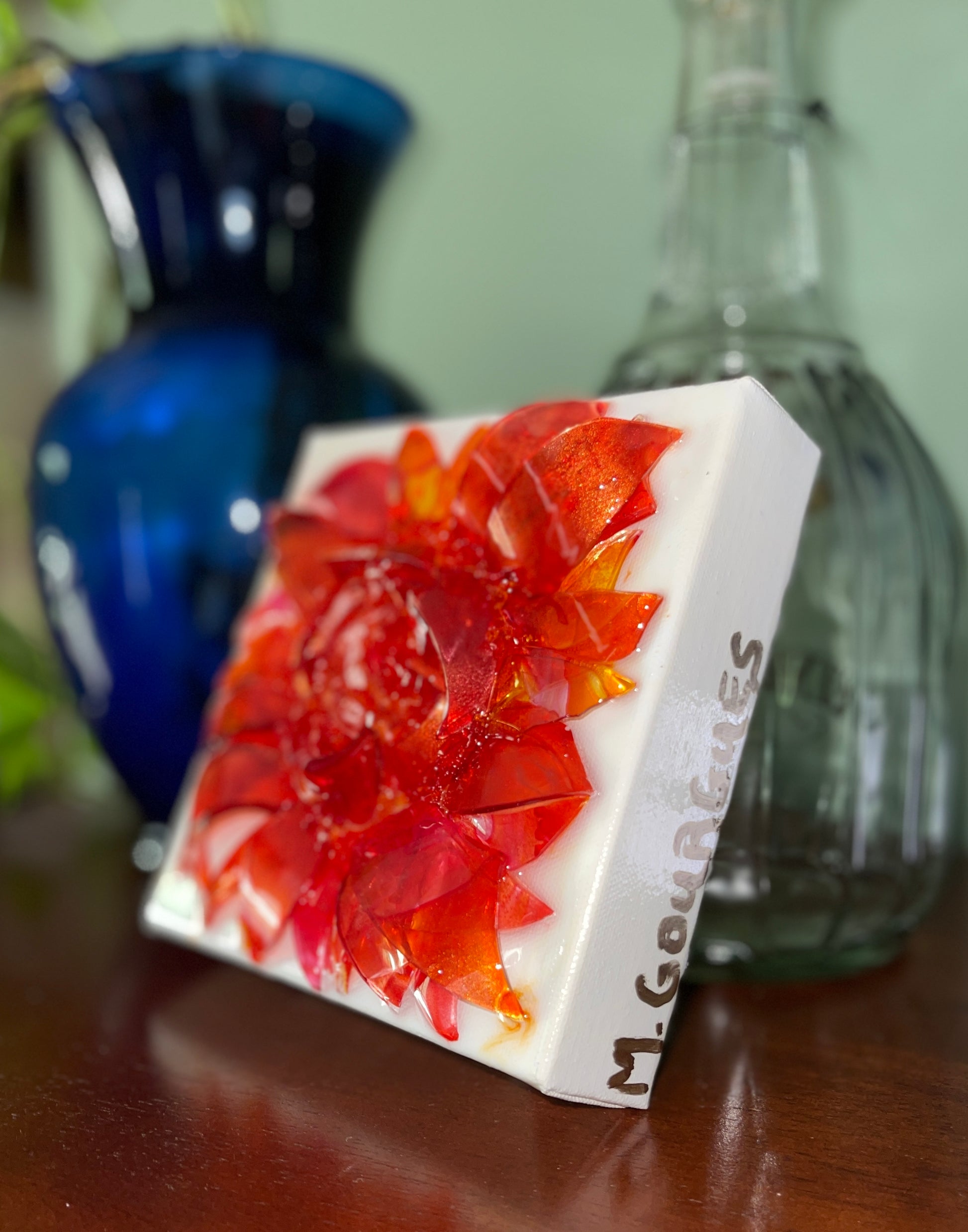 This is on an 6x6 inch canvas and it is hand painted with acrylics. There are a lot of hand cut glass details on this beautiful glass rose.