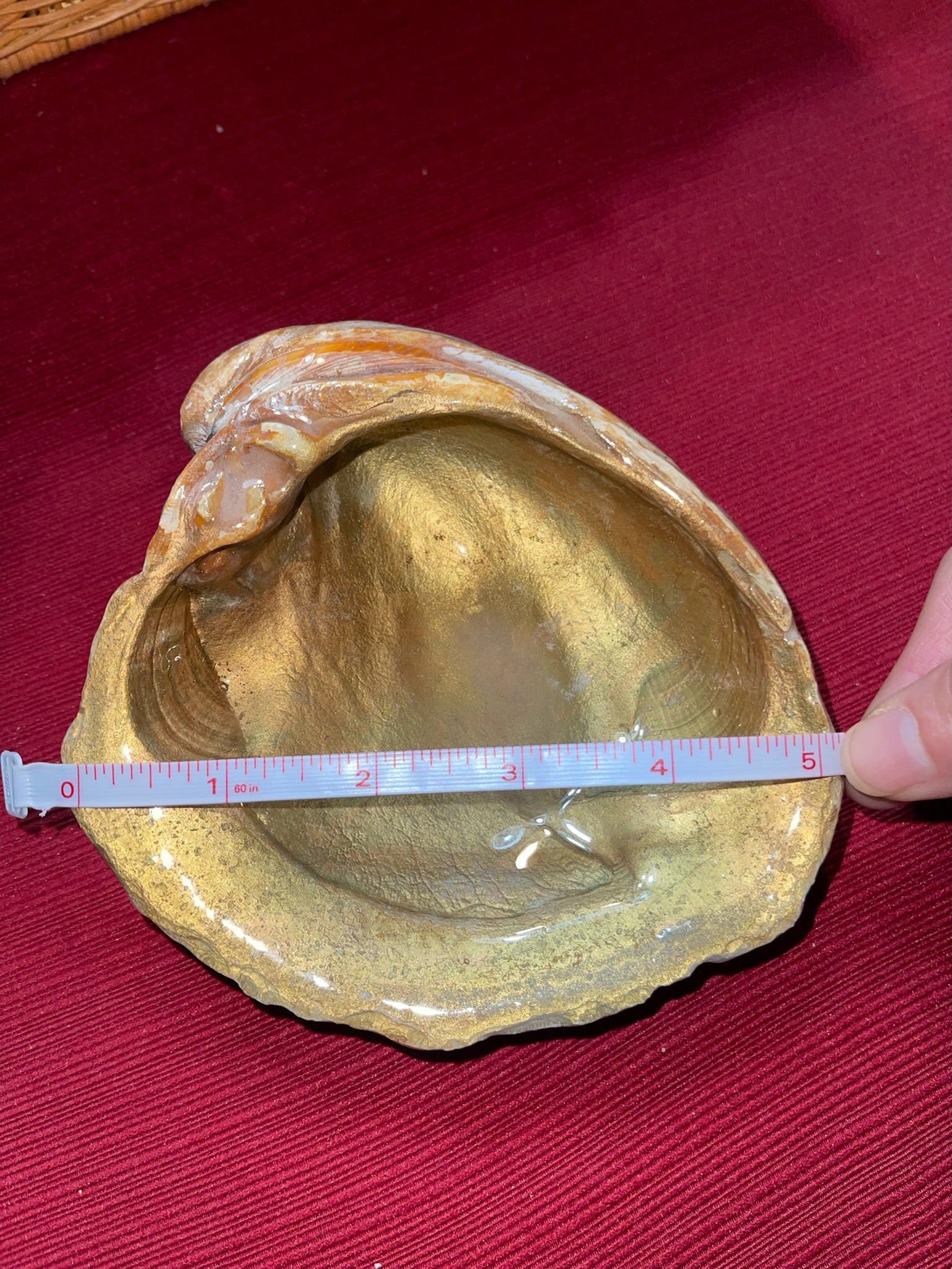 This beautiful ring or jewelry holder is a quahog seashell from Dauphin Island, AL. It measures approximate 5” across. The inside of the shell has been gold leafed and sealed with epoxy resin.