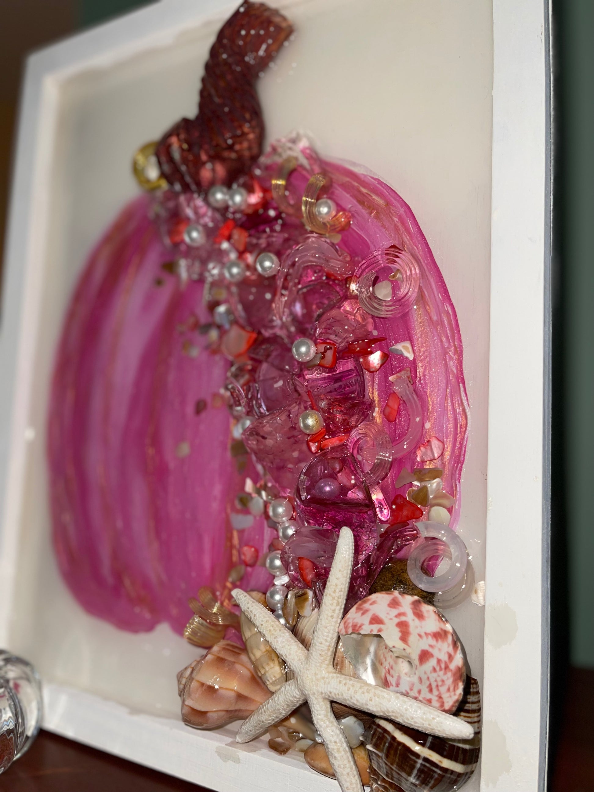This beautiful pumpkin was hand painted with acrylic paints, embellished with white glass and sealed with epoxy resin. This beauty is ready to hang in your favorite spot & it sure to make you smile.