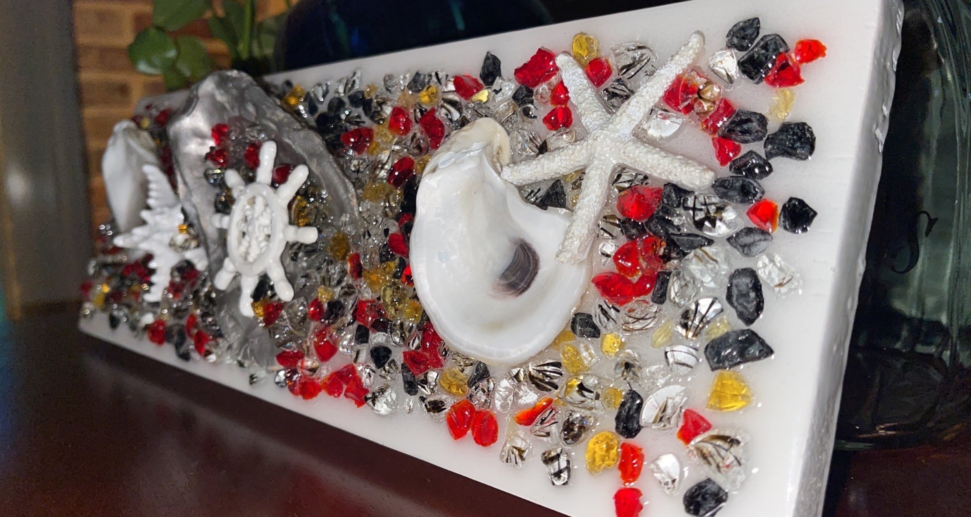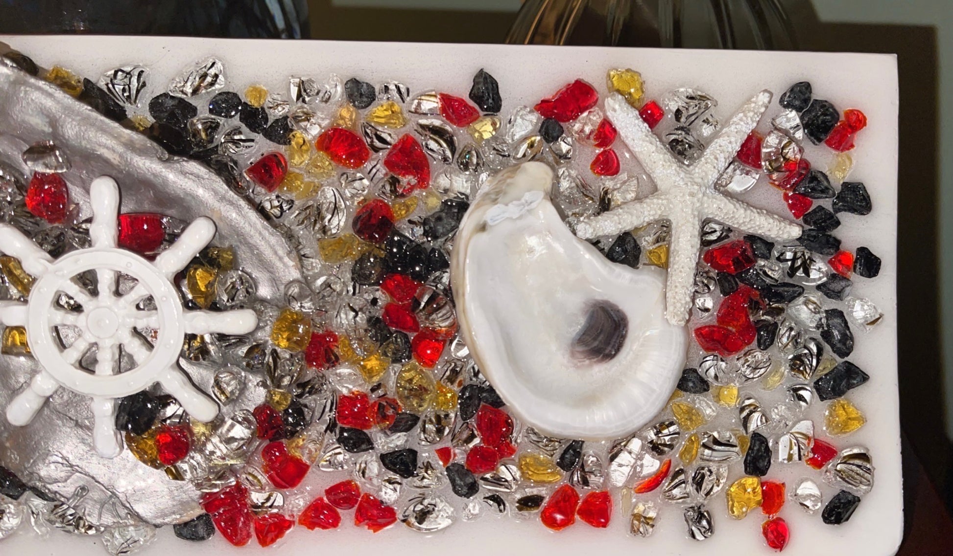 I believe this is a 6x12" wood substrate. There is a beautiful ship wheel in the center, various starfish, broken glass & oyster shells that came from along the Gulf Coast. The entire piece is safely sealed with epoxy resin.