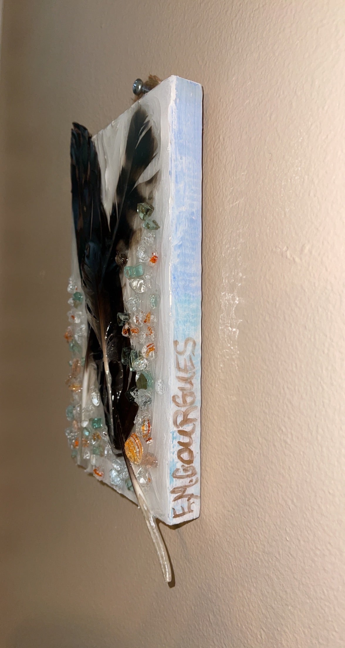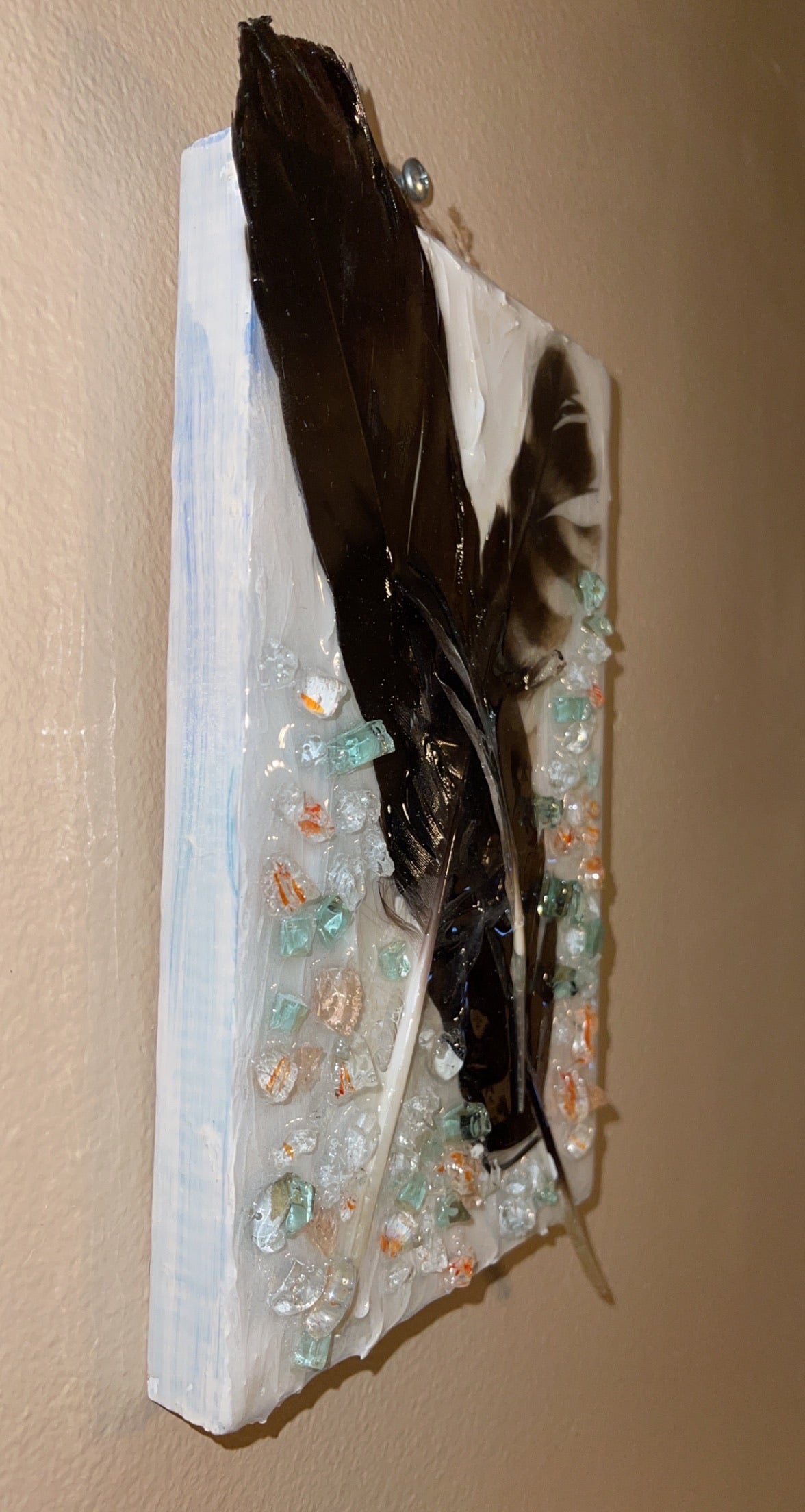 This is a ONE OF A KIND gorgeous creation! It was created with crushed glass & feathers. The entire piece is sealed with epoxy resin.