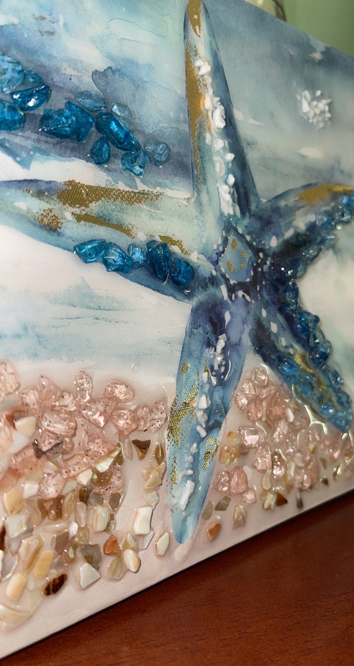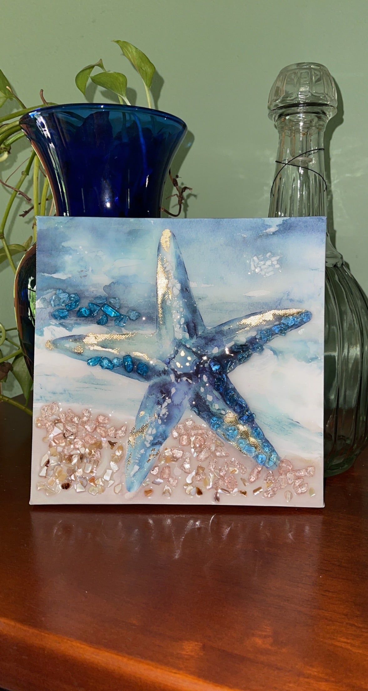 This beautiful pre-printed 8x8 inch canvas has been leveled up with hand picked & hand cut glass. It is a one of a kind Gourgues Creation that will never be made again. Sealed with epoxy resin.