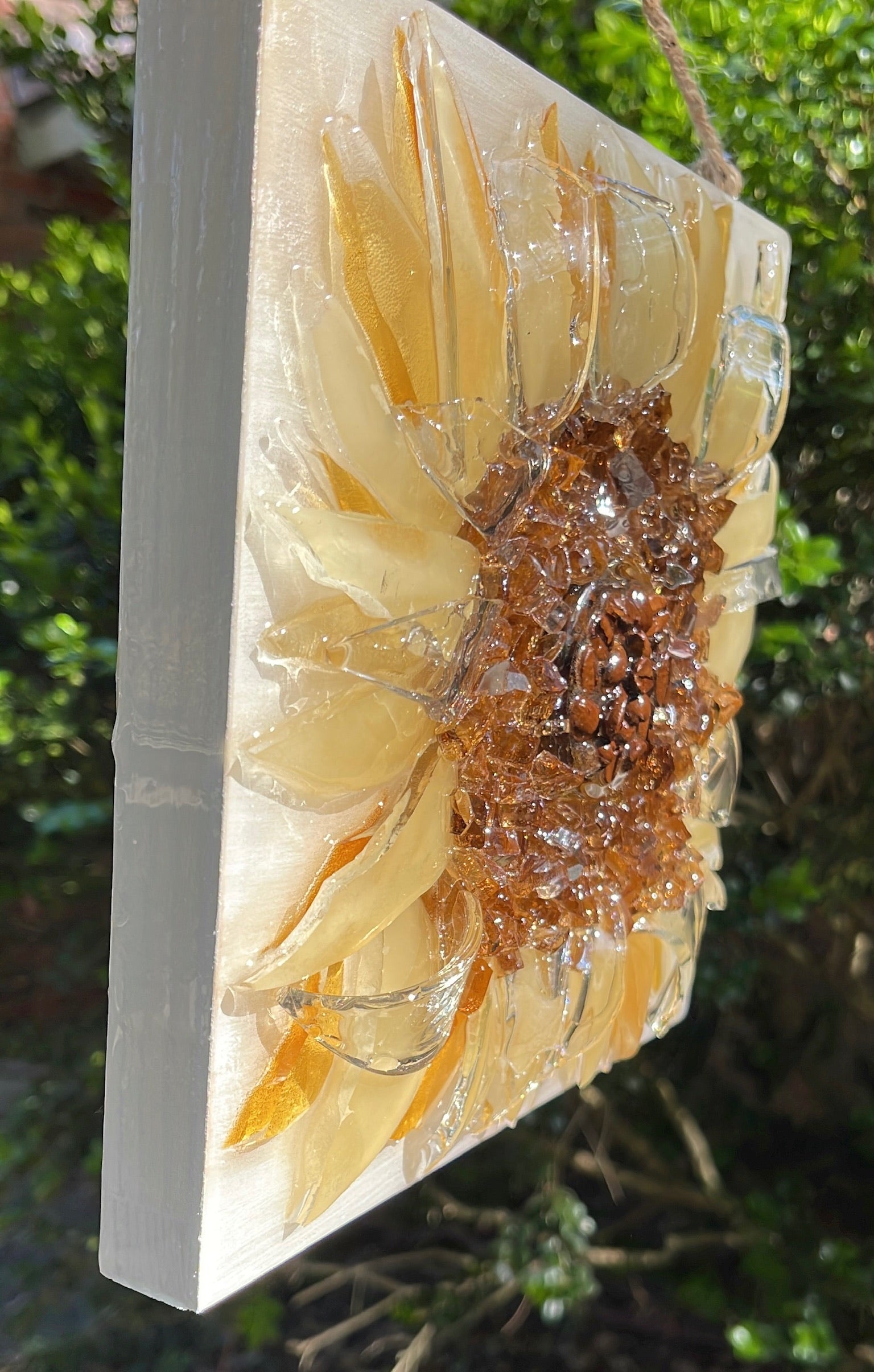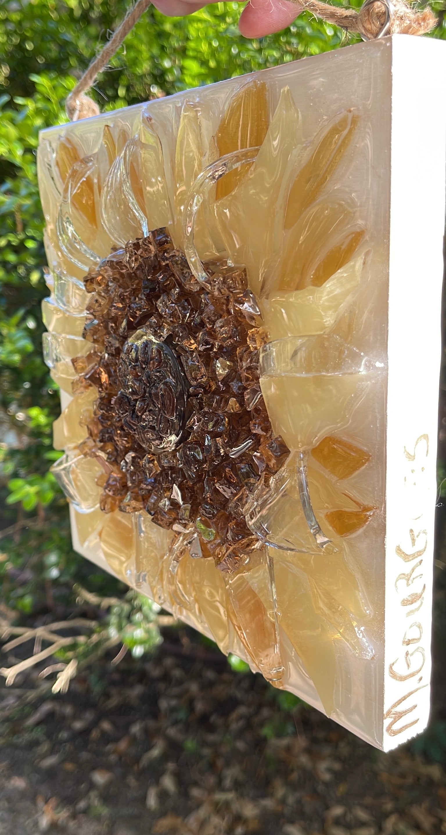 If you look really close, you will find a special accessory on this beautiful sunflower Gourgues Creation! Each piece is individually painted with acrylics, topped with hand cut glass, broken glass and sealed with epoxy resin.